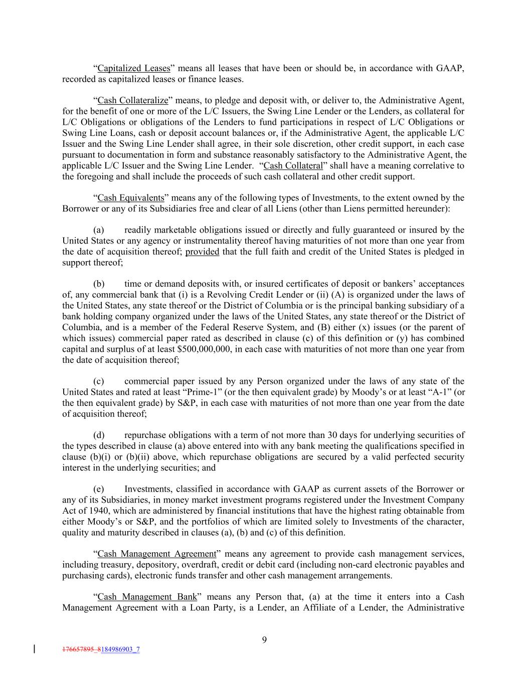 “Capitalized Leases” means all leases that have been or should be, in accordance with GAAP, recorded as capitalized leases or finance leases. “Cash Collateralize” means, to pledge and deposit with, or deliver to, the Administrative Agent, for the benefit of one or more of the L/C Issuers, the Swing Line Lender or the Lenders, as collateral for L/C Obligations or obligations of the Lenders to fund participations in respect of L/C Obligations or Swing Line Loans, cash or deposit account balances or, if the Administrative Agent, the applicable L/C Issuer and the Swing Line Lender shall agree, in their sole discretion, other credit support, in each case pursuant to documentation in form and substance reasonably satisfactory to the Administrative Agent, the applicable L/C Issuer and the Swing Line Lender. “Cash Collateral” shall have a meaning correlative to the foregoing and shall include the proceeds of such cash collateral and other credit support. “Cash Equivalents” means any of the following types of Investments, to the extent owned by the Borrower or any of its Subsidiaries free and clear of all Liens (other than Liens permitted hereunder): (a) readily marketable obligations issued or directly and fully guaranteed or insured by the United States or any agency or instrumentality thereof having maturities of not more than one year from the date of acquisition thereof; provided that the full faith and credit of the United States is pledged in support thereof; (b) time or demand deposits with, or insured certificates of deposit or bankers’ acceptances of, any commercial bank that (i) is a Revolving Credit Lender or (ii) (A) is organized under the laws of the United States, any state thereof or the District of Columbia or is the principal banking subsidiary of a bank holding company organized under the laws of the United States, any state thereof or the District of Columbia, and is a member of the Federal Reserve System, and (B) either (x) issues (or the parent of which issues) commercial paper rated as described in clause (c) of this definition or (y) has combined capital and surplus of at least $500,000,000, in each case with maturities of not more than one year from the date of acquisition thereof; (c) commercial paper issued by any Person organized under the laws of any state of the United States and rated at least “Prime-1” (or the then equivalent grade) by Moody’s or at least “A-1” (or the then equivalent grade) by S&P, in each case with maturities of not more than one year from the date of acquisition thereof; (d) repurchase obligations with a term of not more than 30 days for underlying securities of the types described in clause (a) above entered into with any bank meeting the qualifications specified in clause (b)(i) or (b)(ii) above, which repurchase obligations are secured by a valid perfected security interest in the underlying securities; and (e) Investments, classified in accordance with GAAP as current assets of the Borrower or any of its Subsidiaries, in money market investment programs registered under the Investment Company Act of 1940, which are administered by financial institutions that have the highest rating obtainable from either Moody’s or S&P, and the portfolios of which are limited solely to Investments of the character, quality and maturity described in clauses (a), (b) and (c) of this definition. “Cash Management Agreement” means any agreement to provide cash management services, including treasury, depository, overdraft, credit or debit card (including non-card electronic payables and purchasing cards), electronic funds transfer and other cash management arrangements. “Cash Management Bank” means any Person that, (a) at the time it enters into a Cash Management Agreement with a Loan Party, is a Lender, an Affiliate of a Lender, the Administrative 9 176657895_8184986903_7