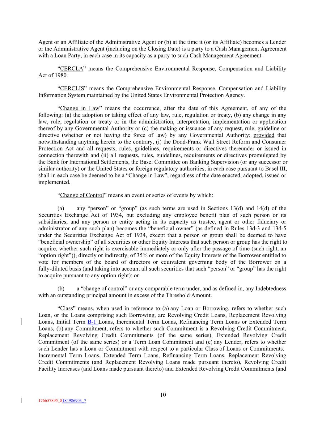 Agent or an Affiliate of the Administrative Agent or (b) at the time it (or its Affiliate) becomes a Lender or the Administrative Agent (including on the Closing Date) is a party to a Cash Management Agreement with a Loan Party, in each case in its capacity as a party to such Cash Management Agreement. “CERCLA” means the Comprehensive Environmental Response, Compensation and Liability Act of 1980. “CERCLIS” means the Comprehensive Environmental Response, Compensation and Liability Information System maintained by the United States Environmental Protection Agency. “Change in Law” means the occurrence, after the date of this Agreement, of any of the following: (a) the adoption or taking effect of any law, rule, regulation or treaty, (b) any change in any law, rule, regulation or treaty or in the administration, interpretation, implementation or application thereof by any Governmental Authority or (c) the making or issuance of any request, rule, guideline or directive (whether or not having the force of law) by any Governmental Authority; provided that notwithstanding anything herein to the contrary, (i) the Dodd-Frank Wall Street Reform and Consumer Protection Act and all requests, rules, guidelines, requirements or directives thereunder or issued in connection therewith and (ii) all requests, rules, guidelines, requirements or directives promulgated by the Bank for International Settlements, the Basel Committee on Banking Supervision (or any successor or similar authority) or the United States or foreign regulatory authorities, in each case pursuant to Basel III, shall in each case be deemed to be a “Change in Law”, regardless of the date enacted, adopted, issued or implemented. “Change of Control” means an event or series of events by which: (a) any “person” or “group” (as such terms are used in Sections 13(d) and 14(d) of the Securities Exchange Act of 1934, but excluding any employee benefit plan of such person or its subsidiaries, and any person or entity acting in its capacity as trustee, agent or other fiduciary or administrator of any such plan) becomes the “beneficial owner” (as defined in Rules 13d-3 and 13d-5 under the Securities Exchange Act of 1934, except that a person or group shall be deemed to have “beneficial ownership” of all securities or other Equity Interests that such person or group has the right to acquire, whether such right is exercisable immediately or only after the passage of time (such right, an “option right”)), directly or indirectly, of 35% or more of the Equity Interests of the Borrower entitled to vote for members of the board of directors or equivalent governing body of the Borrower on a fully-diluted basis (and taking into account all such securities that such “person” or “group” has the right to acquire pursuant to any option right); or (b) a “change of control” or any comparable term under, and as defined in, any Indebtedness with an outstanding principal amount in excess of the Threshold Amount. “Class” means, when used in reference to (a) any Loan or Borrowing, refers to whether such Loan, or the Loans comprising such Borrowing, are Revolving Credit Loans, Replacement Revolving Loans, Initial Term B-1 Loans, Incremental Term Loans, Refinancing Term Loans or Extended Term Loans, (b) any Commitment, refers to whether such Commitment is a Revolving Credit Commitment, Replacement Revolving Credit Commitments (of the same series), Extended Revolving Credit Commitment (of the same series) or a Term Loan Commitment and (c) any Lender, refers to whether such Lender has a Loan or Commitment with respect to a particular Class of Loans or Commitments. Incremental Term Loans, Extended Term Loans, Refinancing Term Loans, Replacement Revolving Credit Commitments (and Replacement Revolving Loans made pursuant thereto), Revolving Credit Facility Increases (and Loans made pursuant thereto) and Extended Revolving Credit Commitments (and 10 176657895_8184986903_7