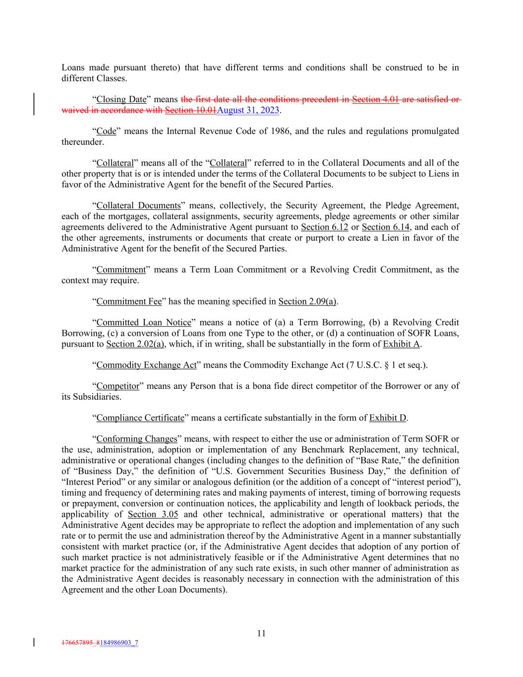 Loans made pursuant thereto) that have different terms and conditions shall be construed to be in different Classes. “Closing Date” means the first date all the conditions precedent in Section 4.01 are satisfied or waived in accordance with Section 10.01August 31, 2023. “Code” means the Internal Revenue Code of 1986, and the rules and regulations promulgated thereunder. “Collateral” means all of the “Collateral” referred to in the Collateral Documents and all of the other property that is or is intended under the terms of the Collateral Documents to be subject to Liens in favor of the Administrative Agent for the benefit of the Secured Parties. “Collateral Documents” means, collectively, the Security Agreement, the Pledge Agreement, each of the mortgages, collateral assignments, security agreements, pledge agreements or other similar agreements delivered to the Administrative Agent pursuant to Section 6.12 or Section 6.14, and each of the other agreements, instruments or documents that create or purport to create a Lien in favor of the Administrative Agent for the benefit of the Secured Parties. “Commitment” means a Term Loan Commitment or a Revolving Credit Commitment, as the context may require. “Commitment Fee” has the meaning specified in Section 2.09(a). “Committed Loan Notice” means a notice of (a) a Term Borrowing, (b) a Revolving Credit Borrowing, (c) a conversion of Loans from one Type to the other, or (d) a continuation of SOFR Loans, pursuant to Section 2.02(a), which, if in writing, shall be substantially in the form of Exhibit A. “Commodity Exchange Act” means the Commodity Exchange Act (7 U.S.C. § 1 et seq.). “Competitor” means any Person that is a bona fide direct competitor of the Borrower or any of its Subsidiaries. “Compliance Certificate” means a certificate substantially in the form of Exhibit D. “Conforming Changes” means, with respect to either the use or administration of Term SOFR or the use, administration, adoption or implementation of any Benchmark Replacement, any technical, administrative or operational changes (including changes to the definition of “Base Rate,” the definition of “Business Day,” the definition of “U.S. Government Securities Business Day,” the definition of “Interest Period” or any similar or analogous definition (or the addition of a concept of “interest period”), timing and frequency of determining rates and making payments of interest, timing of borrowing requests or prepayment, conversion or continuation notices, the applicability and length of lookback periods, the applicability of Section 3.05 and other technical, administrative or operational matters) that the Administrative Agent decides may be appropriate to reflect the adoption and implementation of any such rate or to permit the use and administration thereof by the Administrative Agent in a manner substantially consistent with market practice (or, if the Administrative Agent decides that adoption of any portion of such market practice is not administratively feasible or if the Administrative Agent determines that no market practice for the administration of any such rate exists, in such other manner of administration as the Administrative Agent decides is reasonably necessary in connection with the administration of this Agreement and the other Loan Documents). 11 176657895_8184986903_7