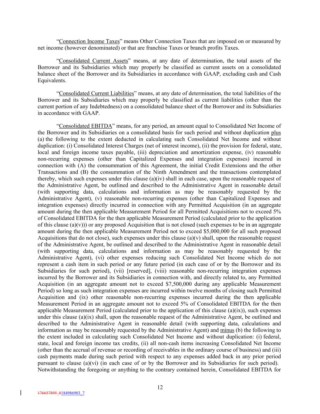 “Connection Income Taxes” means Other Connection Taxes that are imposed on or measured by net income (however denominated) or that are franchise Taxes or branch profits Taxes. “Consolidated Current Assets” means, at any date of determination, the total assets of the Borrower and its Subsidiaries which may properly be classified as current assets on a consolidated balance sheet of the Borrower and its Subsidiaries in accordance with GAAP, excluding cash and Cash Equivalents. “Consolidated Current Liabilities” means, at any date of determination, the total liabilities of the Borrower and its Subsidiaries which may properly be classified as current liabilities (other than the current portion of any Indebtedness) on a consolidated balance sheet of the Borrower and its Subsidiaries in accordance with GAAP. “Consolidated EBITDA” means, for any period, an amount equal to Consolidated Net Income of the Borrower and its Subsidiaries on a consolidated basis for such period and without duplication plus (a) the following to the extent deducted in calculating such Consolidated Net Income and without duplication: (i) Consolidated Interest Charges (net of interest income), (ii) the provision for federal, state, local and foreign income taxes payable, (iii) depreciation and amortization expense, (iv) reasonable non-recurring expenses (other than Capitalized Expenses and integration expenses) incurred in connection with (A) the consummation of this Agreement, the initial Credit Extensions and the other Transactions and (B) the consummation of the Ninth Amendment and the transactions contemplated thereby, which such expenses under this clause (a)(iv) shall in each case, upon the reasonable request of the Administrative Agent, be outlined and described to the Administrative Agent in reasonable detail (with supporting data, calculations and information as may be reasonably requested by the Administrative Agent), (v) reasonable non-recurring expenses (other than Capitalized Expenses and integration expenses) directly incurred in connection with any Permitted Acquisition (in an aggregate amount during the then applicable Measurement Period for all Permitted Acquisitions not to exceed 5% of Consolidated EBITDA for the then applicable Measurement Period (calculated prior to the application of this clause (a)(v))) or any proposed Acquisition that is not closed (such expenses to be in an aggregate amount during the then applicable Measurement Period not to exceed $5,000,000 for all such proposed Acquisitions that do not close), such expenses under this clause (a)(v) shall, upon the reasonable request of the Administrative Agent, be outlined and described to the Administrative Agent in reasonable detail (with supporting data, calculations and information as may be reasonably requested by the Administrative Agent), (vi) other expenses reducing such Consolidated Net Income which do not represent a cash item in such period or any future period (in each case of or by the Borrower and its Subsidiaries for such period), (vii) [reserved], (viii) reasonable non-recurring integration expenses incurred by the Borrower and its Subsidiaries in connection with, and directly related to, any Permitted Acquisition (in an aggregate amount not to exceed $7,500,000 during any applicable Measurement Period) so long as such integration expenses are incurred within twelve months of closing such Permitted Acquisition and (ix) other reasonable non-recurring expenses incurred during the then applicable Measurement Period in an aggregate amount not to exceed 5% of Consolidated EBITDA for the then applicable Measurement Period (calculated prior to the application of this clause (a)(ix)), such expenses under this clause (a)(ix) shall, upon the reasonable request of the Administrative Agent, be outlined and described to the Administrative Agent in reasonable detail (with supporting data, calculations and information as may be reasonably requested by the Administrative Agent) and minus (b) the following to the extent included in calculating such Consolidated Net Income and without duplication: (i) federal, state, local and foreign income tax credits, (ii) all non-cash items increasing Consolidated Net Income (other than the accrual of revenue or recording of receivables in the ordinary course of business) and (iii) cash payments made during such period with respect to any expenses added back in any prior period pursuant to clause (a)(vi) (in each case of or by the Borrower and its Subsidiaries for such period). Notwithstanding the foregoing or anything to the contrary contained herein, Consolidated EBITDA for 12 176657895_8184986903_7