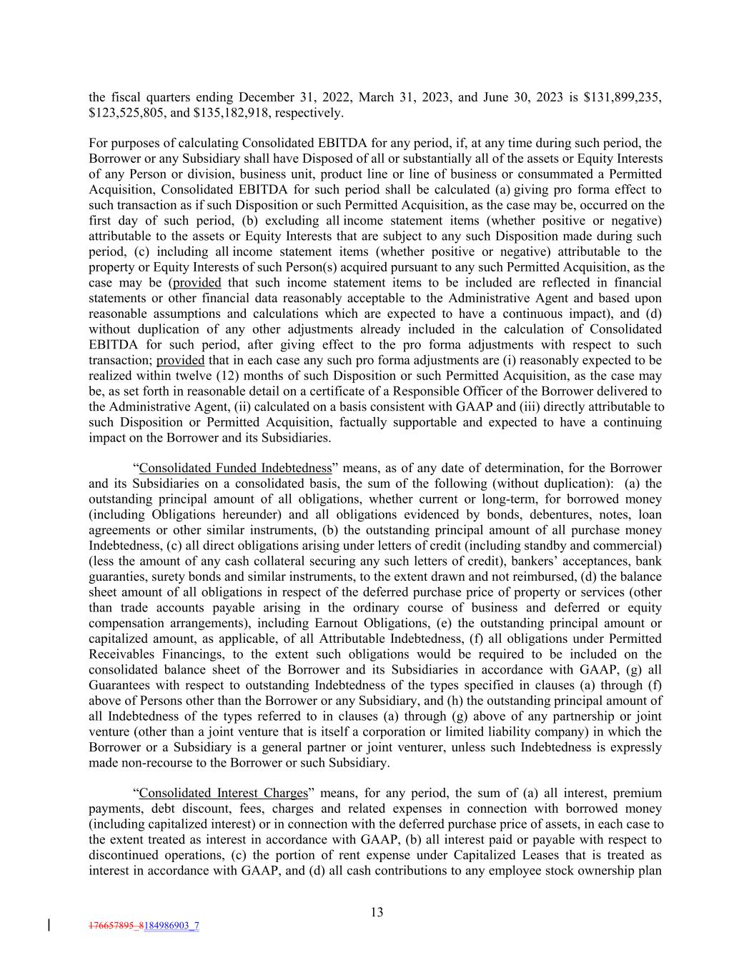 the fiscal quarters ending December 31, 2022, March 31, 2023, and June 30, 2023 is $131,899,235, $123,525,805, and $135,182,918, respectively. For purposes of calculating Consolidated EBITDA for any period, if, at any time during such period, the Borrower or any Subsidiary shall have Disposed of all or substantially all of the assets or Equity Interests of any Person or division, business unit, product line or line of business or consummated a Permitted Acquisition, Consolidated EBITDA for such period shall be calculated (a) giving pro forma effect to such transaction as if such Disposition or such Permitted Acquisition, as the case may be, occurred on the first day of such period, (b) excluding all income statement items (whether positive or negative) attributable to the assets or Equity Interests that are subject to any such Disposition made during such period, (c) including all income statement items (whether positive or negative) attributable to the property or Equity Interests of such Person(s) acquired pursuant to any such Permitted Acquisition, as the case may be (provided that such income statement items to be included are reflected in financial statements or other financial data reasonably acceptable to the Administrative Agent and based upon reasonable assumptions and calculations which are expected to have a continuous impact), and (d) without duplication of any other adjustments already included in the calculation of Consolidated EBITDA for such period, after giving effect to the pro forma adjustments with respect to such transaction; provided that in each case any such pro forma adjustments are (i) reasonably expected to be realized within twelve (12) months of such Disposition or such Permitted Acquisition, as the case may be, as set forth in reasonable detail on a certificate of a Responsible Officer of the Borrower delivered to the Administrative Agent, (ii) calculated on a basis consistent with GAAP and (iii) directly attributable to such Disposition or Permitted Acquisition, factually supportable and expected to have a continuing impact on the Borrower and its Subsidiaries. “Consolidated Funded Indebtedness” means, as of any date of determination, for the Borrower and its Subsidiaries on a consolidated basis, the sum of the following (without duplication): (a) the outstanding principal amount of all obligations, whether current or long-term, for borrowed money (including Obligations hereunder) and all obligations evidenced by bonds, debentures, notes, loan agreements or other similar instruments, (b) the outstanding principal amount of all purchase money Indebtedness, (c) all direct obligations arising under letters of credit (including standby and commercial) (less the amount of any cash collateral securing any such letters of credit), bankers’ acceptances, bank guaranties, surety bonds and similar instruments, to the extent drawn and not reimbursed, (d) the balance sheet amount of all obligations in respect of the deferred purchase price of property or services (other than trade accounts payable arising in the ordinary course of business and deferred or equity compensation arrangements), including Earnout Obligations, (e) the outstanding principal amount or capitalized amount, as applicable, of all Attributable Indebtedness, (f) all obligations under Permitted Receivables Financings, to the extent such obligations would be required to be included on the consolidated balance sheet of the Borrower and its Subsidiaries in accordance with GAAP, (g) all Guarantees with respect to outstanding Indebtedness of the types specified in clauses (a) through (f) above of Persons other than the Borrower or any Subsidiary, and (h) the outstanding principal amount of all Indebtedness of the types referred to in clauses (a) through (g) above of any partnership or joint venture (other than a joint venture that is itself a corporation or limited liability company) in which the Borrower or a Subsidiary is a general partner or joint venturer, unless such Indebtedness is expressly made non-recourse to the Borrower or such Subsidiary. “Consolidated Interest Charges” means, for any period, the sum of (a) all interest, premium payments, debt discount, fees, charges and related expenses in connection with borrowed money (including capitalized interest) or in connection with the deferred purchase price of assets, in each case to the extent treated as interest in accordance with GAAP, (b) all interest paid or payable with respect to discontinued operations, (c) the portion of rent expense under Capitalized Leases that is treated as interest in accordance with GAAP, and (d) all cash contributions to any employee stock ownership plan 13 176657895_8184986903_7