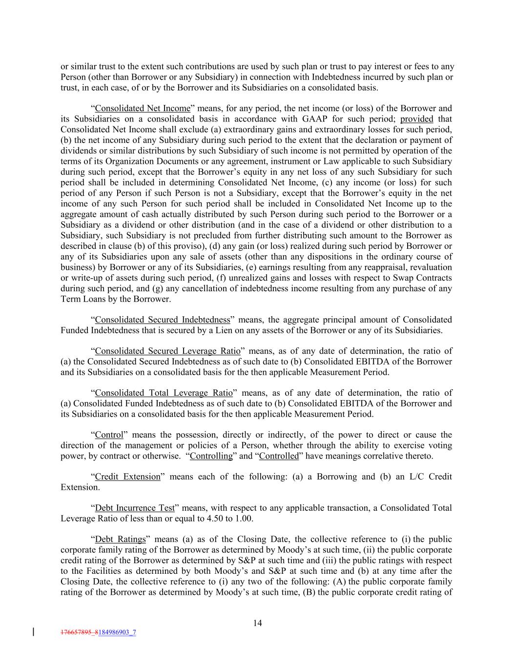 or similar trust to the extent such contributions are used by such plan or trust to pay interest or fees to any Person (other than Borrower or any Subsidiary) in connection with Indebtedness incurred by such plan or trust, in each case, of or by the Borrower and its Subsidiaries on a consolidated basis. “Consolidated Net Income” means, for any period, the net income (or loss) of the Borrower and its Subsidiaries on a consolidated basis in accordance with GAAP for such period; provided that Consolidated Net Income shall exclude (a) extraordinary gains and extraordinary losses for such period, (b) the net income of any Subsidiary during such period to the extent that the declaration or payment of dividends or similar distributions by such Subsidiary of such income is not permitted by operation of the terms of its Organization Documents or any agreement, instrument or Law applicable to such Subsidiary during such period, except that the Borrower’s equity in any net loss of any such Subsidiary for such period shall be included in determining Consolidated Net Income, (c) any income (or loss) for such period of any Person if such Person is not a Subsidiary, except that the Borrower’s equity in the net income of any such Person for such period shall be included in Consolidated Net Income up to the aggregate amount of cash actually distributed by such Person during such period to the Borrower or a Subsidiary as a dividend or other distribution (and in the case of a dividend or other distribution to a Subsidiary, such Subsidiary is not precluded from further distributing such amount to the Borrower as described in clause (b) of this proviso), (d) any gain (or loss) realized during such period by Borrower or any of its Subsidiaries upon any sale of assets (other than any dispositions in the ordinary course of business) by Borrower or any of its Subsidiaries, (e) earnings resulting from any reappraisal, revaluation or write-up of assets during such period, (f) unrealized gains and losses with respect to Swap Contracts during such period, and (g) any cancellation of indebtedness income resulting from any purchase of any Term Loans by the Borrower. “Consolidated Secured Indebtedness” means, the aggregate principal amount of Consolidated Funded Indebtedness that is secured by a Lien on any assets of the Borrower or any of its Subsidiaries. “Consolidated Secured Leverage Ratio” means, as of any date of determination, the ratio of (a) the Consolidated Secured Indebtedness as of such date to (b) Consolidated EBITDA of the Borrower and its Subsidiaries on a consolidated basis for the then applicable Measurement Period. “Consolidated Total Leverage Ratio” means, as of any date of determination, the ratio of (a) Consolidated Funded Indebtedness as of such date to (b) Consolidated EBITDA of the Borrower and its Subsidiaries on a consolidated basis for the then applicable Measurement Period. “Control” means the possession, directly or indirectly, of the power to direct or cause the direction of the management or policies of a Person, whether through the ability to exercise voting power, by contract or otherwise. “Controlling” and “Controlled” have meanings correlative thereto. “Credit Extension” means each of the following: (a) a Borrowing and (b) an L/C Credit Extension. “Debt Incurrence Test” means, with respect to any applicable transaction, a Consolidated Total Leverage Ratio of less than or equal to 4.50 to 1.00. “Debt Ratings” means (a) as of the Closing Date, the collective reference to (i) the public corporate family rating of the Borrower as determined by Moody’s at such time, (ii) the public corporate credit rating of the Borrower as determined by S&P at such time and (iii) the public ratings with respect to the Facilities as determined by both Moody’s and S&P at such time and (b) at any time after the Closing Date, the collective reference to (i) any two of the following: (A) the public corporate family rating of the Borrower as determined by Moody’s at such time, (B) the public corporate credit rating of 14 176657895_8184986903_7