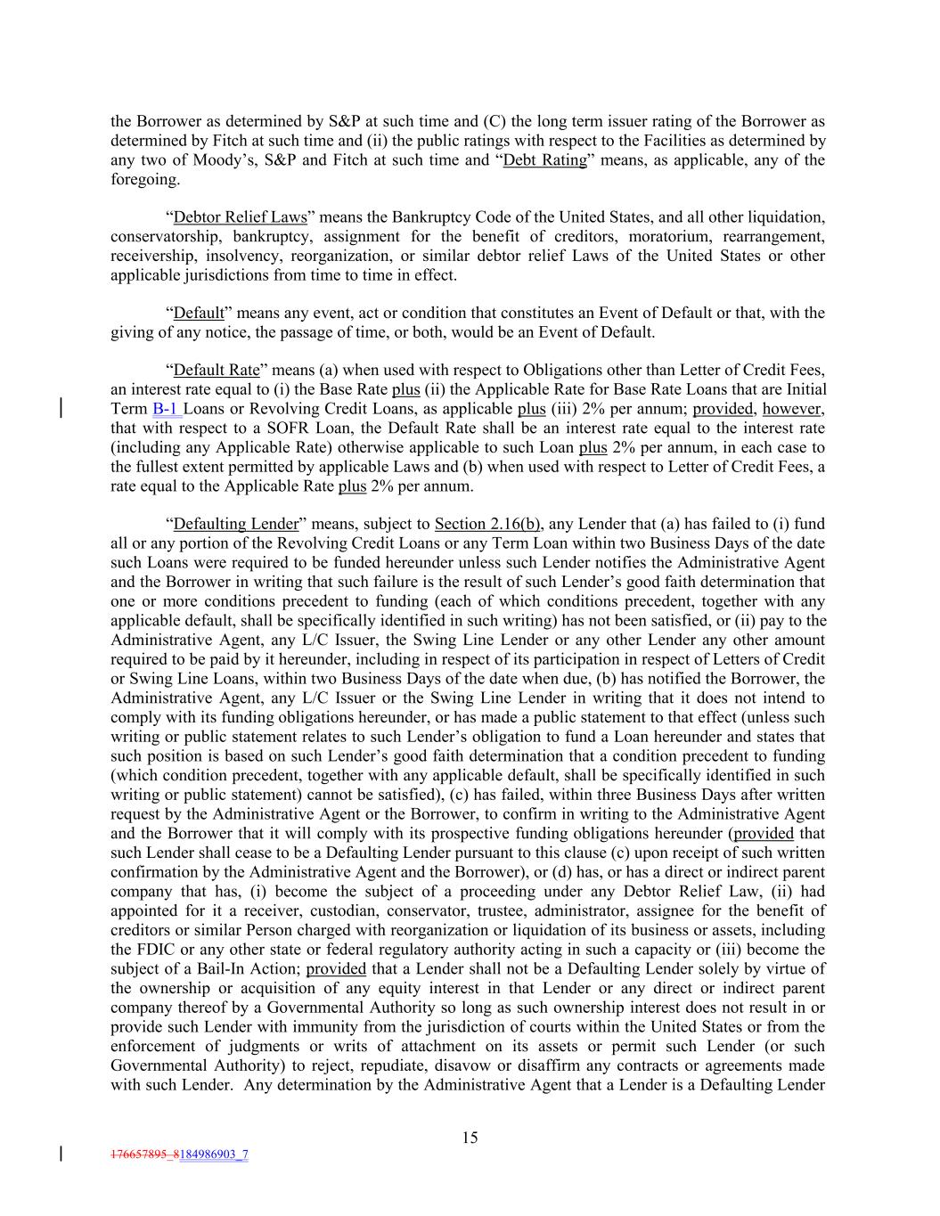 the Borrower as determined by S&P at such time and (C) the long term issuer rating of the Borrower as determined by Fitch at such time and (ii) the public ratings with respect to the Facilities as determined by any two of Moody’s, S&P and Fitch at such time and “Debt Rating” means, as applicable, any of the foregoing. “Debtor Relief Laws” means the Bankruptcy Code of the United States, and all other liquidation, conservatorship, bankruptcy, assignment for the benefit of creditors, moratorium, rearrangement, receivership, insolvency, reorganization, or similar debtor relief Laws of the United States or other applicable jurisdictions from time to time in effect. “Default” means any event, act or condition that constitutes an Event of Default or that, with the giving of any notice, the passage of time, or both, would be an Event of Default. “Default Rate” means (a) when used with respect to Obligations other than Letter of Credit Fees, an interest rate equal to (i) the Base Rate plus (ii) the Applicable Rate for Base Rate Loans that are Initial Term B-1 Loans or Revolving Credit Loans, as applicable plus (iii) 2% per annum; provided, however, that with respect to a SOFR Loan, the Default Rate shall be an interest rate equal to the interest rate (including any Applicable Rate) otherwise applicable to such Loan plus 2% per annum, in each case to the fullest extent permitted by applicable Laws and (b) when used with respect to Letter of Credit Fees, a rate equal to the Applicable Rate plus 2% per annum. “Defaulting Lender” means, subject to Section 2.16(b), any Lender that (a) has failed to (i) fund all or any portion of the Revolving Credit Loans or any Term Loan within two Business Days of the date such Loans were required to be funded hereunder unless such Lender notifies the Administrative Agent and the Borrower in writing that such failure is the result of such Lender’s good faith determination that one or more conditions precedent to funding (each of which conditions precedent, together with any applicable default, shall be specifically identified in such writing) has not been satisfied, or (ii) pay to the Administrative Agent, any L/C Issuer, the Swing Line Lender or any other Lender any other amount required to be paid by it hereunder, including in respect of its participation in respect of Letters of Credit or Swing Line Loans, within two Business Days of the date when due, (b) has notified the Borrower, the Administrative Agent, any L/C Issuer or the Swing Line Lender in writing that it does not intend to comply with its funding obligations hereunder, or has made a public statement to that effect (unless such writing or public statement relates to such Lender’s obligation to fund a Loan hereunder and states that such position is based on such Lender’s good faith determination that a condition precedent to funding (which condition precedent, together with any applicable default, shall be specifically identified in such writing or public statement) cannot be satisfied), (c) has failed, within three Business Days after written request by the Administrative Agent or the Borrower, to confirm in writing to the Administrative Agent and the Borrower that it will comply with its prospective funding obligations hereunder (provided that such Lender shall cease to be a Defaulting Lender pursuant to this clause (c) upon receipt of such written confirmation by the Administrative Agent and the Borrower), or (d) has, or has a direct or indirect parent company that has, (i) become the subject of a proceeding under any Debtor Relief Law, (ii) had appointed for it a receiver, custodian, conservator, trustee, administrator, assignee for the benefit of creditors or similar Person charged with reorganization or liquidation of its business or assets, including the FDIC or any other state or federal regulatory authority acting in such a capacity or (iii) become the subject of a Bail-In Action; provided that a Lender shall not be a Defaulting Lender solely by virtue of the ownership or acquisition of any equity interest in that Lender or any direct or indirect parent company thereof by a Governmental Authority so long as such ownership interest does not result in or provide such Lender with immunity from the jurisdiction of courts within the United States or from the enforcement of judgments or writs of attachment on its assets or permit such Lender (or such Governmental Authority) to reject, repudiate, disavow or disaffirm any contracts or agreements made with such Lender. Any determination by the Administrative Agent that a Lender is a Defaulting Lender 15 176657895_8184986903_7