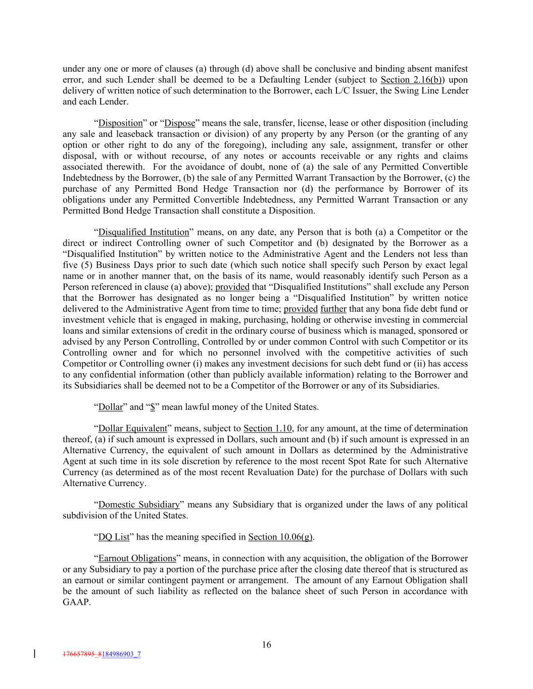 under any one or more of clauses (a) through (d) above shall be conclusive and binding absent manifest error, and such Lender shall be deemed to be a Defaulting Lender (subject to Section 2.16(b)) upon delivery of written notice of such determination to the Borrower, each L/C Issuer, the Swing Line Lender and each Lender. “Disposition” or “Dispose” means the sale, transfer, license, lease or other disposition (including any sale and leaseback transaction or division) of any property by any Person (or the granting of any option or other right to do any of the foregoing), including any sale, assignment, transfer or other disposal, with or without recourse, of any notes or accounts receivable or any rights and claims associated therewith. For the avoidance of doubt, none of (a) the sale of any Permitted Convertible Indebtedness by the Borrower, (b) the sale of any Permitted Warrant Transaction by the Borrower, (c) the purchase of any Permitted Bond Hedge Transaction nor (d) the performance by Borrower of its obligations under any Permitted Convertible Indebtedness, any Permitted Warrant Transaction or any Permitted Bond Hedge Transaction shall constitute a Disposition. “Disqualified Institution” means, on any date, any Person that is both (a) a Competitor or the direct or indirect Controlling owner of such Competitor and (b) designated by the Borrower as a “Disqualified Institution” by written notice to the Administrative Agent and the Lenders not less than five (5) Business Days prior to such date (which such notice shall specify such Person by exact legal name or in another manner that, on the basis of its name, would reasonably identify such Person as a Person referenced in clause (a) above); provided that “Disqualified Institutions” shall exclude any Person that the Borrower has designated as no longer being a “Disqualified Institution” by written notice delivered to the Administrative Agent from time to time; provided further that any bona fide debt fund or investment vehicle that is engaged in making, purchasing, holding or otherwise investing in commercial loans and similar extensions of credit in the ordinary course of business which is managed, sponsored or advised by any Person Controlling, Controlled by or under common Control with such Competitor or its Controlling owner and for which no personnel involved with the competitive activities of such Competitor or Controlling owner (i) makes any investment decisions for such debt fund or (ii) has access to any confidential information (other than publicly available information) relating to the Borrower and its Subsidiaries shall be deemed not to be a Competitor of the Borrower or any of its Subsidiaries. “Dollar” and “$” mean lawful money of the United States. “Dollar Equivalent” means, subject to Section 1.10, for any amount, at the time of determination thereof, (a) if such amount is expressed in Dollars, such amount and (b) if such amount is expressed in an Alternative Currency, the equivalent of such amount in Dollars as determined by the Administrative Agent at such time in its sole discretion by reference to the most recent Spot Rate for such Alternative Currency (as determined as of the most recent Revaluation Date) for the purchase of Dollars with such Alternative Currency. “Domestic Subsidiary” means any Subsidiary that is organized under the laws of any political subdivision of the United States. “DQ List” has the meaning specified in Section 10.06(g). “Earnout Obligations” means, in connection with any acquisition, the obligation of the Borrower or any Subsidiary to pay a portion of the purchase price after the closing date thereof that is structured as an earnout or similar contingent payment or arrangement. The amount of any Earnout Obligation shall be the amount of such liability as reflected on the balance sheet of such Person in accordance with GAAP. 16 176657895_8184986903_7