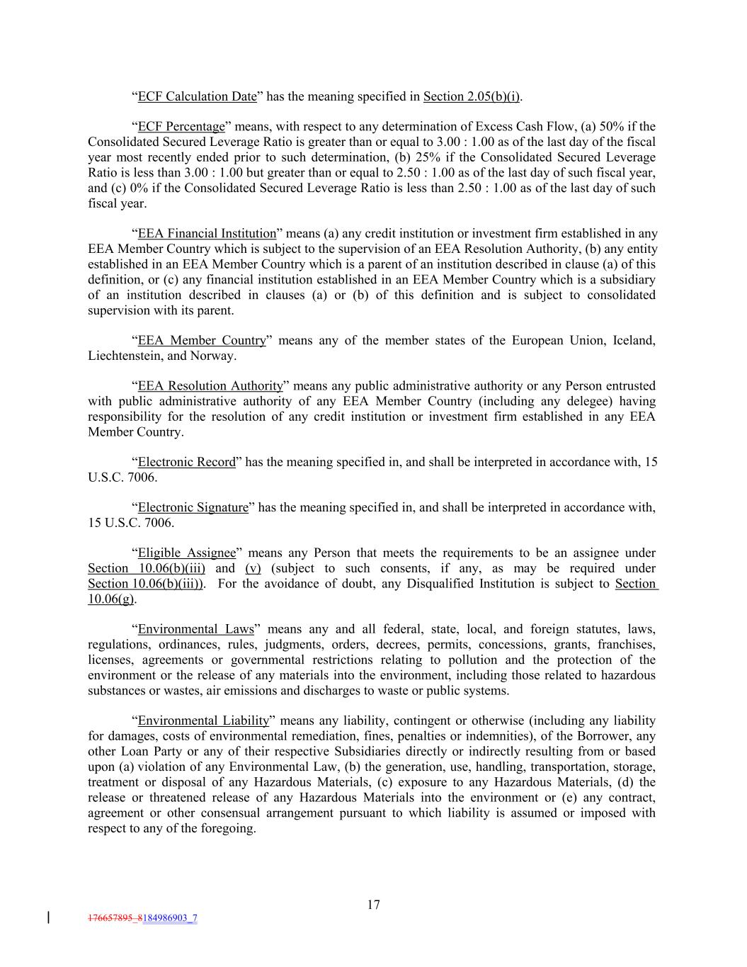 “ECF Calculation Date” has the meaning specified in Section 2.05(b)(i). “ECF Percentage” means, with respect to any determination of Excess Cash Flow, (a) 50% if the Consolidated Secured Leverage Ratio is greater than or equal to 3.00 : 1.00 as of the last day of the fiscal year most recently ended prior to such determination, (b) 25% if the Consolidated Secured Leverage Ratio is less than 3.00 : 1.00 but greater than or equal to 2.50 : 1.00 as of the last day of such fiscal year, and (c) 0% if the Consolidated Secured Leverage Ratio is less than 2.50 : 1.00 as of the last day of such fiscal year. “EEA Financial Institution” means (a) any credit institution or investment firm established in any EEA Member Country which is subject to the supervision of an EEA Resolution Authority, (b) any entity established in an EEA Member Country which is a parent of an institution described in clause (a) of this definition, or (c) any financial institution established in an EEA Member Country which is a subsidiary of an institution described in clauses (a) or (b) of this definition and is subject to consolidated supervision with its parent. “EEA Member Country” means any of the member states of the European Union, Iceland, Liechtenstein, and Norway. “EEA Resolution Authority” means any public administrative authority or any Person entrusted with public administrative authority of any EEA Member Country (including any delegee) having responsibility for the resolution of any credit institution or investment firm established in any EEA Member Country. “Electronic Record” has the meaning specified in, and shall be interpreted in accordance with, 15 U.S.C. 7006. “Electronic Signature” has the meaning specified in, and shall be interpreted in accordance with, 15 U.S.C. 7006. “Eligible Assignee” means any Person that meets the requirements to be an assignee under Section 10.06(b)(iii) and (v) (subject to such consents, if any, as may be required under Section 10.06(b)(iii)). For the avoidance of doubt, any Disqualified Institution is subject to Section 10.06(g). “Environmental Laws” means any and all federal, state, local, and foreign statutes, laws, regulations, ordinances, rules, judgments, orders, decrees, permits, concessions, grants, franchises, licenses, agreements or governmental restrictions relating to pollution and the protection of the environment or the release of any materials into the environment, including those related to hazardous substances or wastes, air emissions and discharges to waste or public systems. “Environmental Liability” means any liability, contingent or otherwise (including any liability for damages, costs of environmental remediation, fines, penalties or indemnities), of the Borrower, any other Loan Party or any of their respective Subsidiaries directly or indirectly resulting from or based upon (a) violation of any Environmental Law, (b) the generation, use, handling, transportation, storage, treatment or disposal of any Hazardous Materials, (c) exposure to any Hazardous Materials, (d) the release or threatened release of any Hazardous Materials into the environment or (e) any contract, agreement or other consensual arrangement pursuant to which liability is assumed or imposed with respect to any of the foregoing. 17 176657895_8184986903_7