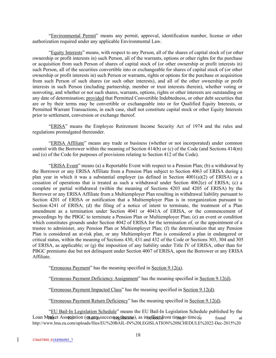 18 176657895_8184986903_7 “Environmental Permit” means any permit, approval, identification number, license or other authorization required under any applicable Environmental Law. “Equity Interests” means, with respect to any Person, all of the shares of capital stock of (or other ownership or profit interests in) such Person, all of the warrants, options or other rights for the purchase or acquisition from such Person of shares of capital stock of (or other ownership or profit interests in) such Person, all of the securities convertible into or exchangeable for shares of capital stock of (or other ownership or profit interests in) such Person or warrants, rights or options for the purchase or acquisition from such Person of such shares (or such other interests), and all of the other ownership or profit interests in such Person (including partnership, member or trust interests therein), whether voting or nonvoting, and whether or not such shares, warrants, options, rights or other interests are outstanding on any date of determination; provided that Permitted Convertible Indebtedness, or other debt securities that are or by their terms may be convertible or exchangeable into or for Qualified Equity Interests, or Permitted Warrant Transactions, in each case, shall not constitute capital stock or other Equity Interests prior to settlement, conversion or exchange thereof. “ERISA” means the Employee Retirement Income Security Act of 1974 and the rules and regulations promulgated thereunder. “ERISA Affiliate” means any trade or business (whether or not incorporated) under common control with the Borrower within the meaning of Section 414(b) or (c) of the Code (and Sections 414(m) and (o) of the Code for purposes of provisions relating to Section 412 of the Code). “ERISA Event” means (a) a Reportable Event with respect to a Pension Plan; (b) a withdrawal by the Borrower or any ERISA Affiliate from a Pension Plan subject to Section 4063 of ERISA during a plan year in which it was a substantial employer (as defined in Section 4001(a)(2) of ERISA) or a cessation of operations that is treated as such a withdrawal under Section 4062(e) of ERISA; (c) a complete or partial withdrawal (within the meaning of Sections 4203 and 4205 of ERISA) by the Borrower or any ERISA Affiliate from a Multiemployer Plan resulting in withdrawal liability pursuant to Section 4201 of ERISA or notification that a Multiemployer Plan is in reorganization pursuant to Section 4241 of ERISA; (d) the filing of a notice of intent to terminate, the treatment of a Plan amendment as a termination under Section 4041 or 4041A of ERISA, or the commencement of proceedings by the PBGC to terminate a Pension Plan or Multiemployer Plan; (e) an event or condition which constitutes grounds under Section 4042 of ERISA for the termination of, or the appointment of a trustee to administer, any Pension Plan or Multiemployer Plan; (f) the determination that any Pension Plan is considered an at-risk plan, or any Multiemployer Plan is considered a plan in endangered or critical status, within the meaning of Sections 430, 431 and 432 of the Code or Sections 303, 304 and 305 of ERISA, as applicable; or (g) the imposition of any liability under Title IV of ERISA, other than for PBGC premiums due but not delinquent under Section 4007 of ERISA, upon the Borrower or any ERISA Affiliate. “Erroneous Payment” has the meaning specified in Section 9.12(a). “Erroneous Payment Deficiency Assignment” has the meaning specified in Section 9.12(d). “Erroneous Payment Impacted Class” has the meaning specified in Section 9.12(d). “Erroneous Payment Return Deficiency” has the meaning specified in Section 9.12(d). “EU Bail-In Legislation Schedule” means the EU Bail-In Legislation Schedule published by the Loan Market Association (or any successor thereto), as in effect from time to time. 11 The EU Bail-In Legislation Schedule may be found at http://www.lma.eu.com/uploads/files/EU%20BAIL-IN%20LEGISLATION%20SCHEDULE%2022-Dec-2015%20