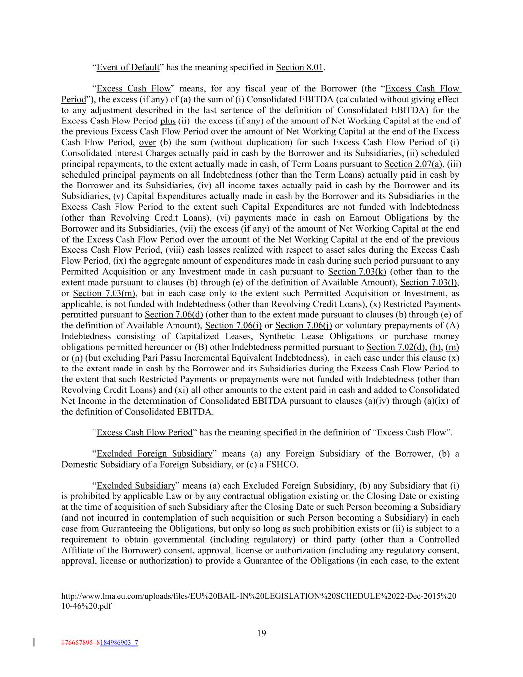 19 176657895_8184986903_7 “Event of Default” has the meaning specified in Section 8.01. “Excess Cash Flow” means, for any fiscal year of the Borrower (the “Excess Cash Flow Period”), the excess (if any) of (a) the sum of (i) Consolidated EBITDA (calculated without giving effect to any adjustment described in the last sentence of the definition of Consolidated EBITDA) for the Excess Cash Flow Period plus (ii) the excess (if any) of the amount of Net Working Capital at the end of the previous Excess Cash Flow Period over the amount of Net Working Capital at the end of the Excess Cash Flow Period, over (b) the sum (without duplication) for such Excess Cash Flow Period of (i) Consolidated Interest Charges actually paid in cash by the Borrower and its Subsidiaries, (ii) scheduled principal repayments, to the extent actually made in cash, of Term Loans pursuant to Section 2.07(a), (iii) scheduled principal payments on all Indebtedness (other than the Term Loans) actually paid in cash by the Borrower and its Subsidiaries, (iv) all income taxes actually paid in cash by the Borrower and its Subsidiaries, (v) Capital Expenditures actually made in cash by the Borrower and its Subsidiaries in the Excess Cash Flow Period to the extent such Capital Expenditures are not funded with Indebtedness (other than Revolving Credit Loans), (vi) payments made in cash on Earnout Obligations by the Borrower and its Subsidiaries, (vii) the excess (if any) of the amount of Net Working Capital at the end of the Excess Cash Flow Period over the amount of the Net Working Capital at the end of the previous Excess Cash Flow Period, (viii) cash losses realized with respect to asset sales during the Excess Cash Flow Period, (ix) the aggregate amount of expenditures made in cash during such period pursuant to any Permitted Acquisition or any Investment made in cash pursuant to Section 7.03(k) (other than to the extent made pursuant to clauses (b) through (e) of the definition of Available Amount), Section 7.03(l), or Section 7.03(m), but in each case only to the extent such Permitted Acquisition or Investment, as applicable, is not funded with Indebtedness (other than Revolving Credit Loans), (x) Restricted Payments permitted pursuant to Section 7.06(d) (other than to the extent made pursuant to clauses (b) through (e) of the definition of Available Amount), Section 7.06(i) or Section 7.06(j) or voluntary prepayments of (A) Indebtedness consisting of Capitalized Leases, Synthetic Lease Obligations or purchase money obligations permitted hereunder or (B) other Indebtedness permitted pursuant to Section 7.02(d), (h), (m) or (n) (but excluding Pari Passu Incremental Equivalent Indebtedness), in each case under this clause (x) to the extent made in cash by the Borrower and its Subsidiaries during the Excess Cash Flow Period to the extent that such Restricted Payments or prepayments were not funded with Indebtedness (other than Revolving Credit Loans) and (xi) all other amounts to the extent paid in cash and added to Consolidated Net Income in the determination of Consolidated EBITDA pursuant to clauses (a)(iv) through (a)(ix) of the definition of Consolidated EBITDA. “Excess Cash Flow Period” has the meaning specified in the definition of “Excess Cash Flow”. “Excluded Foreign Subsidiary” means (a) any Foreign Subsidiary of the Borrower, (b) a Domestic Subsidiary of a Foreign Subsidiary, or (c) a FSHCO. “Excluded Subsidiary” means (a) each Excluded Foreign Subsidiary, (b) any Subsidiary that (i) is prohibited by applicable Law or by any contractual obligation existing on the Closing Date or existing at the time of acquisition of such Subsidiary after the Closing Date or such Person becoming a Subsidiary (and not incurred in contemplation of such acquisition or such Person becoming a Subsidiary) in each case from Guaranteeing the Obligations, but only so long as such prohibition exists or (ii) is subject to a requirement to obtain governmental (including regulatory) or third party (other than a Controlled Affiliate of the Borrower) consent, approval, license or authorization (including any regulatory consent, approval, license or authorization) to provide a Guarantee of the Obligations (in each case, to the extent http://www.lma.eu.com/uploads/files/EU%20BAIL-IN%20LEGISLATION%20SCHEDULE%2022-Dec-2015%20 10-46%20.pdf