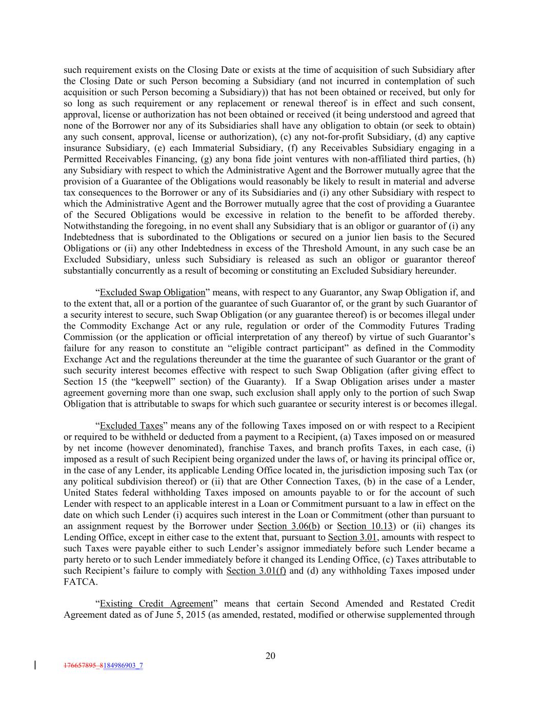 such requirement exists on the Closing Date or exists at the time of acquisition of such Subsidiary after the Closing Date or such Person becoming a Subsidiary (and not incurred in contemplation of such acquisition or such Person becoming a Subsidiary)) that has not been obtained or received, but only for so long as such requirement or any replacement or renewal thereof is in effect and such consent, approval, license or authorization has not been obtained or received (it being understood and agreed that none of the Borrower nor any of its Subsidiaries shall have any obligation to obtain (or seek to obtain) any such consent, approval, license or authorization), (c) any not-for-profit Subsidiary, (d) any captive insurance Subsidiary, (e) each Immaterial Subsidiary, (f) any Receivables Subsidiary engaging in a Permitted Receivables Financing, (g) any bona fide joint ventures with non-affiliated third parties, (h) any Subsidiary with respect to which the Administrative Agent and the Borrower mutually agree that the provision of a Guarantee of the Obligations would reasonably be likely to result in material and adverse tax consequences to the Borrower or any of its Subsidiaries and (i) any other Subsidiary with respect to which the Administrative Agent and the Borrower mutually agree that the cost of providing a Guarantee of the Secured Obligations would be excessive in relation to the benefit to be afforded thereby. Notwithstanding the foregoing, in no event shall any Subsidiary that is an obligor or guarantor of (i) any Indebtedness that is subordinated to the Obligations or secured on a junior lien basis to the Secured Obligations or (ii) any other Indebtedness in excess of the Threshold Amount, in any such case be an Excluded Subsidiary, unless such Subsidiary is released as such an obligor or guarantor thereof substantially concurrently as a result of becoming or constituting an Excluded Subsidiary hereunder. “Excluded Swap Obligation” means, with respect to any Guarantor, any Swap Obligation if, and to the extent that, all or a portion of the guarantee of such Guarantor of, or the grant by such Guarantor of a security interest to secure, such Swap Obligation (or any guarantee thereof) is or becomes illegal under the Commodity Exchange Act or any rule, regulation or order of the Commodity Futures Trading Commission (or the application or official interpretation of any thereof) by virtue of such Guarantor’s failure for any reason to constitute an “eligible contract participant” as defined in the Commodity Exchange Act and the regulations thereunder at the time the guarantee of such Guarantor or the grant of such security interest becomes effective with respect to such Swap Obligation (after giving effect to Section 15 (the “keepwell” section) of the Guaranty). If a Swap Obligation arises under a master agreement governing more than one swap, such exclusion shall apply only to the portion of such Swap Obligation that is attributable to swaps for which such guarantee or security interest is or becomes illegal. “Excluded Taxes” means any of the following Taxes imposed on or with respect to a Recipient or required to be withheld or deducted from a payment to a Recipient, (a) Taxes imposed on or measured by net income (however denominated), franchise Taxes, and branch profits Taxes, in each case, (i) imposed as a result of such Recipient being organized under the laws of, or having its principal office or, in the case of any Lender, its applicable Lending Office located in, the jurisdiction imposing such Tax (or any political subdivision thereof) or (ii) that are Other Connection Taxes, (b) in the case of a Lender, United States federal withholding Taxes imposed on amounts payable to or for the account of such Lender with respect to an applicable interest in a Loan or Commitment pursuant to a law in effect on the date on which such Lender (i) acquires such interest in the Loan or Commitment (other than pursuant to an assignment request by the Borrower under Section 3.06(b) or Section 10.13) or (ii) changes its Lending Office, except in either case to the extent that, pursuant to Section 3.01, amounts with respect to such Taxes were payable either to such Lender’s assignor immediately before such Lender became a party hereto or to such Lender immediately before it changed its Lending Office, (c) Taxes attributable to such Recipient’s failure to comply with Section 3.01(f) and (d) any withholding Taxes imposed under FATCA. “Existing Credit Agreement” means that certain Second Amended and Restated Credit Agreement dated as of June 5, 2015 (as amended, restated, modified or otherwise supplemented through 20 176657895_8184986903_7