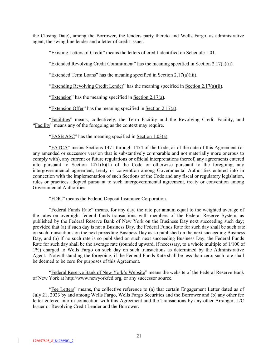 the Closing Date), among the Borrower, the lenders party thereto and Wells Fargo, as administrative agent, the swing line lender and a letter of credit issuer. “Existing Letters of Credit” means the letters of credit identified on Schedule 1.01. “Extended Revolving Credit Commitment” has the meaning specified in Section 2.17(a)(ii). “Extended Term Loans” has the meaning specified in Section 2.17(a)(iii). “Extending Revolving Credit Lender” has the meaning specified in Section 2.17(a)(ii). “Extension” has the meaning specified in Section 2.17(a). “Extension Offer” has the meaning specified in Section 2.17(a). “Facilities” means, collectively, the Term Facility and the Revolving Credit Facility, and “Facility” means any of the foregoing as the context may require. “FASB ASC” has the meaning specified in Section 1.03(a). “FATCA” means Sections 1471 through 1474 of the Code, as of the date of this Agreement (or any amended or successor version that is substantively comparable and not materially more onerous to comply with), any current or future regulations or official interpretations thereof, any agreements entered into pursuant to Section 1471(b)(1) of the Code or otherwise pursuant to the foregoing, any intergovernmental agreement, treaty or convention among Governmental Authorities entered into in connection with the implementation of such Sections of the Code and any fiscal or regulatory legislation, rules or practices adopted pursuant to such intergovernmental agreement, treaty or convention among Governmental Authorities. “FDIC” means the Federal Deposit Insurance Corporation. “Federal Funds Rate” means, for any day, the rate per annum equal to the weighted average of the rates on overnight federal funds transactions with members of the Federal Reserve System, as published by the Federal Reserve Bank of New York on the Business Day next succeeding such day; provided that (a) if such day is not a Business Day, the Federal Funds Rate for such day shall be such rate on such transactions on the next preceding Business Day as so published on the next succeeding Business Day, and (b) if no such rate is so published on such next succeeding Business Day, the Federal Funds Rate for such day shall be the average rate (rounded upward, if necessary, to a whole multiple of 1/100 of 1%) charged to Wells Fargo on such day on such transactions as determined by the Administrative Agent. Notwithstanding the foregoing, if the Federal Funds Rate shall be less than zero, such rate shall be deemed to be zero for purposes of this Agreement. “Federal Reserve Bank of New York’s Website” means the website of the Federal Reserve Bank of New York at http://www.newyorkfed.org, or any successor source. “Fee Letters” means, the collective reference to (a) that certain Engagement Letter dated as of July 21, 2023 by and among Wells Fargo, Wells Fargo Securities and the Borrower and (b) any other fee letter entered into in connection with this Agreement and the Transactions by any other Arranger, L/C Issuer or Revolving Credit Lender and the Borrower. 21 176657895_8184986903_7