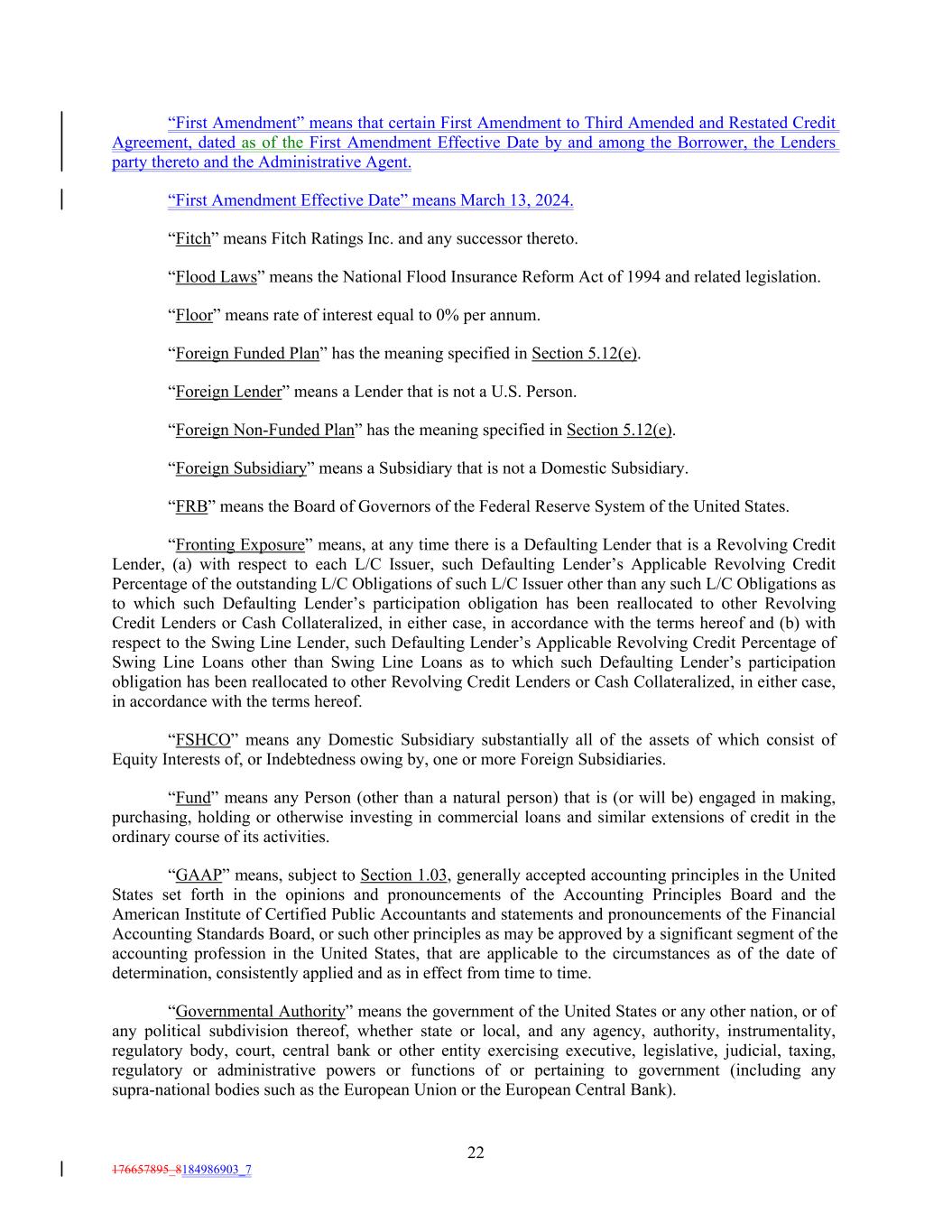 “First Amendment” means that certain First Amendment to Third Amended and Restated Credit Agreement, dated as of the First Amendment Effective Date by and among the Borrower, the Lenders party thereto and the Administrative Agent. “First Amendment Effective Date” means March 13, 2024. “Fitch” means Fitch Ratings Inc. and any successor thereto. “Flood Laws” means the National Flood Insurance Reform Act of 1994 and related legislation. “Floor” means rate of interest equal to 0% per annum. “Foreign Funded Plan” has the meaning specified in Section 5.12(e). “Foreign Lender” means a Lender that is not a U.S. Person. “Foreign Non-Funded Plan” has the meaning specified in Section 5.12(e). “Foreign Subsidiary” means a Subsidiary that is not a Domestic Subsidiary. “FRB” means the Board of Governors of the Federal Reserve System of the United States. “Fronting Exposure” means, at any time there is a Defaulting Lender that is a Revolving Credit Lender, (a) with respect to each L/C Issuer, such Defaulting Lender’s Applicable Revolving Credit Percentage of the outstanding L/C Obligations of such L/C Issuer other than any such L/C Obligations as to which such Defaulting Lender’s participation obligation has been reallocated to other Revolving Credit Lenders or Cash Collateralized, in either case, in accordance with the terms hereof and (b) with respect to the Swing Line Lender, such Defaulting Lender’s Applicable Revolving Credit Percentage of Swing Line Loans other than Swing Line Loans as to which such Defaulting Lender’s participation obligation has been reallocated to other Revolving Credit Lenders or Cash Collateralized, in either case, in accordance with the terms hereof. “FSHCO” means any Domestic Subsidiary substantially all of the assets of which consist of Equity Interests of, or Indebtedness owing by, one or more Foreign Subsidiaries. “Fund” means any Person (other than a natural person) that is (or will be) engaged in making, purchasing, holding or otherwise investing in commercial loans and similar extensions of credit in the ordinary course of its activities. “GAAP” means, subject to Section 1.03, generally accepted accounting principles in the United States set forth in the opinions and pronouncements of the Accounting Principles Board and the American Institute of Certified Public Accountants and statements and pronouncements of the Financial Accounting Standards Board, or such other principles as may be approved by a significant segment of the accounting profession in the United States, that are applicable to the circumstances as of the date of determination, consistently applied and as in effect from time to time. “Governmental Authority” means the government of the United States or any other nation, or of any political subdivision thereof, whether state or local, and any agency, authority, instrumentality, regulatory body, court, central bank or other entity exercising executive, legislative, judicial, taxing, regulatory or administrative powers or functions of or pertaining to government (including any supra-national bodies such as the European Union or the European Central Bank). 22 176657895_8184986903_7