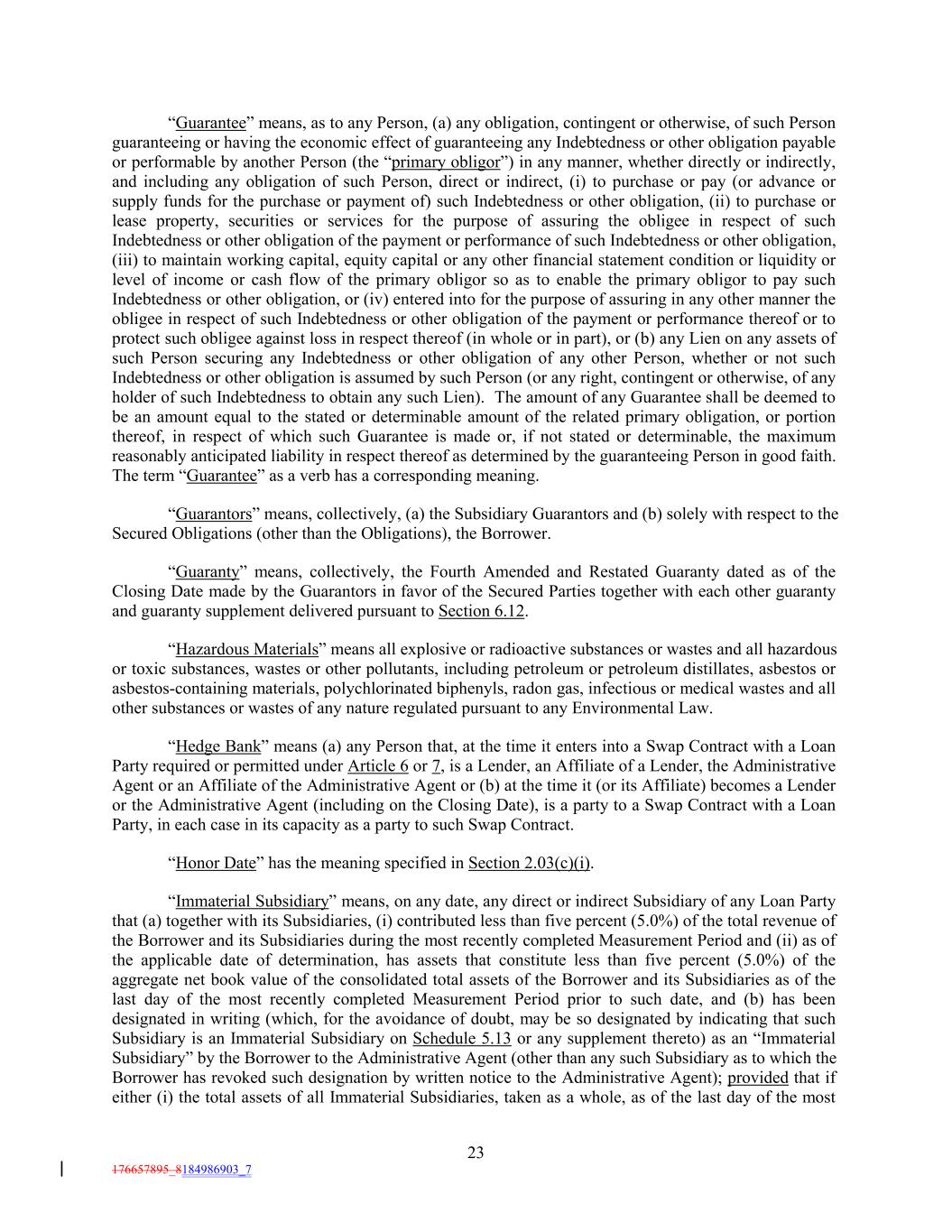 “Guarantee” means, as to any Person, (a) any obligation, contingent or otherwise, of such Person guaranteeing or having the economic effect of guaranteeing any Indebtedness or other obligation payable or performable by another Person (the “primary obligor”) in any manner, whether directly or indirectly, and including any obligation of such Person, direct or indirect, (i) to purchase or pay (or advance or supply funds for the purchase or payment of) such Indebtedness or other obligation, (ii) to purchase or lease property, securities or services for the purpose of assuring the obligee in respect of such Indebtedness or other obligation of the payment or performance of such Indebtedness or other obligation, (iii) to maintain working capital, equity capital or any other financial statement condition or liquidity or level of income or cash flow of the primary obligor so as to enable the primary obligor to pay such Indebtedness or other obligation, or (iv) entered into for the purpose of assuring in any other manner the obligee in respect of such Indebtedness or other obligation of the payment or performance thereof or to protect such obligee against loss in respect thereof (in whole or in part), or (b) any Lien on any assets of such Person securing any Indebtedness or other obligation of any other Person, whether or not such Indebtedness or other obligation is assumed by such Person (or any right, contingent or otherwise, of any holder of such Indebtedness to obtain any such Lien). The amount of any Guarantee shall be deemed to be an amount equal to the stated or determinable amount of the related primary obligation, or portion thereof, in respect of which such Guarantee is made or, if not stated or determinable, the maximum reasonably anticipated liability in respect thereof as determined by the guaranteeing Person in good faith. The term “Guarantee” as a verb has a corresponding meaning. “Guarantors” means, collectively, (a) the Subsidiary Guarantors and (b) solely with respect to the Secured Obligations (other than the Obligations), the Borrower. “Guaranty” means, collectively, the Fourth Amended and Restated Guaranty dated as of the Closing Date made by the Guarantors in favor of the Secured Parties together with each other guaranty and guaranty supplement delivered pursuant to Section 6.12. “Hazardous Materials” means all explosive or radioactive substances or wastes and all hazardous or toxic substances, wastes or other pollutants, including petroleum or petroleum distillates, asbestos or asbestos-containing materials, polychlorinated biphenyls, radon gas, infectious or medical wastes and all other substances or wastes of any nature regulated pursuant to any Environmental Law. “Hedge Bank” means (a) any Person that, at the time it enters into a Swap Contract with a Loan Party required or permitted under Article 6 or 7, is a Lender, an Affiliate of a Lender, the Administrative Agent or an Affiliate of the Administrative Agent or (b) at the time it (or its Affiliate) becomes a Lender or the Administrative Agent (including on the Closing Date), is a party to a Swap Contract with a Loan Party, in each case in its capacity as a party to such Swap Contract. “Honor Date” has the meaning specified in Section 2.03(c)(i). “Immaterial Subsidiary” means, on any date, any direct or indirect Subsidiary of any Loan Party that (a) together with its Subsidiaries, (i) contributed less than five percent (5.0%) of the total revenue of the Borrower and its Subsidiaries during the most recently completed Measurement Period and (ii) as of the applicable date of determination, has assets that constitute less than five percent (5.0%) of the aggregate net book value of the consolidated total assets of the Borrower and its Subsidiaries as of the last day of the most recently completed Measurement Period prior to such date, and (b) has been designated in writing (which, for the avoidance of doubt, may be so designated by indicating that such Subsidiary is an Immaterial Subsidiary on Schedule 5.13 or any supplement thereto) as an “Immaterial Subsidiary” by the Borrower to the Administrative Agent (other than any such Subsidiary as to which the Borrower has revoked such designation by written notice to the Administrative Agent); provided that if either (i) the total assets of all Immaterial Subsidiaries, taken as a whole, as of the last day of the most 23 176657895_8184986903_7