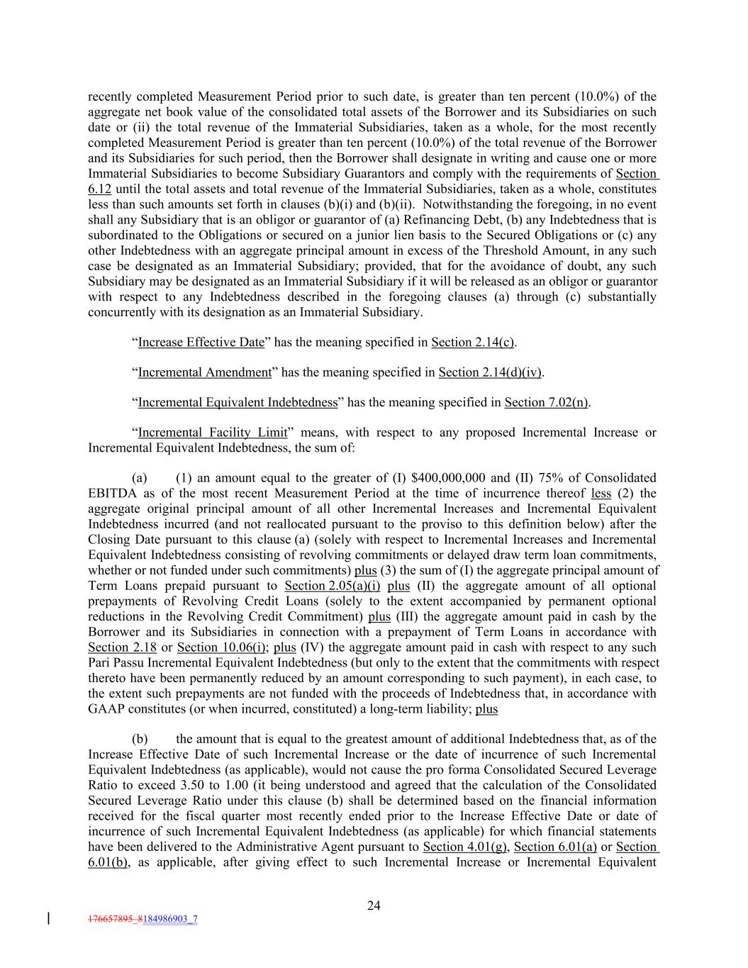 recently completed Measurement Period prior to such date, is greater than ten percent (10.0%) of the aggregate net book value of the consolidated total assets of the Borrower and its Subsidiaries on such date or (ii) the total revenue of the Immaterial Subsidiaries, taken as a whole, for the most recently completed Measurement Period is greater than ten percent (10.0%) of the total revenue of the Borrower and its Subsidiaries for such period, then the Borrower shall designate in writing and cause one or more Immaterial Subsidiaries to become Subsidiary Guarantors and comply with the requirements of Section 6.12 until the total assets and total revenue of the Immaterial Subsidiaries, taken as a whole, constitutes less than such amounts set forth in clauses (b)(i) and (b)(ii). Notwithstanding the foregoing, in no event shall any Subsidiary that is an obligor or guarantor of (a) Refinancing Debt, (b) any Indebtedness that is subordinated to the Obligations or secured on a junior lien basis to the Secured Obligations or (c) any other Indebtedness with an aggregate principal amount in excess of the Threshold Amount, in any such case be designated as an Immaterial Subsidiary; provided, that for the avoidance of doubt, any such Subsidiary may be designated as an Immaterial Subsidiary if it will be released as an obligor or guarantor with respect to any Indebtedness described in the foregoing clauses (a) through (c) substantially concurrently with its designation as an Immaterial Subsidiary. “Increase Effective Date” has the meaning specified in Section 2.14(c). “Incremental Amendment” has the meaning specified in Section 2.14(d)(iv). “Incremental Equivalent Indebtedness” has the meaning specified in Section 7.02(n). “Incremental Facility Limit” means, with respect to any proposed Incremental Increase or Incremental Equivalent Indebtedness, the sum of: (a) (1) an amount equal to the greater of (I) $400,000,000 and (II) 75% of Consolidated EBITDA as of the most recent Measurement Period at the time of incurrence thereof less (2) the aggregate original principal amount of all other Incremental Increases and Incremental Equivalent Indebtedness incurred (and not reallocated pursuant to the proviso to this definition below) after the Closing Date pursuant to this clause (a) (solely with respect to Incremental Increases and Incremental Equivalent Indebtedness consisting of revolving commitments or delayed draw term loan commitments, whether or not funded under such commitments) plus (3) the sum of (I) the aggregate principal amount of Term Loans prepaid pursuant to Section 2.05(a)(i) plus (II) the aggregate amount of all optional prepayments of Revolving Credit Loans (solely to the extent accompanied by permanent optional reductions in the Revolving Credit Commitment) plus (III) the aggregate amount paid in cash by the Borrower and its Subsidiaries in connection with a prepayment of Term Loans in accordance with Section 2.18 or Section 10.06(i); plus (IV) the aggregate amount paid in cash with respect to any such Pari Passu Incremental Equivalent Indebtedness (but only to the extent that the commitments with respect thereto have been permanently reduced by an amount corresponding to such payment), in each case, to the extent such prepayments are not funded with the proceeds of Indebtedness that, in accordance with GAAP constitutes (or when incurred, constituted) a long-term liability; plus (b) the amount that is equal to the greatest amount of additional Indebtedness that, as of the Increase Effective Date of such Incremental Increase or the date of incurrence of such Incremental Equivalent Indebtedness (as applicable), would not cause the pro forma Consolidated Secured Leverage Ratio to exceed 3.50 to 1.00 (it being understood and agreed that the calculation of the Consolidated Secured Leverage Ratio under this clause (b) shall be determined based on the financial information received for the fiscal quarter most recently ended prior to the Increase Effective Date or date of incurrence of such Incremental Equivalent Indebtedness (as applicable) for which financial statements have been delivered to the Administrative Agent pursuant to Section 4.01(g), Section 6.01(a) or Section 6.01(b), as applicable, after giving effect to such Incremental Increase or Incremental Equivalent 24 176657895_8184986903_7