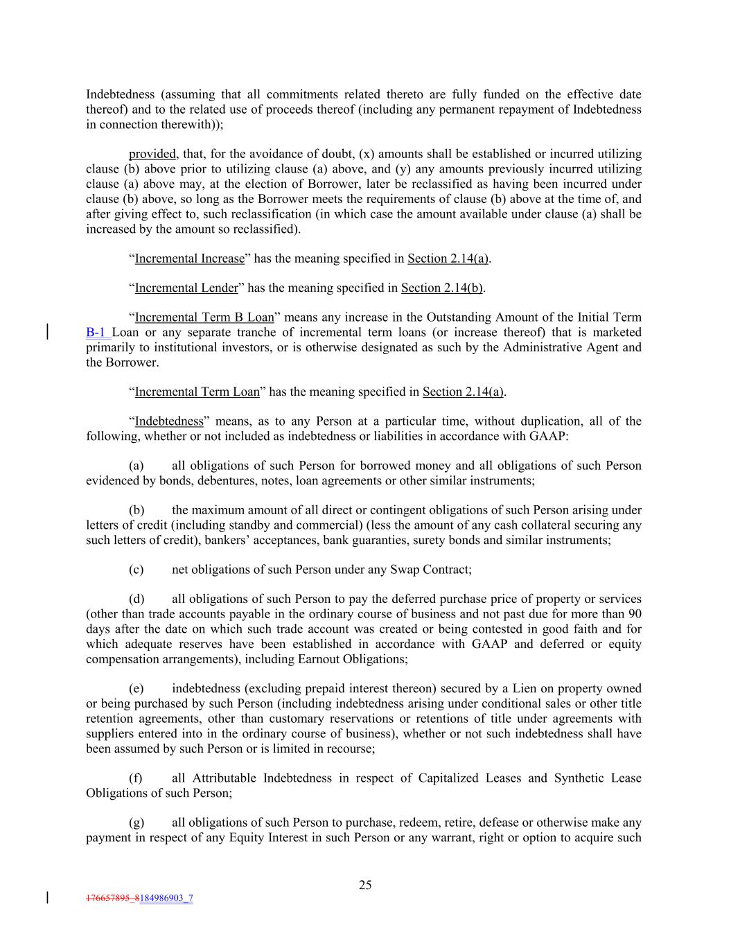 Indebtedness (assuming that all commitments related thereto are fully funded on the effective date thereof) and to the related use of proceeds thereof (including any permanent repayment of Indebtedness in connection therewith)); provided, that, for the avoidance of doubt, (x) amounts shall be established or incurred utilizing clause (b) above prior to utilizing clause (a) above, and (y) any amounts previously incurred utilizing clause (a) above may, at the election of Borrower, later be reclassified as having been incurred under clause (b) above, so long as the Borrower meets the requirements of clause (b) above at the time of, and after giving effect to, such reclassification (in which case the amount available under clause (a) shall be increased by the amount so reclassified). “Incremental Increase” has the meaning specified in Section 2.14(a). “Incremental Lender” has the meaning specified in Section 2.14(b). “Incremental Term B Loan” means any increase in the Outstanding Amount of the Initial Term B-1 Loan or any separate tranche of incremental term loans (or increase thereof) that is marketed primarily to institutional investors, or is otherwise designated as such by the Administrative Agent and the Borrower. “Incremental Term Loan” has the meaning specified in Section 2.14(a). “Indebtedness” means, as to any Person at a particular time, without duplication, all of the following, whether or not included as indebtedness or liabilities in accordance with GAAP: (a) all obligations of such Person for borrowed money and all obligations of such Person evidenced by bonds, debentures, notes, loan agreements or other similar instruments; (b) the maximum amount of all direct or contingent obligations of such Person arising under letters of credit (including standby and commercial) (less the amount of any cash collateral securing any such letters of credit), bankers’ acceptances, bank guaranties, surety bonds and similar instruments; (c) net obligations of such Person under any Swap Contract; (d) all obligations of such Person to pay the deferred purchase price of property or services (other than trade accounts payable in the ordinary course of business and not past due for more than 90 days after the date on which such trade account was created or being contested in good faith and for which adequate reserves have been established in accordance with GAAP and deferred or equity compensation arrangements), including Earnout Obligations; (e) indebtedness (excluding prepaid interest thereon) secured by a Lien on property owned or being purchased by such Person (including indebtedness arising under conditional sales or other title retention agreements, other than customary reservations or retentions of title under agreements with suppliers entered into in the ordinary course of business), whether or not such indebtedness shall have been assumed by such Person or is limited in recourse; (f) all Attributable Indebtedness in respect of Capitalized Leases and Synthetic Lease Obligations of such Person; (g) all obligations of such Person to purchase, redeem, retire, defease or otherwise make any payment in respect of any Equity Interest in such Person or any warrant, right or option to acquire such 25 176657895_8184986903_7