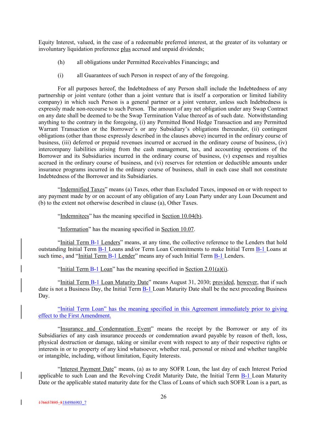 Equity Interest, valued, in the case of a redeemable preferred interest, at the greater of its voluntary or involuntary liquidation preference plus accrued and unpaid dividends; (h) all obligations under Permitted Receivables Financings; and (i) all Guarantees of such Person in respect of any of the foregoing. For all purposes hereof, the Indebtedness of any Person shall include the Indebtedness of any partnership or joint venture (other than a joint venture that is itself a corporation or limited liability company) in which such Person is a general partner or a joint venturer, unless such Indebtedness is expressly made non-recourse to such Person. The amount of any net obligation under any Swap Contract on any date shall be deemed to be the Swap Termination Value thereof as of such date. Notwithstanding anything to the contrary in the foregoing, (i) any Permitted Bond Hedge Transaction and any Permitted Warrant Transaction or the Borrower’s or any Subsidiary’s obligations thereunder, (ii) contingent obligations (other than those expressly described in the clauses above) incurred in the ordinary course of business, (iii) deferred or prepaid revenues incurred or accrued in the ordinary course of business, (iv) intercompany liabilities arising from the cash management, tax, and accounting operations of the Borrower and its Subsidiaries incurred in the ordinary course of business, (v) expenses and royalties accrued in the ordinary course of business, and (vi) reserves for retention or deductible amounts under insurance programs incurred in the ordinary course of business, shall in each case shall not constitute Indebtedness of the Borrower and its Subsidiaries. “Indemnified Taxes” means (a) Taxes, other than Excluded Taxes, imposed on or with respect to any payment made by or on account of any obligation of any Loan Party under any Loan Document and (b) to the extent not otherwise described in clause (a), Other Taxes. “Indemnitees” has the meaning specified in Section 10.04(b). “Information” has the meaning specified in Section 10.07. “Initial Term B-1 Lenders” means, at any time, the collective reference to the Lenders that hold outstanding Initial Term B-1 Loans and/or Term Loan Commitments to make Initial Term B-1 Loans at such time., and “Initial Term B-1 Lender” means any of such Initial Term B-1 Lenders. “Initial Term B-1 Loan” has the meaning specified in Section 2.01(a)(i). “Initial Term B-1 Loan Maturity Date” means August 31, 2030; provided, however, that if such date is not a Business Day, the Initial Term B-1 Loan Maturity Date shall be the next preceding Business Day. “Initial Term Loan” has the meaning specified in this Agreement immediately prior to giving effect to the First Amendment. “Insurance and Condemnation Event” means the receipt by the Borrower or any of its Subsidiaries of any cash insurance proceeds or condemnation award payable by reason of theft, loss, physical destruction or damage, taking or similar event with respect to any of their respective rights or interests in or to property of any kind whatsoever, whether real, personal or mixed and whether tangible or intangible, including, without limitation, Equity Interests. “Interest Payment Date” means, (a) as to any SOFR Loan, the last day of each Interest Period applicable to such Loan and the Revolving Credit Maturity Date, the Initial Term B-1 Loan Maturity Date or the applicable stated maturity date for the Class of Loans of which such SOFR Loan is a part, as 26 176657895_8184986903_7