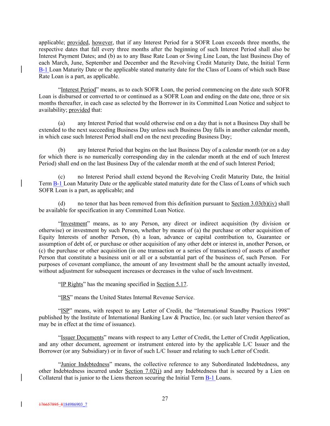 applicable; provided, however, that if any Interest Period for a SOFR Loan exceeds three months, the respective dates that fall every three months after the beginning of such Interest Period shall also be Interest Payment Dates; and (b) as to any Base Rate Loan or Swing Line Loan, the last Business Day of each March, June, September and December and the Revolving Credit Maturity Date, the Initial Term B-1 Loan Maturity Date or the applicable stated maturity date for the Class of Loans of which such Base Rate Loan is a part, as applicable. “Interest Period” means, as to each SOFR Loan, the period commencing on the date such SOFR Loan is disbursed or converted to or continued as a SOFR Loan and ending on the date one, three or six months thereafter, in each case as selected by the Borrower in its Committed Loan Notice and subject to availability; provided that: (a) any Interest Period that would otherwise end on a day that is not a Business Day shall be extended to the next succeeding Business Day unless such Business Day falls in another calendar month, in which case such Interest Period shall end on the next preceding Business Day; (b) any Interest Period that begins on the last Business Day of a calendar month (or on a day for which there is no numerically corresponding day in the calendar month at the end of such Interest Period) shall end on the last Business Day of the calendar month at the end of such Interest Period; (c) no Interest Period shall extend beyond the Revolving Credit Maturity Date, the Initial Term B-1 Loan Maturity Date or the applicable stated maturity date for the Class of Loans of which such SOFR Loan is a part, as applicable; and (d) no tenor that has been removed from this definition pursuant to Section 3.03(b)(iv) shall be available for specification in any Committed Loan Notice. “Investment” means, as to any Person, any direct or indirect acquisition (by division or otherwise) or investment by such Person, whether by means of (a) the purchase or other acquisition of Equity Interests of another Person, (b) a loan, advance or capital contribution to, Guarantee or assumption of debt of, or purchase or other acquisition of any other debt or interest in, another Person, or (c) the purchase or other acquisition (in one transaction or a series of transactions) of assets of another Person that constitute a business unit or all or a substantial part of the business of, such Person. For purposes of covenant compliance, the amount of any Investment shall be the amount actually invested, without adjustment for subsequent increases or decreases in the value of such Investment. “IP Rights” has the meaning specified in Section 5.17. “IRS” means the United States Internal Revenue Service. “ISP” means, with respect to any Letter of Credit, the “International Standby Practices 1998” published by the Institute of International Banking Law & Practice, Inc. (or such later version thereof as may be in effect at the time of issuance). “Issuer Documents” means with respect to any Letter of Credit, the Letter of Credit Application, and any other document, agreement or instrument entered into by the applicable L/C Issuer and the Borrower (or any Subsidiary) or in favor of such L/C Issuer and relating to such Letter of Credit. “Junior Indebtedness” means, the collective reference to any Subordinated Indebtedness, any other Indebtedness incurred under Section 7.02(j) and any Indebtedness that is secured by a Lien on Collateral that is junior to the Liens thereon securing the Initial Term B-1 Loans. 27 176657895_8184986903_7