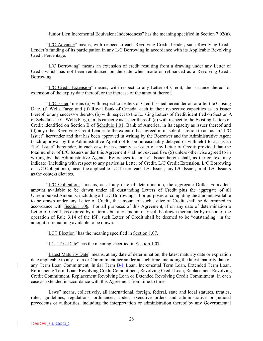 “Junior Lien Incremental Equivalent Indebtedness” has the meaning specified in Section 7.02(n). “L/C Advance” means, with respect to each Revolving Credit Lender, such Revolving Credit Lender’s funding of its participation in any L/C Borrowing in accordance with its Applicable Revolving Credit Percentage. “L/C Borrowing” means an extension of credit resulting from a drawing under any Letter of Credit which has not been reimbursed on the date when made or refinanced as a Revolving Credit Borrowing. “L/C Credit Extension” means, with respect to any Letter of Credit, the issuance thereof or extension of the expiry date thereof, or the increase of the amount thereof. “L/C Issuer” means (a) with respect to Letters of Credit issued hereunder on or after the Closing Date, (i) Wells Fargo and (ii) Royal Bank of Canada, each in their respective capacities as an issuer thereof, or any successor thereto, (b) with respect to the Existing Letters of Credit identified on Section A of Schedule 1.01, Wells Fargo, in its capacity as issuer thereof, (c) with respect to the Existing Letters of Credit identified on Section B of Schedule 1.01, Bank of America, in its capacity as issuer thereof and (d) any other Revolving Credit Lender to the extent it has agreed in its sole discretion to act as an “L/C Issuer” hereunder and that has been approved in writing by the Borrower and the Administrative Agent (such approval by the Administrative Agent not to be unreasonably delayed or withheld) to act as an “L/C Issuer” hereunder, in each case in its capacity as issuer of any Letter of Credit; provided that the total number of L/C Issuers under this Agreement shall not exceed five (5) unless otherwise agreed to in writing by the Administrative Agent. References to an L/C Issuer herein shall, as the context may indicate (including with respect to any particular Letter of Credit, L/C Credit Extension, L/C Borrowing or L/C Obligations), mean the applicable L/C Issuer, each L/C Issuer, any L/C Issuer, or all L/C Issuers as the context dictates. “L/C Obligations” means, as at any date of determination, the aggregate Dollar Equivalent amount available to be drawn under all outstanding Letters of Credit plus the aggregate of all Unreimbursed Amounts, including all L/C Borrowings. For purposes of computing the amount available to be drawn under any Letter of Credit, the amount of such Letter of Credit shall be determined in accordance with Section 1.06. For all purposes of this Agreement, if on any date of determination a Letter of Credit has expired by its terms but any amount may still be drawn thereunder by reason of the operation of Rule 3.14 of the ISP, such Letter of Credit shall be deemed to be “outstanding” in the amount so remaining available to be drawn. “LCT Election” has the meaning specified in Section 1.07. “LCT Test Date” has the meaning specified in Section 1.07. “Latest Maturity Date” means, at any date of determination, the latest maturity date or expiration date applicable to any Loan or Commitment hereunder at such time, including the latest maturity date of any Term Loan Commitment, Initial Term B-1 Loan, Incremental Term Loan, Extended Term Loan, Refinancing Term Loan, Revolving Credit Commitment, Revolving Credit Loan, Replacement Revolving Credit Commitment, Replacement Revolving Loan or Extended Revolving Credit Commitment, in each case as extended in accordance with this Agreement from time to time. “Laws” means, collectively, all international, foreign, federal, state and local statutes, treaties, rules, guidelines, regulations, ordinances, codes, executive orders and administrative or judicial precedents or authorities, including the interpretation or administration thereof by any Governmental 28 176657895_8184986903_7