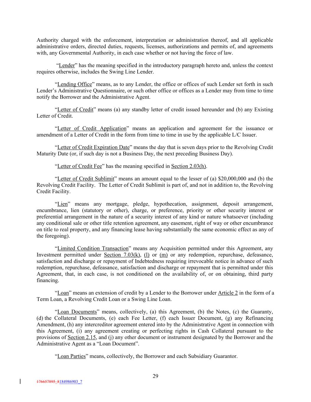Authority charged with the enforcement, interpretation or administration thereof, and all applicable administrative orders, directed duties, requests, licenses, authorizations and permits of, and agreements with, any Governmental Authority, in each case whether or not having the force of law. “Lender” has the meaning specified in the introductory paragraph hereto and, unless the context requires otherwise, includes the Swing Line Lender. “Lending Office” means, as to any Lender, the office or offices of such Lender set forth in such Lender’s Administrative Questionnaire, or such other office or offices as a Lender may from time to time notify the Borrower and the Administrative Agent. “Letter of Credit” means (a) any standby letter of credit issued hereunder and (b) any Existing Letter of Credit. “Letter of Credit Application” means an application and agreement for the issuance or amendment of a Letter of Credit in the form from time to time in use by the applicable L/C Issuer. “Letter of Credit Expiration Date” means the day that is seven days prior to the Revolving Credit Maturity Date (or, if such day is not a Business Day, the next preceding Business Day). “Letter of Credit Fee” has the meaning specified in Section 2.03(h). “Letter of Credit Sublimit” means an amount equal to the lesser of (a) $20,000,000 and (b) the Revolving Credit Facility. The Letter of Credit Sublimit is part of, and not in addition to, the Revolving Credit Facility. “Lien” means any mortgage, pledge, hypothecation, assignment, deposit arrangement, encumbrance, lien (statutory or other), charge, or preference, priority or other security interest or preferential arrangement in the nature of a security interest of any kind or nature whatsoever (including any conditional sale or other title retention agreement, any easement, right of way or other encumbrance on title to real property, and any financing lease having substantially the same economic effect as any of the foregoing). “Limited Condition Transaction” means any Acquisition permitted under this Agreement, any Investment permitted under Section 7.03(k), (l) or (m) or any redemption, repurchase, defeasance, satisfaction and discharge or repayment of Indebtedness requiring irrevocable notice in advance of such redemption, repurchase, defeasance, satisfaction and discharge or repayment that is permitted under this Agreement, that, in each case, is not conditioned on the availability of, or on obtaining, third party financing. “Loan” means an extension of credit by a Lender to the Borrower under Article 2 in the form of a Term Loan, a Revolving Credit Loan or a Swing Line Loan. “Loan Documents” means, collectively, (a) this Agreement, (b) the Notes, (c) the Guaranty, (d) the Collateral Documents, (e) each Fee Letter, (f) each Issuer Document, (g) any Refinancing Amendment, (h) any intercreditor agreement entered into by the Administrative Agent in connection with this Agreement, (i) any agreement creating or perfecting rights in Cash Collateral pursuant to the provisions of Section 2.15, and (j) any other document or instrument designated by the Borrower and the Administrative Agent as a “Loan Document”. “Loan Parties” means, collectively, the Borrower and each Subsidiary Guarantor. 29 176657895_8184986903_7