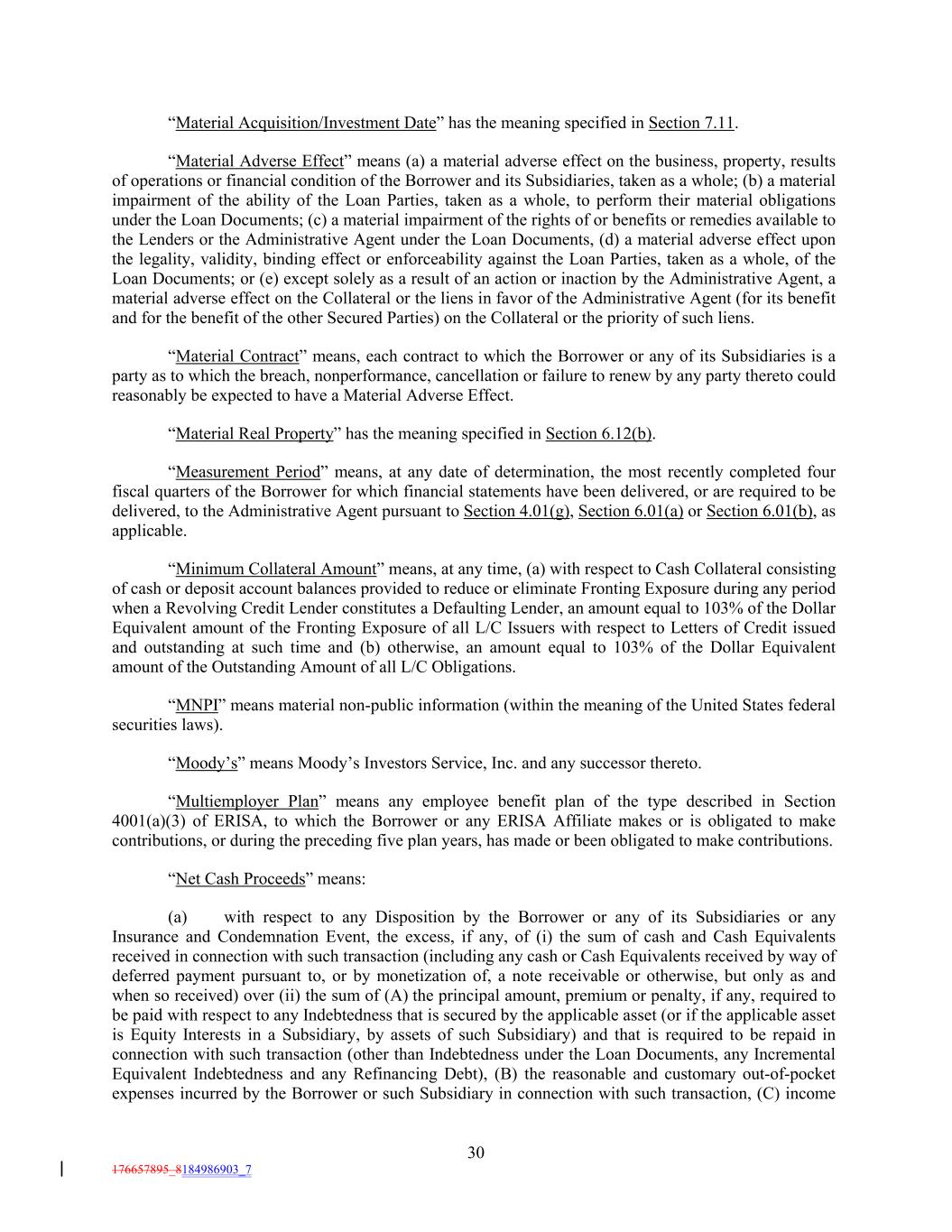 “Material Acquisition/Investment Date” has the meaning specified in Section 7.11. “Material Adverse Effect” means (a) a material adverse effect on the business, property, results of operations or financial condition of the Borrower and its Subsidiaries, taken as a whole; (b) a material impairment of the ability of the Loan Parties, taken as a whole, to perform their material obligations under the Loan Documents; (c) a material impairment of the rights of or benefits or remedies available to the Lenders or the Administrative Agent under the Loan Documents, (d) a material adverse effect upon the legality, validity, binding effect or enforceability against the Loan Parties, taken as a whole, of the Loan Documents; or (e) except solely as a result of an action or inaction by the Administrative Agent, a material adverse effect on the Collateral or the liens in favor of the Administrative Agent (for its benefit and for the benefit of the other Secured Parties) on the Collateral or the priority of such liens. “Material Contract” means, each contract to which the Borrower or any of its Subsidiaries is a party as to which the breach, nonperformance, cancellation or failure to renew by any party thereto could reasonably be expected to have a Material Adverse Effect. “Material Real Property” has the meaning specified in Section 6.12(b). “Measurement Period” means, at any date of determination, the most recently completed four fiscal quarters of the Borrower for which financial statements have been delivered, or are required to be delivered, to the Administrative Agent pursuant to Section 4.01(g), Section 6.01(a) or Section 6.01(b), as applicable. “Minimum Collateral Amount” means, at any time, (a) with respect to Cash Collateral consisting of cash or deposit account balances provided to reduce or eliminate Fronting Exposure during any period when a Revolving Credit Lender constitutes a Defaulting Lender, an amount equal to 103% of the Dollar Equivalent amount of the Fronting Exposure of all L/C Issuers with respect to Letters of Credit issued and outstanding at such time and (b) otherwise, an amount equal to 103% of the Dollar Equivalent amount of the Outstanding Amount of all L/C Obligations. “MNPI” means material non-public information (within the meaning of the United States federal securities laws). “Moody’s” means Moody’s Investors Service, Inc. and any successor thereto. “Multiemployer Plan” means any employee benefit plan of the type described in Section 4001(a)(3) of ERISA, to which the Borrower or any ERISA Affiliate makes or is obligated to make contributions, or during the preceding five plan years, has made or been obligated to make contributions. “Net Cash Proceeds” means: (a) with respect to any Disposition by the Borrower or any of its Subsidiaries or any Insurance and Condemnation Event, the excess, if any, of (i) the sum of cash and Cash Equivalents received in connection with such transaction (including any cash or Cash Equivalents received by way of deferred payment pursuant to, or by monetization of, a note receivable or otherwise, but only as and when so received) over (ii) the sum of (A) the principal amount, premium or penalty, if any, required to be paid with respect to any Indebtedness that is secured by the applicable asset (or if the applicable asset is Equity Interests in a Subsidiary, by assets of such Subsidiary) and that is required to be repaid in connection with such transaction (other than Indebtedness under the Loan Documents, any Incremental Equivalent Indebtedness and any Refinancing Debt), (B) the reasonable and customary out-of-pocket expenses incurred by the Borrower or such Subsidiary in connection with such transaction, (C) income 30 176657895_8184986903_7