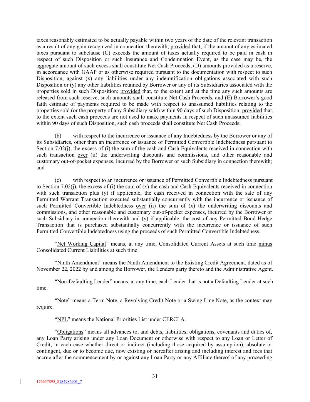 taxes reasonably estimated to be actually payable within two years of the date of the relevant transaction as a result of any gain recognized in connection therewith; provided that, if the amount of any estimated taxes pursuant to subclause (C) exceeds the amount of taxes actually required to be paid in cash in respect of such Disposition or such Insurance and Condemnation Event, as the case may be, the aggregate amount of such excess shall constitute Net Cash Proceeds, (D) amounts provided as a reserve, in accordance with GAAP or as otherwise required pursuant to the documentation with respect to such Disposition, against (x) any liabilities under any indemnification obligations associated with such Disposition or (y) any other liabilities retained by Borrower or any of its Subsidiaries associated with the properties sold in such Disposition; provided that, to the extent and at the time any such amounts are released from such reserve, such amounts shall constitute Net Cash Proceeds, and (E) Borrower’s good faith estimate of payments required to be made with respect to unassumed liabilities relating to the properties sold (or the property of any Subsidiary sold) within 90 days of such Disposition; provided that, to the extent such cash proceeds are not used to make payments in respect of such unassumed liabilities within 90 days of such Disposition, such cash proceeds shall constitute Net Cash Proceeds; (b) with respect to the incurrence or issuance of any Indebtedness by the Borrower or any of its Subsidiaries, other than an incurrence or issuance of Permitted Convertible Indebtedness pursuant to Section 7.02(j), the excess of (i) the sum of the cash and Cash Equivalents received in connection with such transaction over (ii) the underwriting discounts and commissions, and other reasonable and customary out-of-pocket expenses, incurred by the Borrower or such Subsidiary in connection therewith; and (c) with respect to an incurrence or issuance of Permitted Convertible Indebtedness pursuant to Section 7.02(j), the excess of (i) the sum of (x) the cash and Cash Equivalents received in connection with such transaction plus (y) if applicable, the cash received in connection with the sale of any Permitted Warrant Transaction executed substantially concurrently with the incurrence or issuance of such Permitted Convertible Indebtedness over (ii) the sum of (x) the underwriting discounts and commissions, and other reasonable and customary out-of-pocket expenses, incurred by the Borrower or such Subsidiary in connection therewith and (y) if applicable, the cost of any Permitted Bond Hedge Transaction that is purchased substantially concurrently with the incurrence or issuance of such Permitted Convertible Indebtedness using the proceeds of such Permitted Convertible Indebtedness. “Net Working Capital” means, at any time, Consolidated Current Assets at such time minus Consolidated Current Liabilities at such time. “Ninth Amendment” means the Ninth Amendment to the Existing Credit Agreement, dated as of November 22, 2022 by and among the Borrower, the Lenders party thereto and the Administrative Agent. “Non-Defaulting Lender” means, at any time, each Lender that is not a Defaulting Lender at such time. “Note” means a Term Note, a Revolving Credit Note or a Swing Line Note, as the context may require. “NPL” means the National Priorities List under CERCLA. “Obligations” means all advances to, and debts, liabilities, obligations, covenants and duties of, any Loan Party arising under any Loan Document or otherwise with respect to any Loan or Letter of Credit, in each case whether direct or indirect (including those acquired by assumption), absolute or contingent, due or to become due, now existing or hereafter arising and including interest and fees that accrue after the commencement by or against any Loan Party or any Affiliate thereof of any proceeding 31 176657895_8184986903_7