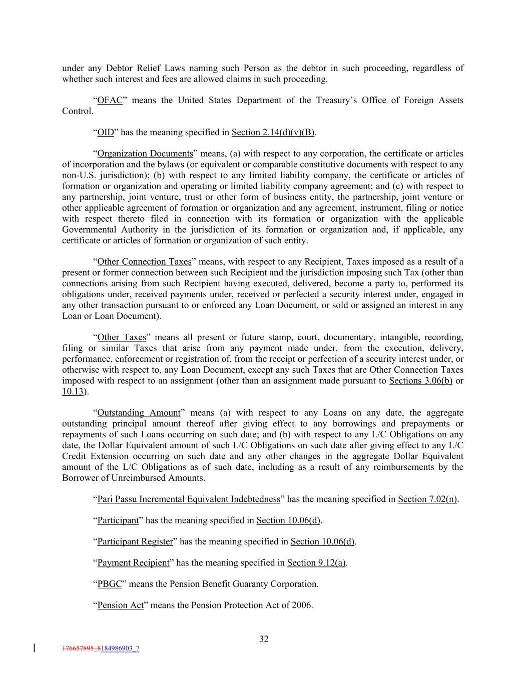 under any Debtor Relief Laws naming such Person as the debtor in such proceeding, regardless of whether such interest and fees are allowed claims in such proceeding. “OFAC” means the United States Department of the Treasury’s Office of Foreign Assets Control. “OID” has the meaning specified in Section 2.14(d)(v)(B). “Organization Documents” means, (a) with respect to any corporation, the certificate or articles of incorporation and the bylaws (or equivalent or comparable constitutive documents with respect to any non-U.S. jurisdiction); (b) with respect to any limited liability company, the certificate or articles of formation or organization and operating or limited liability company agreement; and (c) with respect to any partnership, joint venture, trust or other form of business entity, the partnership, joint venture or other applicable agreement of formation or organization and any agreement, instrument, filing or notice with respect thereto filed in connection with its formation or organization with the applicable Governmental Authority in the jurisdiction of its formation or organization and, if applicable, any certificate or articles of formation or organization of such entity. “Other Connection Taxes” means, with respect to any Recipient, Taxes imposed as a result of a present or former connection between such Recipient and the jurisdiction imposing such Tax (other than connections arising from such Recipient having executed, delivered, become a party to, performed its obligations under, received payments under, received or perfected a security interest under, engaged in any other transaction pursuant to or enforced any Loan Document, or sold or assigned an interest in any Loan or Loan Document). “Other Taxes” means all present or future stamp, court, documentary, intangible, recording, filing or similar Taxes that arise from any payment made under, from the execution, delivery, performance, enforcement or registration of, from the receipt or perfection of a security interest under, or otherwise with respect to, any Loan Document, except any such Taxes that are Other Connection Taxes imposed with respect to an assignment (other than an assignment made pursuant to Sections 3.06(b) or 10.13). “Outstanding Amount” means (a) with respect to any Loans on any date, the aggregate outstanding principal amount thereof after giving effect to any borrowings and prepayments or repayments of such Loans occurring on such date; and (b) with respect to any L/C Obligations on any date, the Dollar Equivalent amount of such L/C Obligations on such date after giving effect to any L/C Credit Extension occurring on such date and any other changes in the aggregate Dollar Equivalent amount of the L/C Obligations as of such date, including as a result of any reimbursements by the Borrower of Unreimbursed Amounts. “Pari Passu Incremental Equivalent Indebtedness” has the meaning specified in Section 7.02(n). “Participant” has the meaning specified in Section 10.06(d). “Participant Register” has the meaning specified in Section 10.06(d). “Payment Recipient” has the meaning specified in Section 9.12(a). “PBGC” means the Pension Benefit Guaranty Corporation. “Pension Act” means the Pension Protection Act of 2006. 32 176657895_8184986903_7