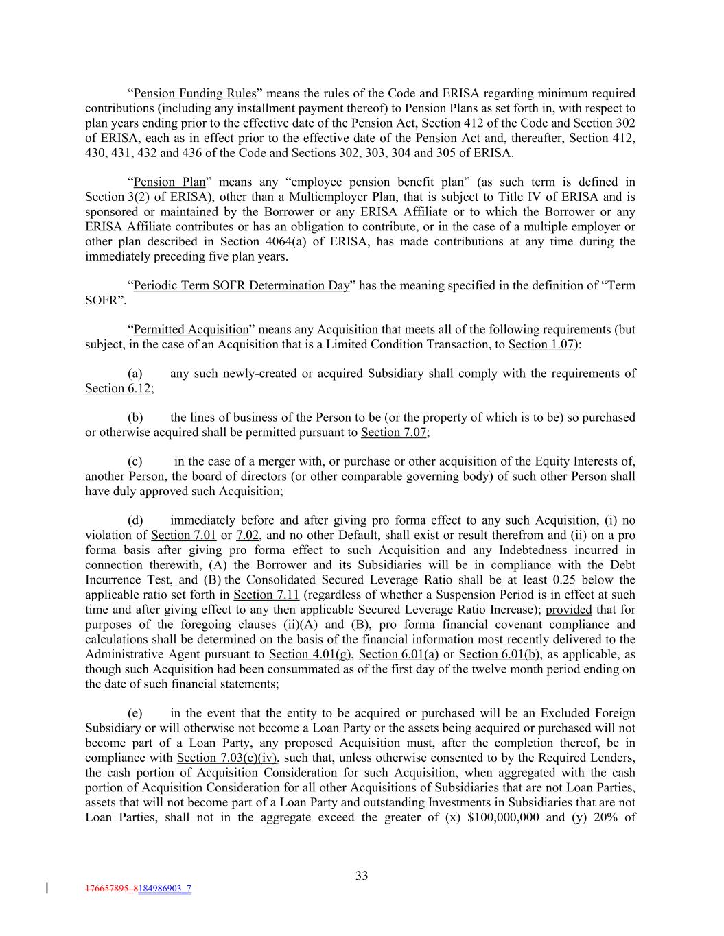 “Pension Funding Rules” means the rules of the Code and ERISA regarding minimum required contributions (including any installment payment thereof) to Pension Plans as set forth in, with respect to plan years ending prior to the effective date of the Pension Act, Section 412 of the Code and Section 302 of ERISA, each as in effect prior to the effective date of the Pension Act and, thereafter, Section 412, 430, 431, 432 and 436 of the Code and Sections 302, 303, 304 and 305 of ERISA. “Pension Plan” means any “employee pension benefit plan” (as such term is defined in Section 3(2) of ERISA), other than a Multiemployer Plan, that is subject to Title IV of ERISA and is sponsored or maintained by the Borrower or any ERISA Affiliate or to which the Borrower or any ERISA Affiliate contributes or has an obligation to contribute, or in the case of a multiple employer or other plan described in Section 4064(a) of ERISA, has made contributions at any time during the immediately preceding five plan years. “Periodic Term SOFR Determination Day” has the meaning specified in the definition of “Term SOFR”. “Permitted Acquisition” means any Acquisition that meets all of the following requirements (but subject, in the case of an Acquisition that is a Limited Condition Transaction, to Section 1.07): (a) any such newly-created or acquired Subsidiary shall comply with the requirements of Section 6.12; (b) the lines of business of the Person to be (or the property of which is to be) so purchased or otherwise acquired shall be permitted pursuant to Section 7.07; (c) in the case of a merger with, or purchase or other acquisition of the Equity Interests of, another Person, the board of directors (or other comparable governing body) of such other Person shall have duly approved such Acquisition; (d) immediately before and after giving pro forma effect to any such Acquisition, (i) no violation of Section 7.01 or 7.02, and no other Default, shall exist or result therefrom and (ii) on a pro forma basis after giving pro forma effect to such Acquisition and any Indebtedness incurred in connection therewith, (A) the Borrower and its Subsidiaries will be in compliance with the Debt Incurrence Test, and (B) the Consolidated Secured Leverage Ratio shall be at least 0.25 below the applicable ratio set forth in Section 7.11 (regardless of whether a Suspension Period is in effect at such time and after giving effect to any then applicable Secured Leverage Ratio Increase); provided that for purposes of the foregoing clauses (ii)(A) and (B), pro forma financial covenant compliance and calculations shall be determined on the basis of the financial information most recently delivered to the Administrative Agent pursuant to Section 4.01(g), Section 6.01(a) or Section 6.01(b), as applicable, as though such Acquisition had been consummated as of the first day of the twelve month period ending on the date of such financial statements; (e) in the event that the entity to be acquired or purchased will be an Excluded Foreign Subsidiary or will otherwise not become a Loan Party or the assets being acquired or purchased will not become part of a Loan Party, any proposed Acquisition must, after the completion thereof, be in compliance with Section 7.03(c)(iv), such that, unless otherwise consented to by the Required Lenders, the cash portion of Acquisition Consideration for such Acquisition, when aggregated with the cash portion of Acquisition Consideration for all other Acquisitions of Subsidiaries that are not Loan Parties, assets that will not become part of a Loan Party and outstanding Investments in Subsidiaries that are not Loan Parties, shall not in the aggregate exceed the greater of (x) $100,000,000 and (y) 20% of 33 176657895_8184986903_7