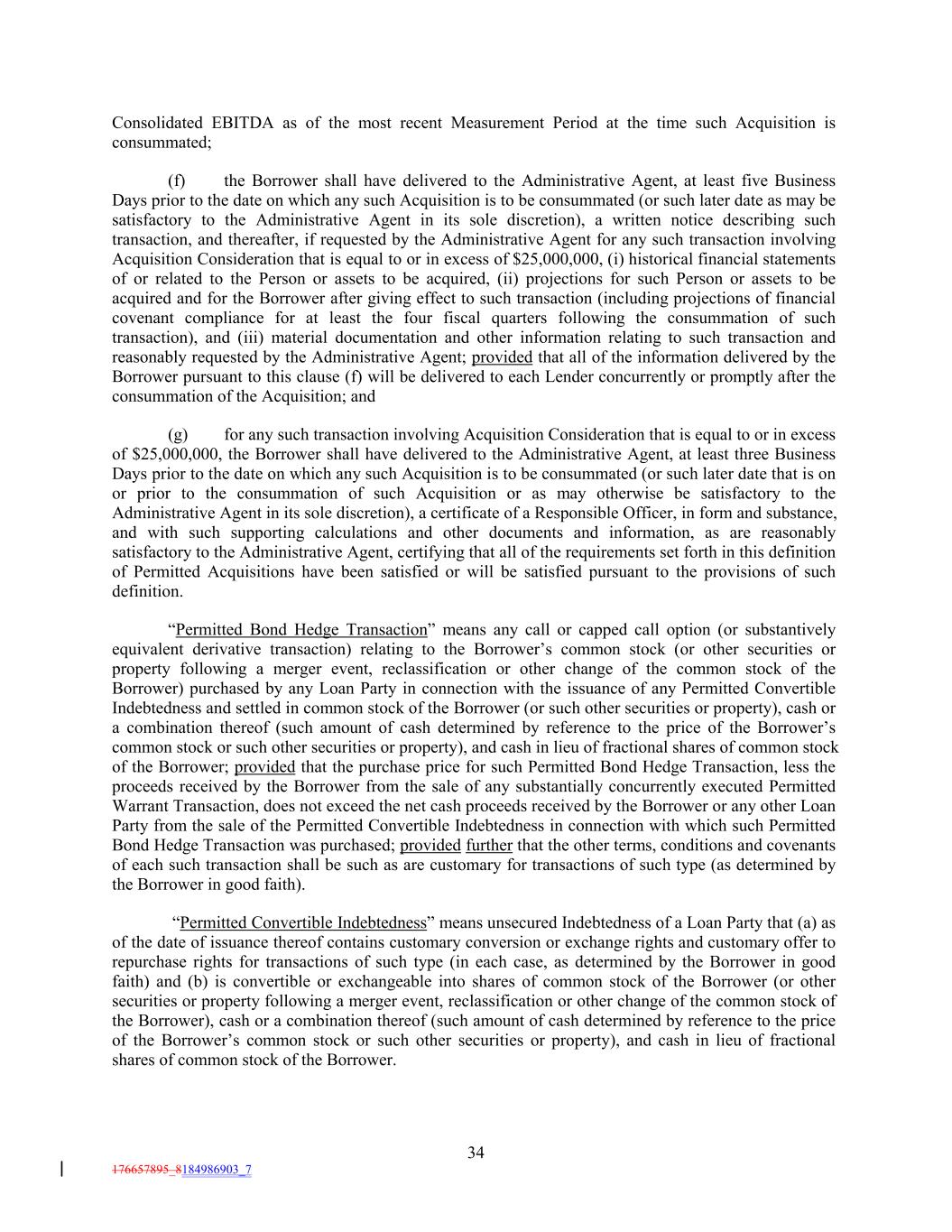 Consolidated EBITDA as of the most recent Measurement Period at the time such Acquisition is consummated; (f) the Borrower shall have delivered to the Administrative Agent, at least five Business Days prior to the date on which any such Acquisition is to be consummated (or such later date as may be satisfactory to the Administrative Agent in its sole discretion), a written notice describing such transaction, and thereafter, if requested by the Administrative Agent for any such transaction involving Acquisition Consideration that is equal to or in excess of $25,000,000, (i) historical financial statements of or related to the Person or assets to be acquired, (ii) projections for such Person or assets to be acquired and for the Borrower after giving effect to such transaction (including projections of financial covenant compliance for at least the four fiscal quarters following the consummation of such transaction), and (iii) material documentation and other information relating to such transaction and reasonably requested by the Administrative Agent; provided that all of the information delivered by the Borrower pursuant to this clause (f) will be delivered to each Lender concurrently or promptly after the consummation of the Acquisition; and (g) for any such transaction involving Acquisition Consideration that is equal to or in excess of $25,000,000, the Borrower shall have delivered to the Administrative Agent, at least three Business Days prior to the date on which any such Acquisition is to be consummated (or such later date that is on or prior to the consummation of such Acquisition or as may otherwise be satisfactory to the Administrative Agent in its sole discretion), a certificate of a Responsible Officer, in form and substance, and with such supporting calculations and other documents and information, as are reasonably satisfactory to the Administrative Agent, certifying that all of the requirements set forth in this definition of Permitted Acquisitions have been satisfied or will be satisfied pursuant to the provisions of such definition. “Permitted Bond Hedge Transaction” means any call or capped call option (or substantively equivalent derivative transaction) relating to the Borrower’s common stock (or other securities or property following a merger event, reclassification or other change of the common stock of the Borrower) purchased by any Loan Party in connection with the issuance of any Permitted Convertible Indebtedness and settled in common stock of the Borrower (or such other securities or property), cash or a combination thereof (such amount of cash determined by reference to the price of the Borrower’s common stock or such other securities or property), and cash in lieu of fractional shares of common stock of the Borrower; provided that the purchase price for such Permitted Bond Hedge Transaction, less the proceeds received by the Borrower from the sale of any substantially concurrently executed Permitted Warrant Transaction, does not exceed the net cash proceeds received by the Borrower or any other Loan Party from the sale of the Permitted Convertible Indebtedness in connection with which such Permitted Bond Hedge Transaction was purchased; provided further that the other terms, conditions and covenants of each such transaction shall be such as are customary for transactions of such type (as determined by the Borrower in good faith). “Permitted Convertible Indebtedness” means unsecured Indebtedness of a Loan Party that (a) as of the date of issuance thereof contains customary conversion or exchange rights and customary offer to repurchase rights for transactions of such type (in each case, as determined by the Borrower in good faith) and (b) is convertible or exchangeable into shares of common stock of the Borrower (or other securities or property following a merger event, reclassification or other change of the common stock of the Borrower), cash or a combination thereof (such amount of cash determined by reference to the price of the Borrower’s common stock or such other securities or property), and cash in lieu of fractional shares of common stock of the Borrower. 34 176657895_8184986903_7