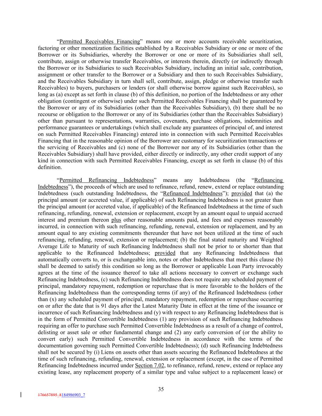 “Permitted Receivables Financing” means one or more accounts receivable securitization, factoring or other monetization facilities established by a Receivables Subsidiary or one or more of the Borrower or its Subsidiaries, whereby the Borrower or one or more of its Subsidiaries shall sell, contribute, assign or otherwise transfer Receivables, or interests therein, directly (or indirectly through the Borrower or its Subsidiaries to such Receivables Subsidiary, including an initial sale, contribution, assignment or other transfer to the Borrower or a Subsidiary and then to such Receivables Subsidiary, and the Receivables Subsidiary in turn shall sell, contribute, assign, pledge or otherwise transfer such Receivables) to buyers, purchasers or lenders (or shall otherwise borrow against such Receivables), so long as (a) except as set forth in clause (b) of this definition, no portion of the Indebtedness or any other obligation (contingent or otherwise) under such Permitted Receivables Financing shall be guaranteed by the Borrower or any of its Subsidiaries (other than the Receivables Subsidiary), (b) there shall be no recourse or obligation to the Borrower or any of its Subsidiaries (other than the Receivables Subsidiary) other than pursuant to representations, warranties, covenants, purchase obligations, indemnities and performance guarantees or undertakings (which shall exclude any guarantees of principal of, and interest on such Permitted Receivables Financing) entered into in connection with such Permitted Receivables Financing that in the reasonable opinion of the Borrower are customary for securitization transactions or the servicing of Receivables and (c) none of the Borrower nor any of its Subsidiaries (other than the Receivables Subsidiary) shall have provided, either directly or indirectly, any other credit support of any kind in connection with such Permitted Receivables Financing, except as set forth in clause (b) of this definition. “Permitted Refinancing Indebtedness” means any Indebtedness (the “Refinancing Indebtedness”), the proceeds of which are used to refinance, refund, renew, extend or replace outstanding Indebtedness (such outstanding Indebtedness, the “Refinanced Indebtedness”); provided that (a) the principal amount (or accreted value, if applicable) of such Refinancing Indebtedness is not greater than the principal amount (or accreted value, if applicable) of the Refinanced Indebtedness at the time of such refinancing, refunding, renewal, extension or replacement, except by an amount equal to unpaid accrued interest and premium thereon plus other reasonable amounts paid, and fees and expenses reasonably incurred, in connection with such refinancing, refunding, renewal, extension or replacement, and by an amount equal to any existing commitments thereunder that have not been utilized at the time of such refinancing, refunding, renewal, extension or replacement; (b) the final stated maturity and Weighted Average Life to Maturity of such Refinancing Indebtedness shall not be prior to or shorter than that applicable to the Refinanced Indebtedness; provided that any Refinancing Indebtedness that automatically converts to, or is exchangeable into, notes or other Indebtedness that meet this clause (b) shall be deemed to satisfy this condition so long as the Borrower or applicable Loan Party irrevocably agrees at the time of the issuance thereof to take all actions necessary to convert or exchange such Refinancing Indebtedness, (c) such Refinancing Indebtedness does not require any scheduled payment of principal, mandatory repayment, redemption or repurchase that is more favorable to the holders of the Refinancing Indebtedness than the corresponding terms (if any) of the Refinanced Indebtedness (other than (x) any scheduled payment of principal, mandatory repayment, redemption or repurchase occurring on or after the date that is 91 days after the Latest Maturity Date in effect at the time of the issuance or incurrence of such Refinancing Indebtedness and (y) with respect to any Refinancing Indebtedness that is in the form of Permitted Convertible Indebtedness (1) any provision of such Refinancing Indebtedness requiring an offer to purchase such Permitted Convertible Indebtedness as a result of a change of control, delisting or asset sale or other fundamental change and (2) any early conversion of (or the ability to convert early) such Permitted Convertible Indebtedness in accordance with the terms of the documentation governing such Permitted Convertible Indebtedness); (d) such Refinancing Indebtedness shall not be secured by (i) Liens on assets other than assets securing the Refinanced Indebtedness at the time of such refinancing, refunding, renewal, extension or replacement (except, in the case of Permitted Refinancing Indebtedness incurred under Section 7.02, to refinance, refund, renew, extend or replace any existing lease, any replacement property of a similar type and value subject to a replacement lease) or 35 176657895_8184986903_7
