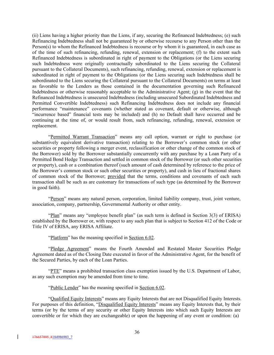 (ii) Liens having a higher priority than the Liens, if any, securing the Refinanced Indebtedness; (e) such Refinancing Indebtedness shall not be guaranteed by or otherwise recourse to any Person other than the Person(s) to whom the Refinanced Indebtedness is recourse or by whom it is guaranteed, in each case as of the time of such refinancing, refunding, renewal, extension or replacement; (f) to the extent such Refinanced Indebtedness is subordinated in right of payment to the Obligations (or the Liens securing such Indebtedness were originally contractually subordinated to the Liens securing the Collateral pursuant to the Collateral Documents), such refinancing, refunding, renewal, extension or replacement is subordinated in right of payment to the Obligations (or the Liens securing such Indebtedness shall be subordinated to the Liens securing the Collateral pursuant to the Collateral Documents) on terms at least as favorable to the Lenders as those contained in the documentation governing such Refinanced Indebtedness or otherwise reasonably acceptable to the Administrative Agent; (g) in the event that the Refinanced Indebtedness is unsecured Indebtedness (including unsecured Subordinated Indebtedness and Permitted Convertible Indebtedness) such Refinancing Indebtedness does not include any financial performance “maintenance” covenants (whether stated as covenant, default or otherwise, although “incurrence based” financial tests may be included) and (h) no Default shall have occurred and be continuing at the time of, or would result from, such refinancing, refunding, renewal, extension or replacement. “Permitted Warrant Transaction” means any call option, warrant or right to purchase (or substantively equivalent derivative transaction) relating to the Borrower’s common stock (or other securities or property following a merger event, reclassification or other change of the common stock of the Borrower) sold by the Borrower substantially concurrently with any purchase by a Loan Party of a Permitted Bond Hedge Transaction and settled in common stock of the Borrower (or such other securities or property), cash or a combination thereof (such amount of cash determined by reference to the price of the Borrower’s common stock or such other securities or property), and cash in lieu of fractional shares of common stock of the Borrower; provided that the terms, conditions and covenants of each such transaction shall be such as are customary for transactions of such type (as determined by the Borrower in good faith). “Person” means any natural person, corporation, limited liability company, trust, joint venture, association, company, partnership, Governmental Authority or other entity. “Plan” means any “employee benefit plan” (as such term is defined in Section 3(3) of ERISA) established by the Borrower or, with respect to any such plan that is subject to Section 412 of the Code or Title IV of ERISA, any ERISA Affiliate. “Platform” has the meaning specified in Section 6.02. “Pledge Agreement” means the Fourth Amended and Restated Master Securities Pledge Agreement dated as of the Closing Date executed in favor of the Administrative Agent, for the benefit of the Secured Parties, by each of the Loan Parties. “PTE” means a prohibited transaction class exemption issued by the U.S. Department of Labor, as any such exemption may be amended from time to time. “Public Lender” has the meaning specified in Section 6.02. “Qualified Equity Interests” means any Equity Interests that are not Disqualified Equity Interests. For purposes of this definition, “Disqualified Equity Interests” means any Equity Interests that, by their terms (or by the terms of any security or other Equity Interests into which such Equity Interests are convertible or for which they are exchangeable) or upon the happening of any event or condition: (a) 36 176657895_8184986903_7