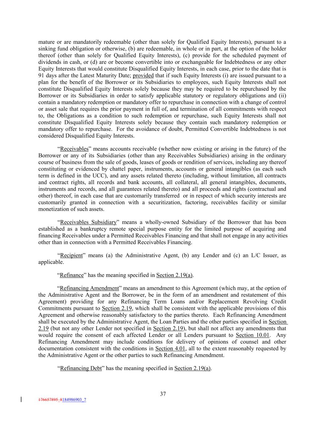 mature or are mandatorily redeemable (other than solely for Qualified Equity Interests), pursuant to a sinking fund obligation or otherwise, (b) are redeemable, in whole or in part, at the option of the holder thereof (other than solely for Qualified Equity Interests), (c) provide for the scheduled payment of dividends in cash, or (d) are or become convertible into or exchangeable for Indebtedness or any other Equity Interests that would constitute Disqualified Equity Interests, in each case, prior to the date that is 91 days after the Latest Maturity Date; provided that if such Equity Interests (i) are issued pursuant to a plan for the benefit of the Borrower or its Subsidiaries to employees, such Equity Interests shall not constitute Disqualified Equity Interests solely because they may be required to be repurchased by the Borrower or its Subsidiaries in order to satisfy applicable statutory or regulatory obligations and (ii) contain a mandatory redemption or mandatory offer to repurchase in connection with a change of control or asset sale that requires the prior payment in full of, and termination of all commitments with respect to, the Obligations as a condition to such redemption or repurchase, such Equity Interests shall not constitute Disqualified Equity Interests solely because they contain such mandatory redemption or mandatory offer to repurchase. For the avoidance of doubt, Permitted Convertible Indebtedness is not considered Disqualified Equity Interests. “Receivables” means accounts receivable (whether now existing or arising in the future) of the Borrower or any of its Subsidiaries (other than any Receivables Subsidiaries) arising in the ordinary course of business from the sale of goods, leases of goods or rendition of services, including any thereof constituting or evidenced by chattel paper, instruments, accounts or general intangibles (as each such term is defined in the UCC), and any assets related thereto (including, without limitation, all contracts and contract rights, all records and bank accounts, all collateral, all general intangibles, documents, instruments and records, and all guarantees related thereto) and all proceeds and rights (contractual and other) thereof, in each case that are customarily transferred or in respect of which security interests are customarily granted in connection with a securitization, factoring, receivables facility or similar monetization of such assets. “Receivables Subsidiary” means a wholly-owned Subsidiary of the Borrower that has been established as a bankruptcy remote special purpose entity for the limited purpose of acquiring and financing Receivables under a Permitted Receivables Financing and that shall not engage in any activities other than in connection with a Permitted Receivables Financing. “Recipient” means (a) the Administrative Agent, (b) any Lender and (c) an L/C Issuer, as applicable. “Refinance” has the meaning specified in Section 2.19(a). “Refinancing Amendment” means an amendment to this Agreement (which may, at the option of the Administrative Agent and the Borrower, be in the form of an amendment and restatement of this Agreement) providing for any Refinancing Term Loans and/or Replacement Revolving Credit Commitments pursuant to Section 2.19, which shall be consistent with the applicable provisions of this Agreement and otherwise reasonably satisfactory to the parties thereto. Each Refinancing Amendment shall be executed by the Administrative Agent, the Loan Parties and the other parties specified in Section 2.19 (but not any other Lender not specified in Section 2.19), but shall not affect any amendments that would require the consent of each affected Lender or all Lenders pursuant to Section 10.01. Any Refinancing Amendment may include conditions for delivery of opinions of counsel and other documentation consistent with the conditions in Section 4.01, all to the extent reasonably requested by the Administrative Agent or the other parties to such Refinancing Amendment. “Refinancing Debt” has the meaning specified in Section 2.19(a). 37 176657895_8184986903_7
