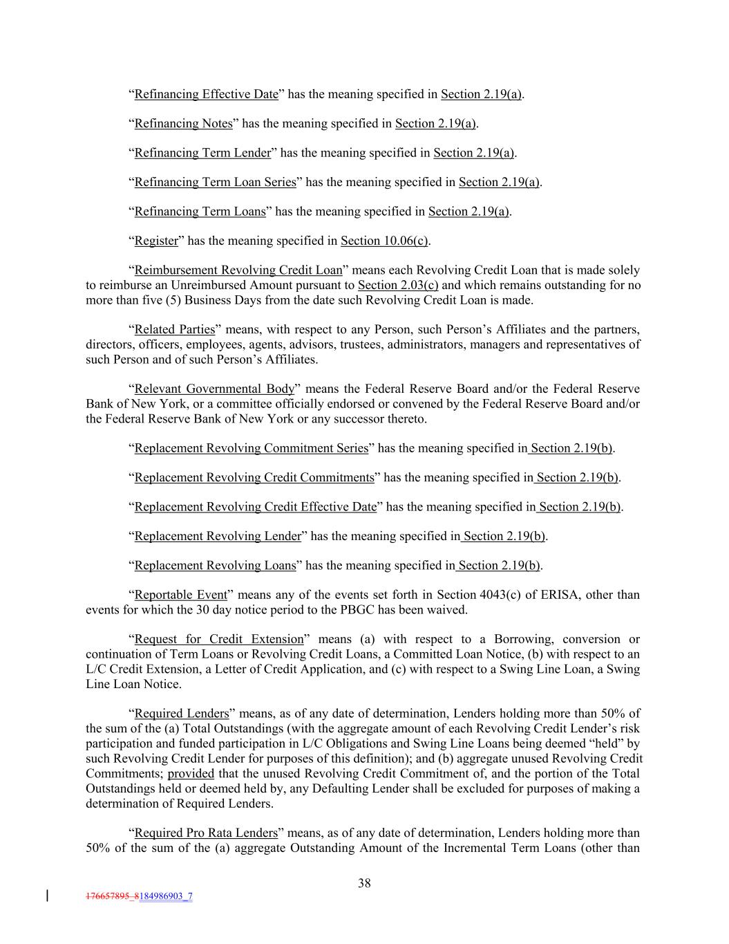 “Refinancing Effective Date” has the meaning specified in Section 2.19(a). “Refinancing Notes” has the meaning specified in Section 2.19(a). “Refinancing Term Lender” has the meaning specified in Section 2.19(a). “Refinancing Term Loan Series” has the meaning specified in Section 2.19(a). “Refinancing Term Loans” has the meaning specified in Section 2.19(a). “Register” has the meaning specified in Section 10.06(c). “Reimbursement Revolving Credit Loan” means each Revolving Credit Loan that is made solely to reimburse an Unreimbursed Amount pursuant to Section 2.03(c) and which remains outstanding for no more than five (5) Business Days from the date such Revolving Credit Loan is made. “Related Parties” means, with respect to any Person, such Person’s Affiliates and the partners, directors, officers, employees, agents, advisors, trustees, administrators, managers and representatives of such Person and of such Person’s Affiliates. “Relevant Governmental Body” means the Federal Reserve Board and/or the Federal Reserve Bank of New York, or a committee officially endorsed or convened by the Federal Reserve Board and/or the Federal Reserve Bank of New York or any successor thereto. “Replacement Revolving Commitment Series” has the meaning specified in Section 2.19(b). “Replacement Revolving Credit Commitments” has the meaning specified in Section 2.19(b). “Replacement Revolving Credit Effective Date” has the meaning specified in Section 2.19(b). “Replacement Revolving Lender” has the meaning specified in Section 2.19(b). “Replacement Revolving Loans” has the meaning specified in Section 2.19(b). “Reportable Event” means any of the events set forth in Section 4043(c) of ERISA, other than events for which the 30 day notice period to the PBGC has been waived. “Request for Credit Extension” means (a) with respect to a Borrowing, conversion or continuation of Term Loans or Revolving Credit Loans, a Committed Loan Notice, (b) with respect to an L/C Credit Extension, a Letter of Credit Application, and (c) with respect to a Swing Line Loan, a Swing Line Loan Notice. “Required Lenders” means, as of any date of determination, Lenders holding more than 50% of the sum of the (a) Total Outstandings (with the aggregate amount of each Revolving Credit Lender’s risk participation and funded participation in L/C Obligations and Swing Line Loans being deemed “held” by such Revolving Credit Lender for purposes of this definition); and (b) aggregate unused Revolving Credit Commitments; provided that the unused Revolving Credit Commitment of, and the portion of the Total Outstandings held or deemed held by, any Defaulting Lender shall be excluded for purposes of making a determination of Required Lenders. “Required Pro Rata Lenders” means, as of any date of determination, Lenders holding more than 50% of the sum of the (a) aggregate Outstanding Amount of the Incremental Term Loans (other than 38 176657895_8184986903_7