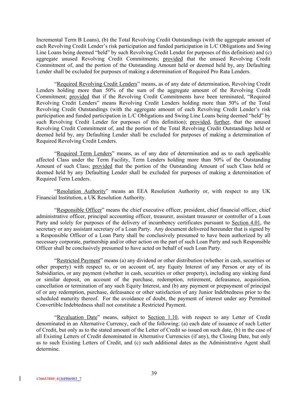 Incremental Term B Loans), (b) the Total Revolving Credit Outstandings (with the aggregate amount of each Revolving Credit Lender’s risk participation and funded participation in L/C Obligations and Swing Line Loans being deemed “held” by such Revolving Credit Lender for purposes of this definition) and (c) aggregate unused Revolving Credit Commitments; provided that the unused Revolving Credit Commitment of, and the portion of the Outstanding Amount held or deemed held by, any Defaulting Lender shall be excluded for purposes of making a determination of Required Pro Rata Lenders. “Required Revolving Credit Lenders” means, as of any date of determination, Revolving Credit Lenders holding more than 50% of the sum of the aggregate amount of the Revolving Credit Commitment; provided that if the Revolving Credit Commitments have been terminated, “Required Revolving Credit Lenders” means Revolving Credit Lenders holding more than 50% of the Total Revolving Credit Outstandings (with the aggregate amount of each Revolving Credit Lender’s risk participation and funded participation in L/C Obligations and Swing Line Loans being deemed “held” by such Revolving Credit Lender for purposes of this definition); provided, further, that the unused Revolving Credit Commitment of, and the portion of the Total Revolving Credit Outstandings held or deemed held by, any Defaulting Lender shall be excluded for purposes of making a determination of Required Revolving Credit Lenders. “Required Term Lenders” means, as of any date of determination and as to each applicable affected Class under the Term Facility, Term Lenders holding more than 50% of the Outstanding Amount of such Class; provided that the portion of the Outstanding Amount of such Class held or deemed held by any Defaulting Lender shall be excluded for purposes of making a determination of Required Term Lenders. “Resolution Authority” means an EEA Resolution Authority or, with respect to any UK Financial Institution, a UK Resolution Authority. “Responsible Officer” means the chief executive officer, president, chief financial officer, chief administrative officer, principal accounting officer, treasurer, assistant treasurer or controller of a Loan Party and solely for purposes of the delivery of incumbency certificates pursuant to Section 4.01, the secretary or any assistant secretary of a Loan Party. Any document delivered hereunder that is signed by a Responsible Officer of a Loan Party shall be conclusively presumed to have been authorized by all necessary corporate, partnership and/or other action on the part of such Loan Party and such Responsible Officer shall be conclusively presumed to have acted on behalf of such Loan Party. “Restricted Payment” means (a) any dividend or other distribution (whether in cash, securities or other property) with respect to, or on account of, any Equity Interest of any Person or any of its Subsidiaries, or any payment (whether in cash, securities or other property), including any sinking fund or similar deposit, on account of the purchase, redemption, retirement, defeasance, acquisition, cancellation or termination of any such Equity Interest, and (b) any payment or prepayment of principal of or any redemption, purchase, defeasance or other satisfaction of any Junior Indebtedness prior to the scheduled maturity thereof. For the avoidance of doubt, the payment of interest under any Permitted Convertible Indebtedness shall not constitute a Restricted Payment. “Revaluation Date” means, subject to Section 1.10, with respect to any Letter of Credit denominated in an Alternative Currency, each of the following: (a) each date of issuance of such Letter of Credit, but only as to the stated amount of the Letter of Credit so issued on such date, (b) in the case of all Existing Letters of Credit denominated in Alternative Currencies (if any), the Closing Date, but only as to such Existing Letters of Credit, and (c) such additional dates as the Administrative Agent shall determine. 39 176657895_8184986903_7