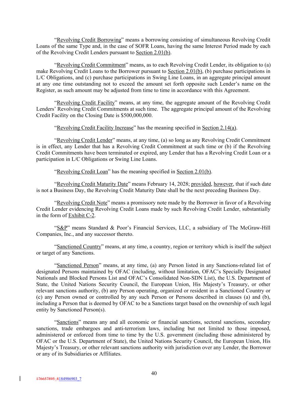 “Revolving Credit Borrowing” means a borrowing consisting of simultaneous Revolving Credit Loans of the same Type and, in the case of SOFR Loans, having the same Interest Period made by each of the Revolving Credit Lenders pursuant to Section 2.01(b). “Revolving Credit Commitment” means, as to each Revolving Credit Lender, its obligation to (a) make Revolving Credit Loans to the Borrower pursuant to Section 2.01(b), (b) purchase participations in L/C Obligations, and (c) purchase participations in Swing Line Loans, in an aggregate principal amount at any one time outstanding not to exceed the amount set forth opposite such Lender’s name on the Register, as such amount may be adjusted from time to time in accordance with this Agreement. “Revolving Credit Facility” means, at any time, the aggregate amount of the Revolving Credit Lenders’ Revolving Credit Commitments at such time. The aggregate principal amount of the Revolving Credit Facility on the Closing Date is $500,000,000. “Revolving Credit Facility Increase” has the meaning specified in Section 2.14(a). “Revolving Credit Lender” means, at any time, (a) so long as any Revolving Credit Commitment is in effect, any Lender that has a Revolving Credit Commitment at such time or (b) if the Revolving Credit Commitments have been terminated or expired, any Lender that has a Revolving Credit Loan or a participation in L/C Obligations or Swing Line Loans. “Revolving Credit Loan” has the meaning specified in Section 2.01(b). “Revolving Credit Maturity Date” means February 14, 2028; provided, however, that if such date is not a Business Day, the Revolving Credit Maturity Date shall be the next preceding Business Day. “Revolving Credit Note” means a promissory note made by the Borrower in favor of a Revolving Credit Lender evidencing Revolving Credit Loans made by such Revolving Credit Lender, substantially in the form of Exhibit C-2. “S&P” means Standard & Poor’s Financial Services, LLC, a subsidiary of The McGraw-Hill Companies, Inc., and any successor thereto. “Sanctioned Country” means, at any time, a country, region or territory which is itself the subject or target of any Sanctions. “Sanctioned Person” means, at any time, (a) any Person listed in any Sanctions-related list of designated Persons maintained by OFAC (including, without limitation, OFAC’s Specially Designated Nationals and Blocked Persons List and OFAC’s Consolidated Non-SDN List), the U.S. Department of State, the United Nations Security Council, the European Union, His Majesty’s Treasury, or other relevant sanctions authority, (b) any Person operating, organized or resident in a Sanctioned Country or (c) any Person owned or controlled by any such Person or Persons described in clauses (a) and (b), including a Person that is deemed by OFAC to be a Sanctions target based on the ownership of such legal entity by Sanctioned Person(s). “Sanctions” means any and all economic or financial sanctions, sectoral sanctions, secondary sanctions, trade embargoes and anti-terrorism laws, including but not limited to those imposed, administered or enforced from time to time by the U.S. government (including those administered by OFAC or the U.S. Department of State), the United Nations Security Council, the European Union, His Majesty’s Treasury, or other relevant sanctions authority with jurisdiction over any Lender, the Borrower or any of its Subsidiaries or Affiliates. 40 176657895_8184986903_7