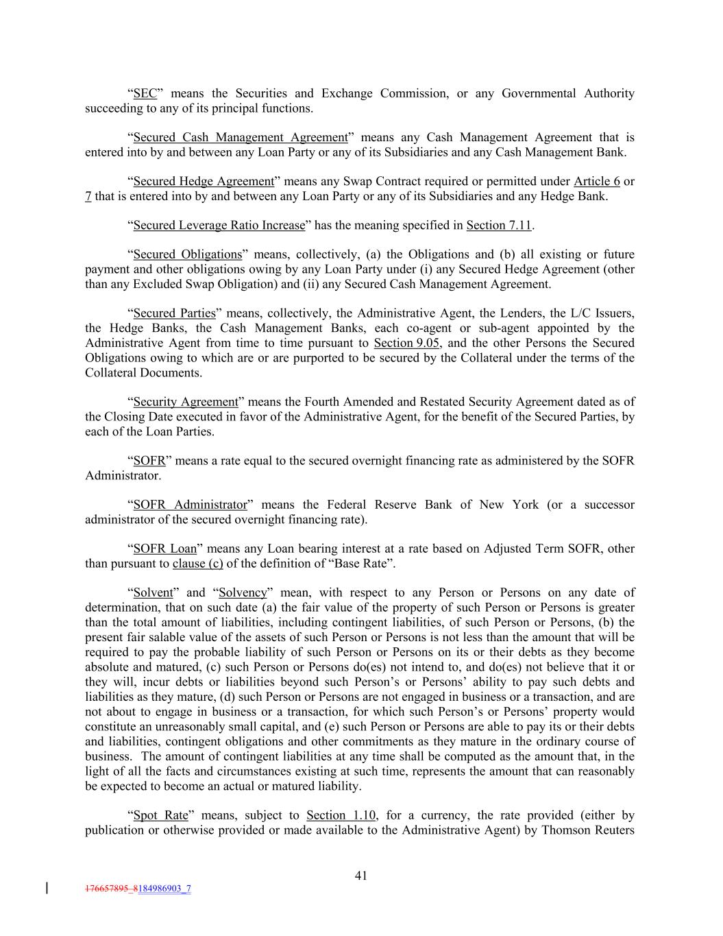 “SEC” means the Securities and Exchange Commission, or any Governmental Authority succeeding to any of its principal functions. “Secured Cash Management Agreement” means any Cash Management Agreement that is entered into by and between any Loan Party or any of its Subsidiaries and any Cash Management Bank. “Secured Hedge Agreement” means any Swap Contract required or permitted under Article 6 or 7 that is entered into by and between any Loan Party or any of its Subsidiaries and any Hedge Bank. “Secured Leverage Ratio Increase” has the meaning specified in Section 7.11. “Secured Obligations” means, collectively, (a) the Obligations and (b) all existing or future payment and other obligations owing by any Loan Party under (i) any Secured Hedge Agreement (other than any Excluded Swap Obligation) and (ii) any Secured Cash Management Agreement. “Secured Parties” means, collectively, the Administrative Agent, the Lenders, the L/C Issuers, the Hedge Banks, the Cash Management Banks, each co-agent or sub-agent appointed by the Administrative Agent from time to time pursuant to Section 9.05, and the other Persons the Secured Obligations owing to which are or are purported to be secured by the Collateral under the terms of the Collateral Documents. “Security Agreement” means the Fourth Amended and Restated Security Agreement dated as of the Closing Date executed in favor of the Administrative Agent, for the benefit of the Secured Parties, by each of the Loan Parties. “SOFR” means a rate equal to the secured overnight financing rate as administered by the SOFR Administrator. “SOFR Administrator” means the Federal Reserve Bank of New York (or a successor administrator of the secured overnight financing rate). “SOFR Loan” means any Loan bearing interest at a rate based on Adjusted Term SOFR, other than pursuant to clause (c) of the definition of “Base Rate”. “Solvent” and “Solvency” mean, with respect to any Person or Persons on any date of determination, that on such date (a) the fair value of the property of such Person or Persons is greater than the total amount of liabilities, including contingent liabilities, of such Person or Persons, (b) the present fair salable value of the assets of such Person or Persons is not less than the amount that will be required to pay the probable liability of such Person or Persons on its or their debts as they become absolute and matured, (c) such Person or Persons do(es) not intend to, and do(es) not believe that it or they will, incur debts or liabilities beyond such Person’s or Persons’ ability to pay such debts and liabilities as they mature, (d) such Person or Persons are not engaged in business or a transaction, and are not about to engage in business or a transaction, for which such Person’s or Persons’ property would constitute an unreasonably small capital, and (e) such Person or Persons are able to pay its or their debts and liabilities, contingent obligations and other commitments as they mature in the ordinary course of business. The amount of contingent liabilities at any time shall be computed as the amount that, in the light of all the facts and circumstances existing at such time, represents the amount that can reasonably be expected to become an actual or matured liability. “Spot Rate” means, subject to Section 1.10, for a currency, the rate provided (either by publication or otherwise provided or made available to the Administrative Agent) by Thomson Reuters 41 176657895_8184986903_7