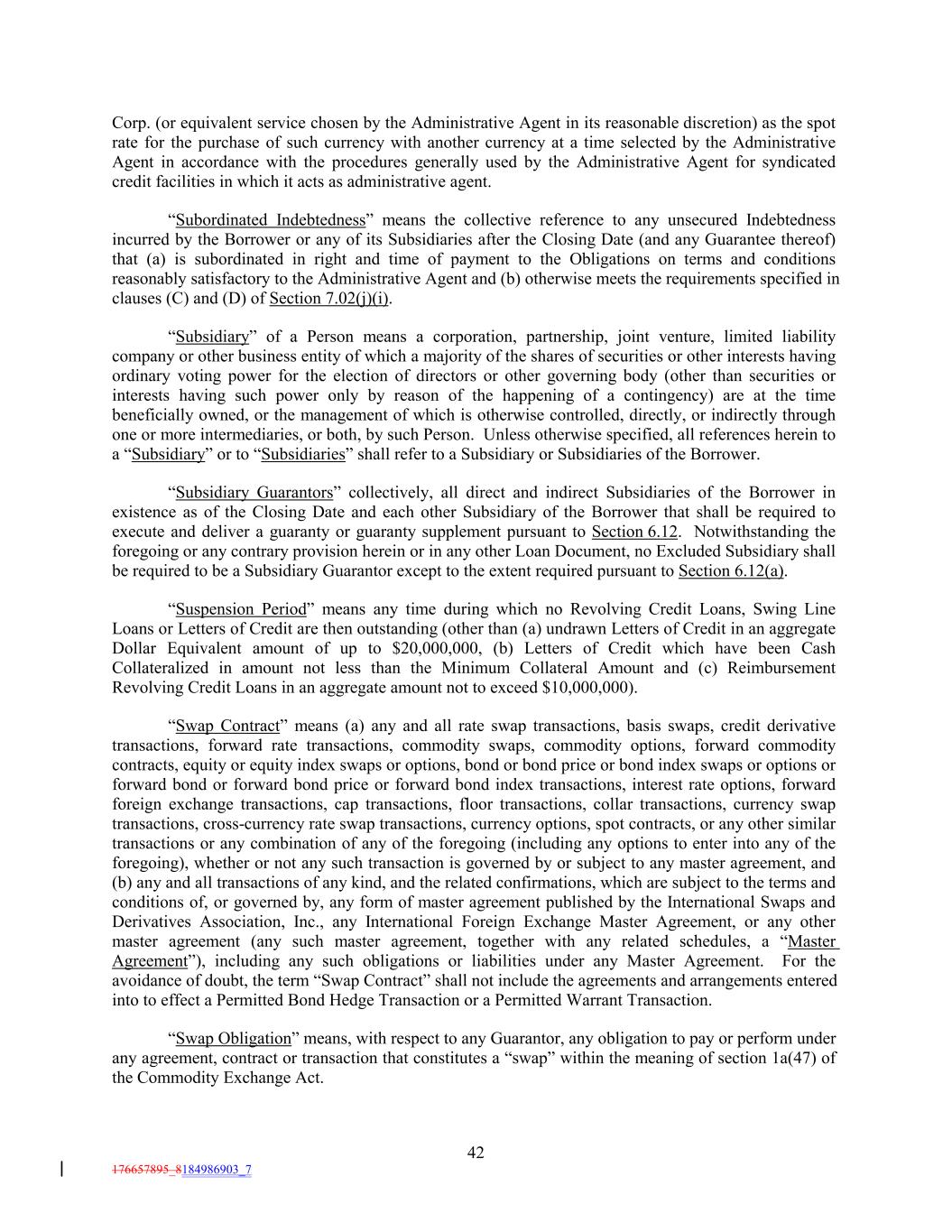 Corp. (or equivalent service chosen by the Administrative Agent in its reasonable discretion) as the spot rate for the purchase of such currency with another currency at a time selected by the Administrative Agent in accordance with the procedures generally used by the Administrative Agent for syndicated credit facilities in which it acts as administrative agent. “Subordinated Indebtedness” means the collective reference to any unsecured Indebtedness incurred by the Borrower or any of its Subsidiaries after the Closing Date (and any Guarantee thereof) that (a) is subordinated in right and time of payment to the Obligations on terms and conditions reasonably satisfactory to the Administrative Agent and (b) otherwise meets the requirements specified in clauses (C) and (D) of Section 7.02(j)(i). “Subsidiary” of a Person means a corporation, partnership, joint venture, limited liability company or other business entity of which a majority of the shares of securities or other interests having ordinary voting power for the election of directors or other governing body (other than securities or interests having such power only by reason of the happening of a contingency) are at the time beneficially owned, or the management of which is otherwise controlled, directly, or indirectly through one or more intermediaries, or both, by such Person. Unless otherwise specified, all references herein to a “Subsidiary” or to “Subsidiaries” shall refer to a Subsidiary or Subsidiaries of the Borrower. “Subsidiary Guarantors” collectively, all direct and indirect Subsidiaries of the Borrower in existence as of the Closing Date and each other Subsidiary of the Borrower that shall be required to execute and deliver a guaranty or guaranty supplement pursuant to Section 6.12. Notwithstanding the foregoing or any contrary provision herein or in any other Loan Document, no Excluded Subsidiary shall be required to be a Subsidiary Guarantor except to the extent required pursuant to Section 6.12(a). “Suspension Period” means any time during which no Revolving Credit Loans, Swing Line Loans or Letters of Credit are then outstanding (other than (a) undrawn Letters of Credit in an aggregate Dollar Equivalent amount of up to $20,000,000, (b) Letters of Credit which have been Cash Collateralized in amount not less than the Minimum Collateral Amount and (c) Reimbursement Revolving Credit Loans in an aggregate amount not to exceed $10,000,000). “Swap Contract” means (a) any and all rate swap transactions, basis swaps, credit derivative transactions, forward rate transactions, commodity swaps, commodity options, forward commodity contracts, equity or equity index swaps or options, bond or bond price or bond index swaps or options or forward bond or forward bond price or forward bond index transactions, interest rate options, forward foreign exchange transactions, cap transactions, floor transactions, collar transactions, currency swap transactions, cross-currency rate swap transactions, currency options, spot contracts, or any other similar transactions or any combination of any of the foregoing (including any options to enter into any of the foregoing), whether or not any such transaction is governed by or subject to any master agreement, and (b) any and all transactions of any kind, and the related confirmations, which are subject to the terms and conditions of, or governed by, any form of master agreement published by the International Swaps and Derivatives Association, Inc., any International Foreign Exchange Master Agreement, or any other master agreement (any such master agreement, together with any related schedules, a “Master Agreement”), including any such obligations or liabilities under any Master Agreement. For the avoidance of doubt, the term “Swap Contract” shall not include the agreements and arrangements entered into to effect a Permitted Bond Hedge Transaction or a Permitted Warrant Transaction. “Swap Obligation” means, with respect to any Guarantor, any obligation to pay or perform under any agreement, contract or transaction that constitutes a “swap” within the meaning of section 1a(47) of the Commodity Exchange Act. 42 176657895_8184986903_7