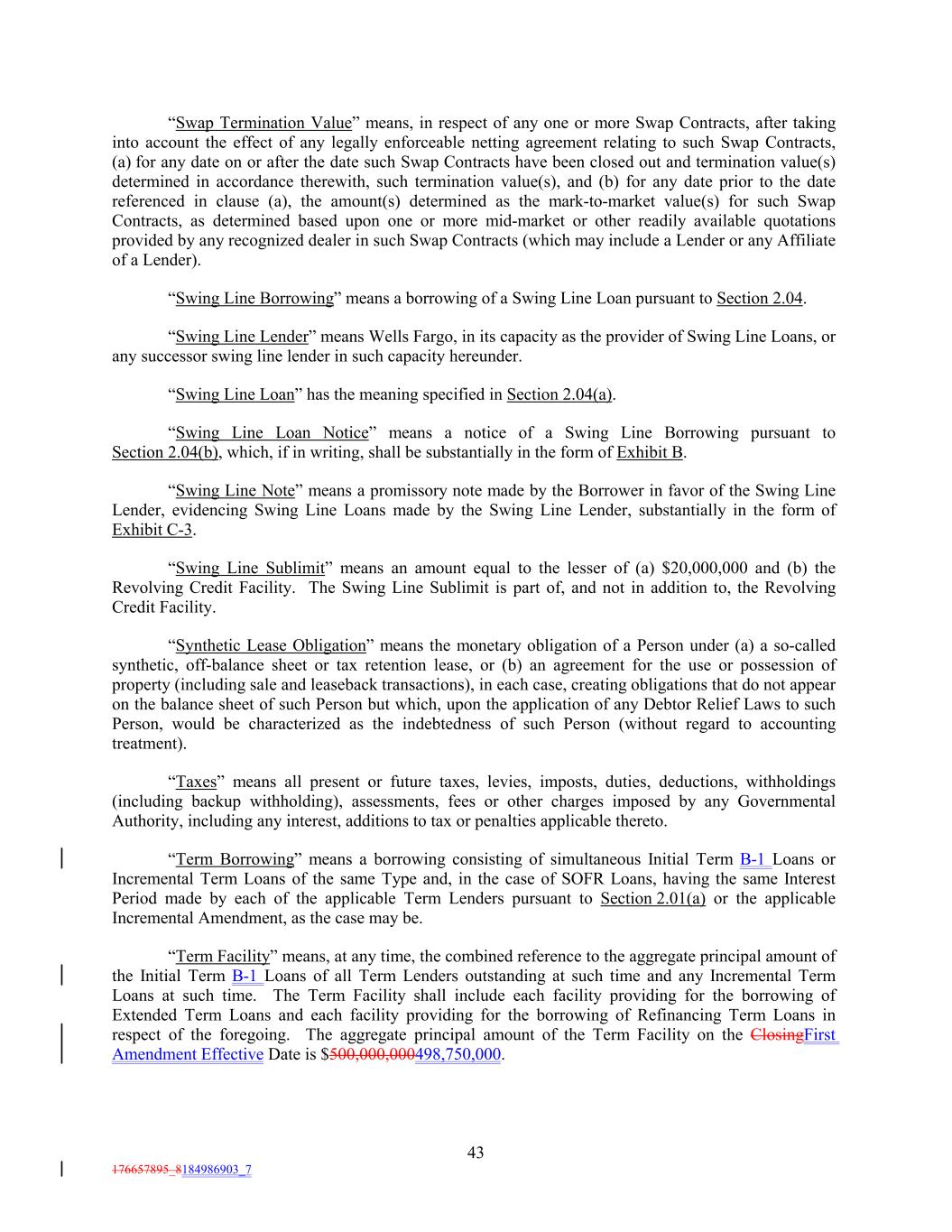 “Swap Termination Value” means, in respect of any one or more Swap Contracts, after taking into account the effect of any legally enforceable netting agreement relating to such Swap Contracts, (a) for any date on or after the date such Swap Contracts have been closed out and termination value(s) determined in accordance therewith, such termination value(s), and (b) for any date prior to the date referenced in clause (a), the amount(s) determined as the mark-to-market value(s) for such Swap Contracts, as determined based upon one or more mid-market or other readily available quotations provided by any recognized dealer in such Swap Contracts (which may include a Lender or any Affiliate of a Lender). “Swing Line Borrowing” means a borrowing of a Swing Line Loan pursuant to Section 2.04. “Swing Line Lender” means Wells Fargo, in its capacity as the provider of Swing Line Loans, or any successor swing line lender in such capacity hereunder. “Swing Line Loan” has the meaning specified in Section 2.04(a). “Swing Line Loan Notice” means a notice of a Swing Line Borrowing pursuant to Section 2.04(b), which, if in writing, shall be substantially in the form of Exhibit B. “Swing Line Note” means a promissory note made by the Borrower in favor of the Swing Line Lender, evidencing Swing Line Loans made by the Swing Line Lender, substantially in the form of Exhibit C-3. “Swing Line Sublimit” means an amount equal to the lesser of (a) $20,000,000 and (b) the Revolving Credit Facility. The Swing Line Sublimit is part of, and not in addition to, the Revolving Credit Facility. “Synthetic Lease Obligation” means the monetary obligation of a Person under (a) a so-called synthetic, off-balance sheet or tax retention lease, or (b) an agreement for the use or possession of property (including sale and leaseback transactions), in each case, creating obligations that do not appear on the balance sheet of such Person but which, upon the application of any Debtor Relief Laws to such Person, would be characterized as the indebtedness of such Person (without regard to accounting treatment). “Taxes” means all present or future taxes, levies, imposts, duties, deductions, withholdings (including backup withholding), assessments, fees or other charges imposed by any Governmental Authority, including any interest, additions to tax or penalties applicable thereto. “Term Borrowing” means a borrowing consisting of simultaneous Initial Term B-1 Loans or Incremental Term Loans of the same Type and, in the case of SOFR Loans, having the same Interest Period made by each of the applicable Term Lenders pursuant to Section 2.01(a) or the applicable Incremental Amendment, as the case may be. “Term Facility” means, at any time, the combined reference to the aggregate principal amount of the Initial Term B-1 Loans of all Term Lenders outstanding at such time and any Incremental Term Loans at such time. The Term Facility shall include each facility providing for the borrowing of Extended Term Loans and each facility providing for the borrowing of Refinancing Term Loans in respect of the foregoing. The aggregate principal amount of the Term Facility on the ClosingFirst Amendment Effective Date is $500,000,000498,750,000. 43 176657895_8184986903_7