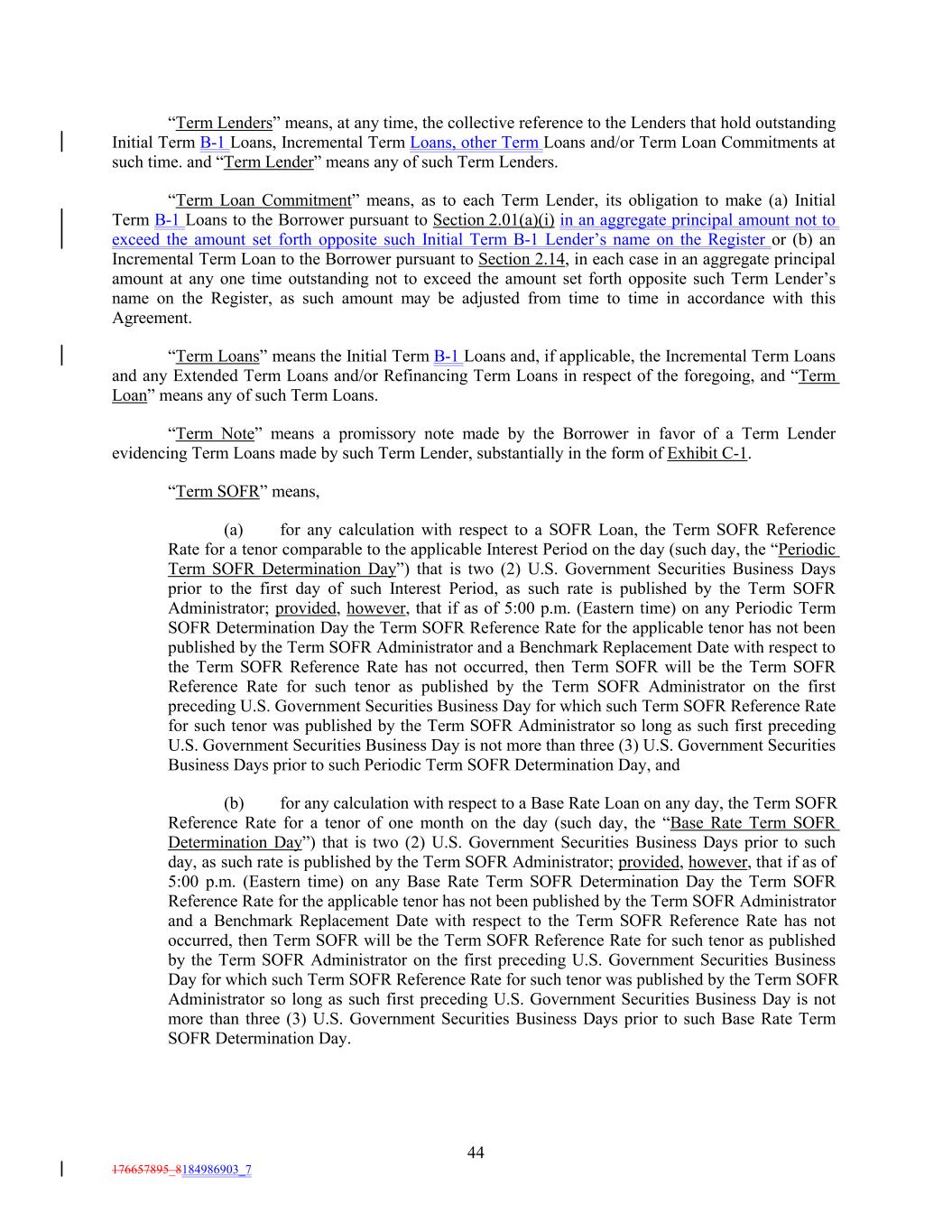“Term Lenders” means, at any time, the collective reference to the Lenders that hold outstanding Initial Term B-1 Loans, Incremental Term Loans, other Term Loans and/or Term Loan Commitments at such time. and “Term Lender” means any of such Term Lenders. “Term Loan Commitment” means, as to each Term Lender, its obligation to make (a) Initial Term B-1 Loans to the Borrower pursuant to Section 2.01(a)(i) in an aggregate principal amount not to exceed the amount set forth opposite such Initial Term B-1 Lender’s name on the Register or (b) an Incremental Term Loan to the Borrower pursuant to Section 2.14, in each case in an aggregate principal amount at any one time outstanding not to exceed the amount set forth opposite such Term Lender’s name on the Register, as such amount may be adjusted from time to time in accordance with this Agreement. “Term Loans” means the Initial Term B-1 Loans and, if applicable, the Incremental Term Loans and any Extended Term Loans and/or Refinancing Term Loans in respect of the foregoing, and “Term Loan” means any of such Term Loans. “Term Note” means a promissory note made by the Borrower in favor of a Term Lender evidencing Term Loans made by such Term Lender, substantially in the form of Exhibit C-1. “Term SOFR” means, (a) for any calculation with respect to a SOFR Loan, the Term SOFR Reference Rate for a tenor comparable to the applicable Interest Period on the day (such day, the “Periodic Term SOFR Determination Day”) that is two (2) U.S. Government Securities Business Days prior to the first day of such Interest Period, as such rate is published by the Term SOFR Administrator; provided, however, that if as of 5:00 p.m. (Eastern time) on any Periodic Term SOFR Determination Day the Term SOFR Reference Rate for the applicable tenor has not been published by the Term SOFR Administrator and a Benchmark Replacement Date with respect to the Term SOFR Reference Rate has not occurred, then Term SOFR will be the Term SOFR Reference Rate for such tenor as published by the Term SOFR Administrator on the first preceding U.S. Government Securities Business Day for which such Term SOFR Reference Rate for such tenor was published by the Term SOFR Administrator so long as such first preceding U.S. Government Securities Business Day is not more than three (3) U.S. Government Securities Business Days prior to such Periodic Term SOFR Determination Day, and (b) for any calculation with respect to a Base Rate Loan on any day, the Term SOFR Reference Rate for a tenor of one month on the day (such day, the “Base Rate Term SOFR Determination Day”) that is two (2) U.S. Government Securities Business Days prior to such day, as such rate is published by the Term SOFR Administrator; provided, however, that if as of 5:00 p.m. (Eastern time) on any Base Rate Term SOFR Determination Day the Term SOFR Reference Rate for the applicable tenor has not been published by the Term SOFR Administrator and a Benchmark Replacement Date with respect to the Term SOFR Reference Rate has not occurred, then Term SOFR will be the Term SOFR Reference Rate for such tenor as published by the Term SOFR Administrator on the first preceding U.S. Government Securities Business Day for which such Term SOFR Reference Rate for such tenor was published by the Term SOFR Administrator so long as such first preceding U.S. Government Securities Business Day is not more than three (3) U.S. Government Securities Business Days prior to such Base Rate Term SOFR Determination Day. 44 176657895_8184986903_7