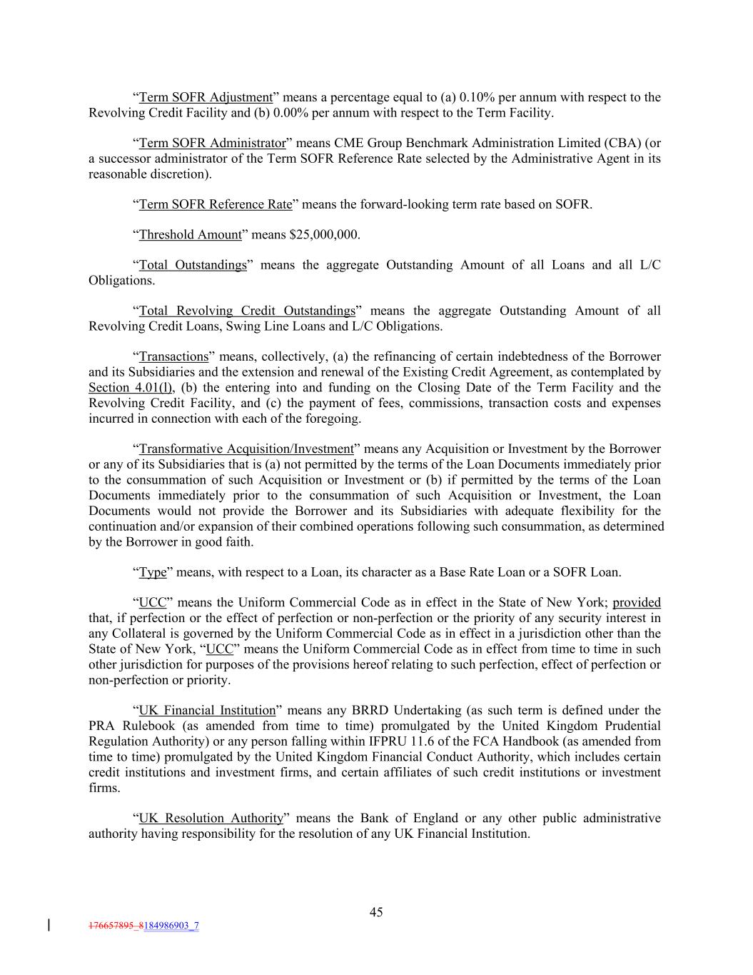 “Term SOFR Adjustment” means a percentage equal to (a) 0.10% per annum with respect to the Revolving Credit Facility and (b) 0.00% per annum with respect to the Term Facility. “Term SOFR Administrator” means CME Group Benchmark Administration Limited (CBA) (or a successor administrator of the Term SOFR Reference Rate selected by the Administrative Agent in its reasonable discretion). “Term SOFR Reference Rate” means the forward-looking term rate based on SOFR. “Threshold Amount” means $25,000,000. “Total Outstandings” means the aggregate Outstanding Amount of all Loans and all L/C Obligations. “Total Revolving Credit Outstandings” means the aggregate Outstanding Amount of all Revolving Credit Loans, Swing Line Loans and L/C Obligations. “Transactions” means, collectively, (a) the refinancing of certain indebtedness of the Borrower and its Subsidiaries and the extension and renewal of the Existing Credit Agreement, as contemplated by Section 4.01(l), (b) the entering into and funding on the Closing Date of the Term Facility and the Revolving Credit Facility, and (c) the payment of fees, commissions, transaction costs and expenses incurred in connection with each of the foregoing. “Transformative Acquisition/Investment” means any Acquisition or Investment by the Borrower or any of its Subsidiaries that is (a) not permitted by the terms of the Loan Documents immediately prior to the consummation of such Acquisition or Investment or (b) if permitted by the terms of the Loan Documents immediately prior to the consummation of such Acquisition or Investment, the Loan Documents would not provide the Borrower and its Subsidiaries with adequate flexibility for the continuation and/or expansion of their combined operations following such consummation, as determined by the Borrower in good faith. “Type” means, with respect to a Loan, its character as a Base Rate Loan or a SOFR Loan. “UCC” means the Uniform Commercial Code as in effect in the State of New York; provided that, if perfection or the effect of perfection or non-perfection or the priority of any security interest in any Collateral is governed by the Uniform Commercial Code as in effect in a jurisdiction other than the State of New York, “UCC” means the Uniform Commercial Code as in effect from time to time in such other jurisdiction for purposes of the provisions hereof relating to such perfection, effect of perfection or non-perfection or priority. “UK Financial Institution” means any BRRD Undertaking (as such term is defined under the PRA Rulebook (as amended from time to time) promulgated by the United Kingdom Prudential Regulation Authority) or any person falling within IFPRU 11.6 of the FCA Handbook (as amended from time to time) promulgated by the United Kingdom Financial Conduct Authority, which includes certain credit institutions and investment firms, and certain affiliates of such credit institutions or investment firms. “UK Resolution Authority” means the Bank of England or any other public administrative authority having responsibility for the resolution of any UK Financial Institution. 45 176657895_8184986903_7