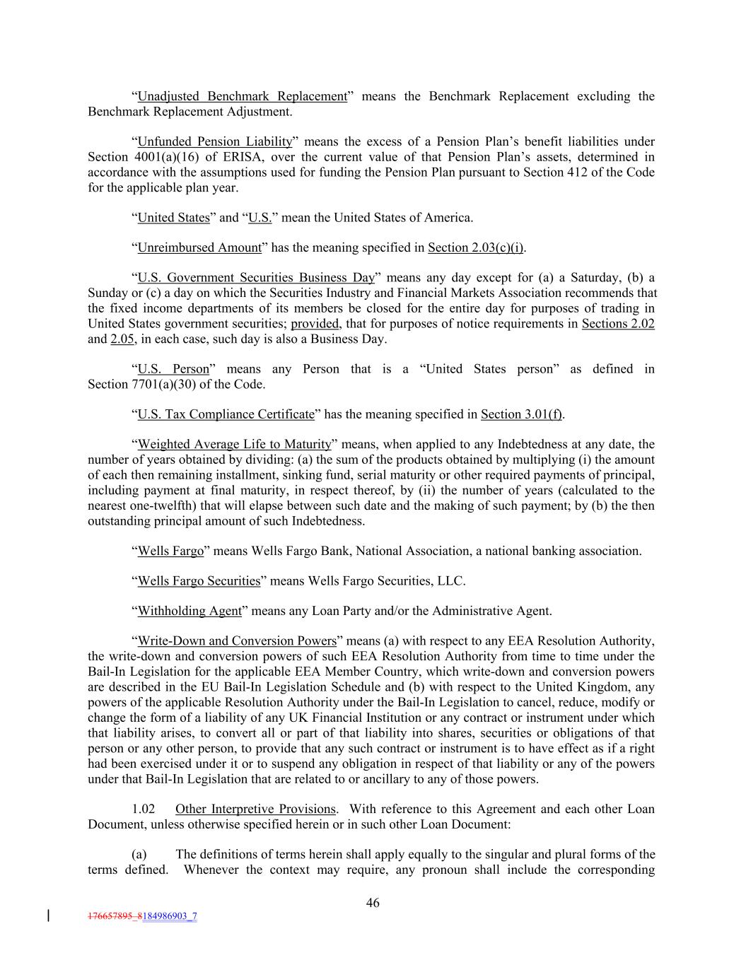“Unadjusted Benchmark Replacement” means the Benchmark Replacement excluding the Benchmark Replacement Adjustment. “Unfunded Pension Liability” means the excess of a Pension Plan’s benefit liabilities under Section 4001(a)(16) of ERISA, over the current value of that Pension Plan’s assets, determined in accordance with the assumptions used for funding the Pension Plan pursuant to Section 412 of the Code for the applicable plan year. “United States” and “U.S.” mean the United States of America. “Unreimbursed Amount” has the meaning specified in Section 2.03(c)(i). “U.S. Government Securities Business Day” means any day except for (a) a Saturday, (b) a Sunday or (c) a day on which the Securities Industry and Financial Markets Association recommends that the fixed income departments of its members be closed for the entire day for purposes of trading in United States government securities; provided, that for purposes of notice requirements in Sections 2.02 and 2.05, in each case, such day is also a Business Day. “U.S. Person” means any Person that is a “United States person” as defined in Section 7701(a)(30) of the Code. “U.S. Tax Compliance Certificate” has the meaning specified in Section 3.01(f). “Weighted Average Life to Maturity” means, when applied to any Indebtedness at any date, the number of years obtained by dividing: (a) the sum of the products obtained by multiplying (i) the amount of each then remaining installment, sinking fund, serial maturity or other required payments of principal, including payment at final maturity, in respect thereof, by (ii) the number of years (calculated to the nearest one-twelfth) that will elapse between such date and the making of such payment; by (b) the then outstanding principal amount of such Indebtedness. “Wells Fargo” means Wells Fargo Bank, National Association, a national banking association. “Wells Fargo Securities” means Wells Fargo Securities, LLC. “Withholding Agent” means any Loan Party and/or the Administrative Agent. “Write-Down and Conversion Powers” means (a) with respect to any EEA Resolution Authority, the write-down and conversion powers of such EEA Resolution Authority from time to time under the Bail-In Legislation for the applicable EEA Member Country, which write-down and conversion powers are described in the EU Bail-In Legislation Schedule and (b) with respect to the United Kingdom, any powers of the applicable Resolution Authority under the Bail-In Legislation to cancel, reduce, modify or change the form of a liability of any UK Financial Institution or any contract or instrument under which that liability arises, to convert all or part of that liability into shares, securities or obligations of that person or any other person, to provide that any such contract or instrument is to have effect as if a right had been exercised under it or to suspend any obligation in respect of that liability or any of the powers under that Bail-In Legislation that are related to or ancillary to any of those powers. 1.02 Other Interpretive Provisions. With reference to this Agreement and each other Loan Document, unless otherwise specified herein or in such other Loan Document: (a) The definitions of terms herein shall apply equally to the singular and plural forms of the terms defined. Whenever the context may require, any pronoun shall include the corresponding 46 176657895_8184986903_7