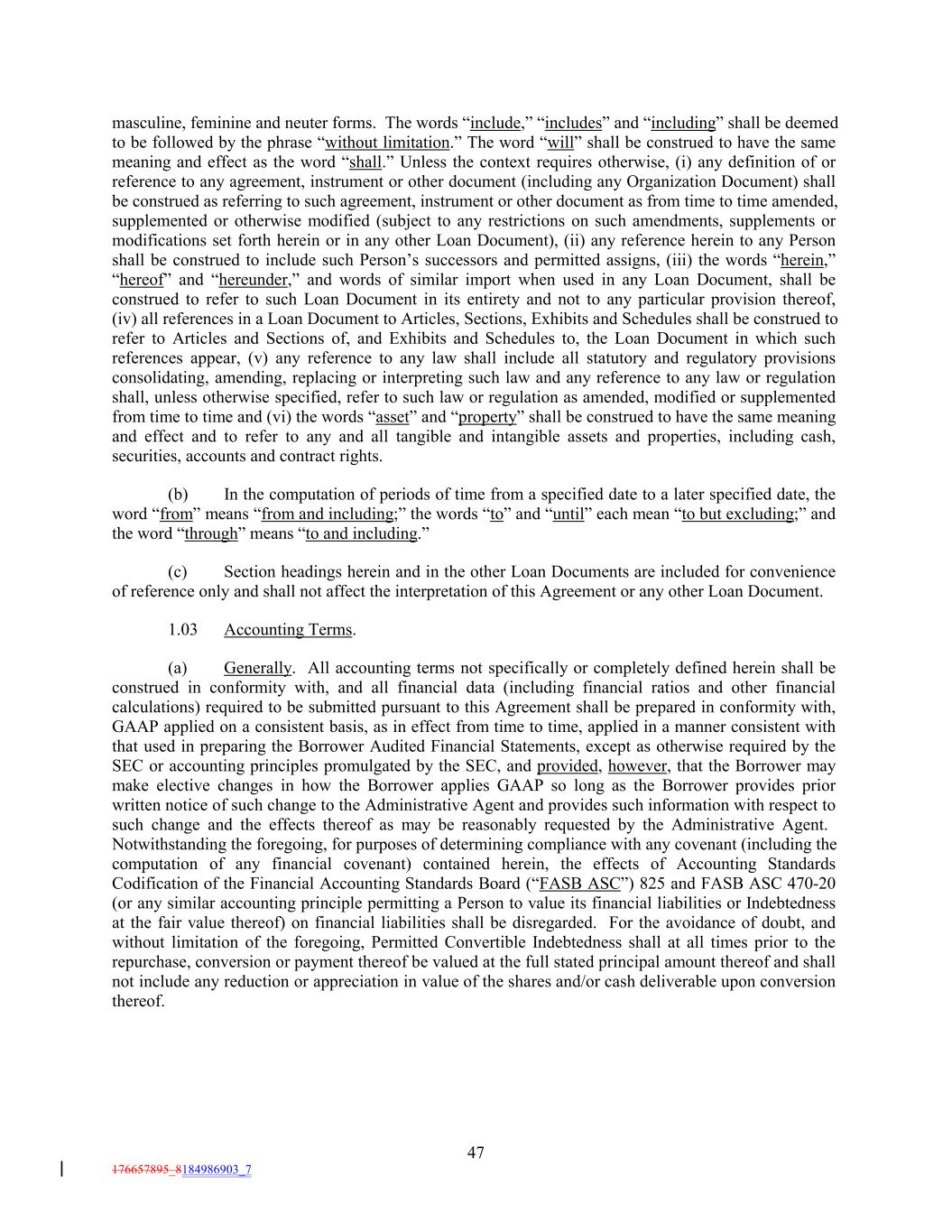 masculine, feminine and neuter forms. The words “include,” “includes” and “including” shall be deemed to be followed by the phrase “without limitation.” The word “will” shall be construed to have the same meaning and effect as the word “shall.” Unless the context requires otherwise, (i) any definition of or reference to any agreement, instrument or other document (including any Organization Document) shall be construed as referring to such agreement, instrument or other document as from time to time amended, supplemented or otherwise modified (subject to any restrictions on such amendments, supplements or modifications set forth herein or in any other Loan Document), (ii) any reference herein to any Person shall be construed to include such Person’s successors and permitted assigns, (iii) the words “herein,” “hereof” and “hereunder,” and words of similar import when used in any Loan Document, shall be construed to refer to such Loan Document in its entirety and not to any particular provision thereof, (iv) all references in a Loan Document to Articles, Sections, Exhibits and Schedules shall be construed to refer to Articles and Sections of, and Exhibits and Schedules to, the Loan Document in which such references appear, (v) any reference to any law shall include all statutory and regulatory provisions consolidating, amending, replacing or interpreting such law and any reference to any law or regulation shall, unless otherwise specified, refer to such law or regulation as amended, modified or supplemented from time to time and (vi) the words “asset” and “property” shall be construed to have the same meaning and effect and to refer to any and all tangible and intangible assets and properties, including cash, securities, accounts and contract rights. (b) In the computation of periods of time from a specified date to a later specified date, the word “from” means “from and including;” the words “to” and “until” each mean “to but excluding;” and the word “through” means “to and including.” (c) Section headings herein and in the other Loan Documents are included for convenience of reference only and shall not affect the interpretation of this Agreement or any other Loan Document. 1.03 Accounting Terms. (a) Generally. All accounting terms not specifically or completely defined herein shall be construed in conformity with, and all financial data (including financial ratios and other financial calculations) required to be submitted pursuant to this Agreement shall be prepared in conformity with, GAAP applied on a consistent basis, as in effect from time to time, applied in a manner consistent with that used in preparing the Borrower Audited Financial Statements, except as otherwise required by the SEC or accounting principles promulgated by the SEC, and provided, however, that the Borrower may make elective changes in how the Borrower applies GAAP so long as the Borrower provides prior written notice of such change to the Administrative Agent and provides such information with respect to such change and the effects thereof as may be reasonably requested by the Administrative Agent. Notwithstanding the foregoing, for purposes of determining compliance with any covenant (including the computation of any financial covenant) contained herein, the effects of Accounting Standards Codification of the Financial Accounting Standards Board (“FASB ASC”) 825 and FASB ASC 470-20 (or any similar accounting principle permitting a Person to value its financial liabilities or Indebtedness at the fair value thereof) on financial liabilities shall be disregarded. For the avoidance of doubt, and without limitation of the foregoing, Permitted Convertible Indebtedness shall at all times prior to the repurchase, conversion or payment thereof be valued at the full stated principal amount thereof and shall not include any reduction or appreciation in value of the shares and/or cash deliverable upon conversion thereof. 47 176657895_8184986903_7