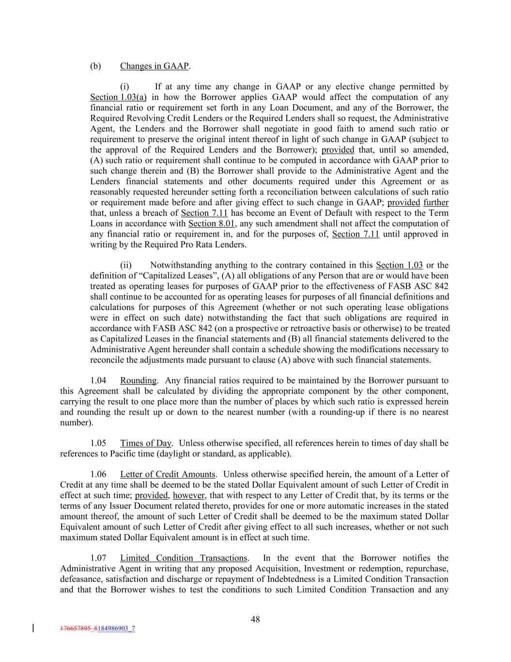 (b) Changes in GAAP. (i) If at any time any change in GAAP or any elective change permitted by Section 1.03(a) in how the Borrower applies GAAP would affect the computation of any financial ratio or requirement set forth in any Loan Document, and any of the Borrower, the Required Revolving Credit Lenders or the Required Lenders shall so request, the Administrative Agent, the Lenders and the Borrower shall negotiate in good faith to amend such ratio or requirement to preserve the original intent thereof in light of such change in GAAP (subject to the approval of the Required Lenders and the Borrower); provided that, until so amended, (A) such ratio or requirement shall continue to be computed in accordance with GAAP prior to such change therein and (B) the Borrower shall provide to the Administrative Agent and the Lenders financial statements and other documents required under this Agreement or as reasonably requested hereunder setting forth a reconciliation between calculations of such ratio or requirement made before and after giving effect to such change in GAAP; provided further that, unless a breach of Section 7.11 has become an Event of Default with respect to the Term Loans in accordance with Section 8.01, any such amendment shall not affect the computation of any financial ratio or requirement in, and for the purposes of, Section 7.11 until approved in writing by the Required Pro Rata Lenders. (ii) Notwithstanding anything to the contrary contained in this Section 1.03 or the definition of “Capitalized Leases”, (A) all obligations of any Person that are or would have been treated as operating leases for purposes of GAAP prior to the effectiveness of FASB ASC 842 shall continue to be accounted for as operating leases for purposes of all financial definitions and calculations for purposes of this Agreement (whether or not such operating lease obligations were in effect on such date) notwithstanding the fact that such obligations are required in accordance with FASB ASC 842 (on a prospective or retroactive basis or otherwise) to be treated as Capitalized Leases in the financial statements and (B) all financial statements delivered to the Administrative Agent hereunder shall contain a schedule showing the modifications necessary to reconcile the adjustments made pursuant to clause (A) above with such financial statements. 1.04 Rounding. Any financial ratios required to be maintained by the Borrower pursuant to this Agreement shall be calculated by dividing the appropriate component by the other component, carrying the result to one place more than the number of places by which such ratio is expressed herein and rounding the result up or down to the nearest number (with a rounding-up if there is no nearest number). 1.05 Times of Day. Unless otherwise specified, all references herein to times of day shall be references to Pacific time (daylight or standard, as applicable). 1.06 Letter of Credit Amounts. Unless otherwise specified herein, the amount of a Letter of Credit at any time shall be deemed to be the stated Dollar Equivalent amount of such Letter of Credit in effect at such time; provided, however, that with respect to any Letter of Credit that, by its terms or the terms of any Issuer Document related thereto, provides for one or more automatic increases in the stated amount thereof, the amount of such Letter of Credit shall be deemed to be the maximum stated Dollar Equivalent amount of such Letter of Credit after giving effect to all such increases, whether or not such maximum stated Dollar Equivalent amount is in effect at such time. 1.07 Limited Condition Transactions. In the event that the Borrower notifies the Administrative Agent in writing that any proposed Acquisition, Investment or redemption, repurchase, defeasance, satisfaction and discharge or repayment of Indebtedness is a Limited Condition Transaction and that the Borrower wishes to test the conditions to such Limited Condition Transaction and any 48 176657895_8184986903_7