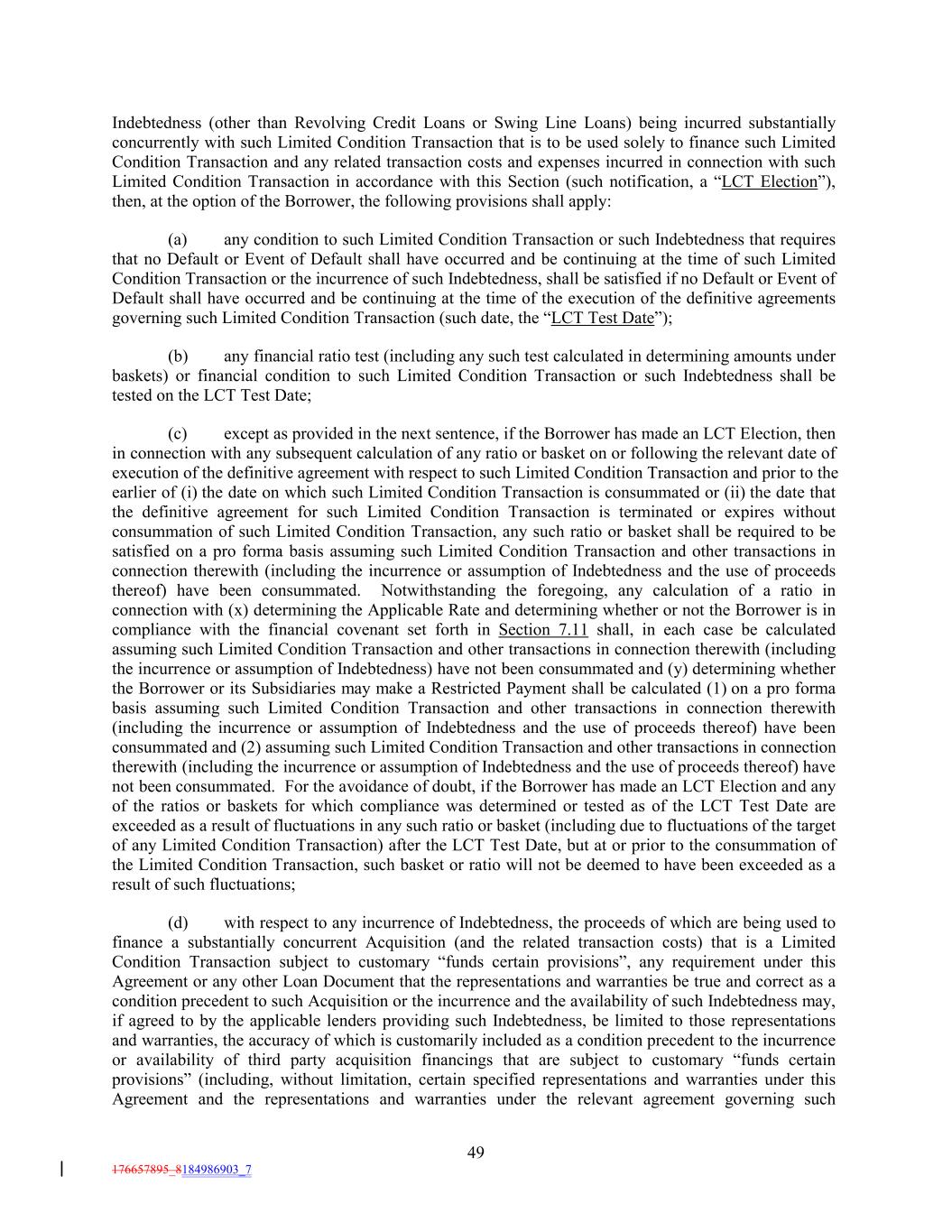 Indebtedness (other than Revolving Credit Loans or Swing Line Loans) being incurred substantially concurrently with such Limited Condition Transaction that is to be used solely to finance such Limited Condition Transaction and any related transaction costs and expenses incurred in connection with such Limited Condition Transaction in accordance with this Section (such notification, a “LCT Election”), then, at the option of the Borrower, the following provisions shall apply: (a) any condition to such Limited Condition Transaction or such Indebtedness that requires that no Default or Event of Default shall have occurred and be continuing at the time of such Limited Condition Transaction or the incurrence of such Indebtedness, shall be satisfied if no Default or Event of Default shall have occurred and be continuing at the time of the execution of the definitive agreements governing such Limited Condition Transaction (such date, the “LCT Test Date”); (b) any financial ratio test (including any such test calculated in determining amounts under baskets) or financial condition to such Limited Condition Transaction or such Indebtedness shall be tested on the LCT Test Date; (c) except as provided in the next sentence, if the Borrower has made an LCT Election, then in connection with any subsequent calculation of any ratio or basket on or following the relevant date of execution of the definitive agreement with respect to such Limited Condition Transaction and prior to the earlier of (i) the date on which such Limited Condition Transaction is consummated or (ii) the date that the definitive agreement for such Limited Condition Transaction is terminated or expires without consummation of such Limited Condition Transaction, any such ratio or basket shall be required to be satisfied on a pro forma basis assuming such Limited Condition Transaction and other transactions in connection therewith (including the incurrence or assumption of Indebtedness and the use of proceeds thereof) have been consummated. Notwithstanding the foregoing, any calculation of a ratio in connection with (x) determining the Applicable Rate and determining whether or not the Borrower is in compliance with the financial covenant set forth in Section 7.11 shall, in each case be calculated assuming such Limited Condition Transaction and other transactions in connection therewith (including the incurrence or assumption of Indebtedness) have not been consummated and (y) determining whether the Borrower or its Subsidiaries may make a Restricted Payment shall be calculated (1) on a pro forma basis assuming such Limited Condition Transaction and other transactions in connection therewith (including the incurrence or assumption of Indebtedness and the use of proceeds thereof) have been consummated and (2) assuming such Limited Condition Transaction and other transactions in connection therewith (including the incurrence or assumption of Indebtedness and the use of proceeds thereof) have not been consummated. For the avoidance of doubt, if the Borrower has made an LCT Election and any of the ratios or baskets for which compliance was determined or tested as of the LCT Test Date are exceeded as a result of fluctuations in any such ratio or basket (including due to fluctuations of the target of any Limited Condition Transaction) after the LCT Test Date, but at or prior to the consummation of the Limited Condition Transaction, such basket or ratio will not be deemed to have been exceeded as a result of such fluctuations; (d) with respect to any incurrence of Indebtedness, the proceeds of which are being used to finance a substantially concurrent Acquisition (and the related transaction costs) that is a Limited Condition Transaction subject to customary “funds certain provisions”, any requirement under this Agreement or any other Loan Document that the representations and warranties be true and correct as a condition precedent to such Acquisition or the incurrence and the availability of such Indebtedness may, if agreed to by the applicable lenders providing such Indebtedness, be limited to those representations and warranties, the accuracy of which is customarily included as a condition precedent to the incurrence or availability of third party acquisition financings that are subject to customary “funds certain provisions” (including, without limitation, certain specified representations and warranties under this Agreement and the representations and warranties under the relevant agreement governing such 49 176657895_8184986903_7