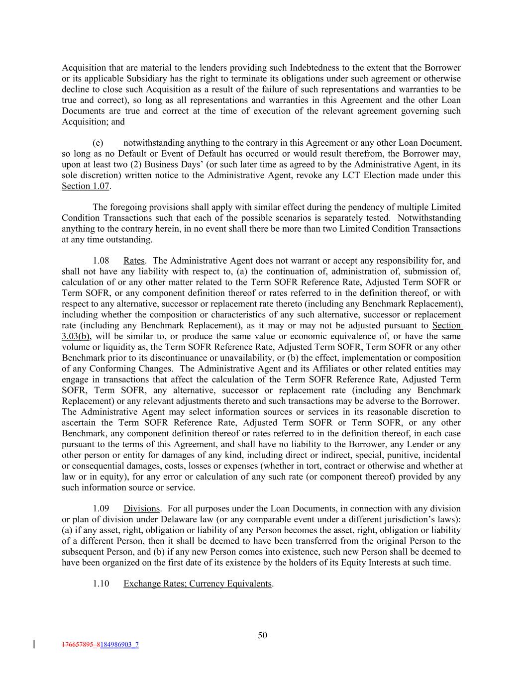 Acquisition that are material to the lenders providing such Indebtedness to the extent that the Borrower or its applicable Subsidiary has the right to terminate its obligations under such agreement or otherwise decline to close such Acquisition as a result of the failure of such representations and warranties to be true and correct), so long as all representations and warranties in this Agreement and the other Loan Documents are true and correct at the time of execution of the relevant agreement governing such Acquisition; and (e) notwithstanding anything to the contrary in this Agreement or any other Loan Document, so long as no Default or Event of Default has occurred or would result therefrom, the Borrower may, upon at least two (2) Business Days’ (or such later time as agreed to by the Administrative Agent, in its sole discretion) written notice to the Administrative Agent, revoke any LCT Election made under this Section 1.07. The foregoing provisions shall apply with similar effect during the pendency of multiple Limited Condition Transactions such that each of the possible scenarios is separately tested. Notwithstanding anything to the contrary herein, in no event shall there be more than two Limited Condition Transactions at any time outstanding. 1.08 Rates. The Administrative Agent does not warrant or accept any responsibility for, and shall not have any liability with respect to, (a) the continuation of, administration of, submission of, calculation of or any other matter related to the Term SOFR Reference Rate, Adjusted Term SOFR or Term SOFR, or any component definition thereof or rates referred to in the definition thereof, or with respect to any alternative, successor or replacement rate thereto (including any Benchmark Replacement), including whether the composition or characteristics of any such alternative, successor or replacement rate (including any Benchmark Replacement), as it may or may not be adjusted pursuant to Section 3.03(b), will be similar to, or produce the same value or economic equivalence of, or have the same volume or liquidity as, the Term SOFR Reference Rate, Adjusted Term SOFR, Term SOFR or any other Benchmark prior to its discontinuance or unavailability, or (b) the effect, implementation or composition of any Conforming Changes. The Administrative Agent and its Affiliates or other related entities may engage in transactions that affect the calculation of the Term SOFR Reference Rate, Adjusted Term SOFR, Term SOFR, any alternative, successor or replacement rate (including any Benchmark Replacement) or any relevant adjustments thereto and such transactions may be adverse to the Borrower. The Administrative Agent may select information sources or services in its reasonable discretion to ascertain the Term SOFR Reference Rate, Adjusted Term SOFR or Term SOFR, or any other Benchmark, any component definition thereof or rates referred to in the definition thereof, in each case pursuant to the terms of this Agreement, and shall have no liability to the Borrower, any Lender or any other person or entity for damages of any kind, including direct or indirect, special, punitive, incidental or consequential damages, costs, losses or expenses (whether in tort, contract or otherwise and whether at law or in equity), for any error or calculation of any such rate (or component thereof) provided by any such information source or service. 1.09 Divisions. For all purposes under the Loan Documents, in connection with any division or plan of division under Delaware law (or any comparable event under a different jurisdiction’s laws): (a) if any asset, right, obligation or liability of any Person becomes the asset, right, obligation or liability of a different Person, then it shall be deemed to have been transferred from the original Person to the subsequent Person, and (b) if any new Person comes into existence, such new Person shall be deemed to have been organized on the first date of its existence by the holders of its Equity Interests at such time. 1.10 Exchange Rates; Currency Equivalents. 50 176657895_8184986903_7