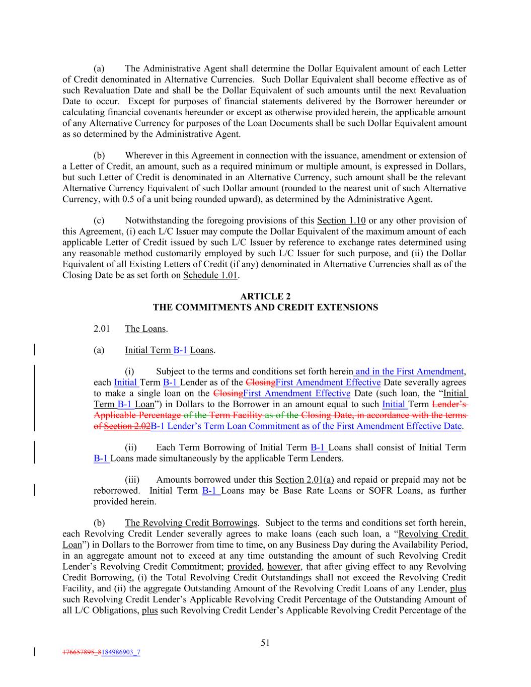 (a) The Administrative Agent shall determine the Dollar Equivalent amount of each Letter of Credit denominated in Alternative Currencies. Such Dollar Equivalent shall become effective as of such Revaluation Date and shall be the Dollar Equivalent of such amounts until the next Revaluation Date to occur. Except for purposes of financial statements delivered by the Borrower hereunder or calculating financial covenants hereunder or except as otherwise provided herein, the applicable amount of any Alternative Currency for purposes of the Loan Documents shall be such Dollar Equivalent amount as so determined by the Administrative Agent. (b) Wherever in this Agreement in connection with the issuance, amendment or extension of a Letter of Credit, an amount, such as a required minimum or multiple amount, is expressed in Dollars, but such Letter of Credit is denominated in an Alternative Currency, such amount shall be the relevant Alternative Currency Equivalent of such Dollar amount (rounded to the nearest unit of such Alternative Currency, with 0.5 of a unit being rounded upward), as determined by the Administrative Agent. (c) Notwithstanding the foregoing provisions of this Section 1.10 or any other provision of this Agreement, (i) each L/C Issuer may compute the Dollar Equivalent of the maximum amount of each applicable Letter of Credit issued by such L/C Issuer by reference to exchange rates determined using any reasonable method customarily employed by such L/C Issuer for such purpose, and (ii) the Dollar Equivalent of all Existing Letters of Credit (if any) denominated in Alternative Currencies shall as of the Closing Date be as set forth on Schedule 1.01. ARTICLE 2 THE COMMITMENTS AND CREDIT EXTENSIONS 2.01 The Loans. (a) Initial Term B-1 Loans. (i) Subject to the terms and conditions set forth herein and in the First Amendment, each Initial Term B-1 Lender as of the ClosingFirst Amendment Effective Date severally agrees to make a single loan on the ClosingFirst Amendment Effective Date (such loan, the “Initial Term B-1 Loan”) in Dollars to the Borrower in an amount equal to such Initial Term Lender’s Applicable Percentage of the Term Facility as of the Closing Date, in accordance with the terms of Section 2.02B-1 Lender’s Term Loan Commitment as of the First Amendment Effective Date. (ii) Each Term Borrowing of Initial Term B-1 Loans shall consist of Initial Term B-1 Loans made simultaneously by the applicable Term Lenders. (iii) Amounts borrowed under this Section 2.01(a) and repaid or prepaid may not be reborrowed. Initial Term B-1 Loans may be Base Rate Loans or SOFR Loans, as further provided herein. (b) The Revolving Credit Borrowings. Subject to the terms and conditions set forth herein, each Revolving Credit Lender severally agrees to make loans (each such loan, a “Revolving Credit Loan”) in Dollars to the Borrower from time to time, on any Business Day during the Availability Period, in an aggregate amount not to exceed at any time outstanding the amount of such Revolving Credit Lender’s Revolving Credit Commitment; provided, however, that after giving effect to any Revolving Credit Borrowing, (i) the Total Revolving Credit Outstandings shall not exceed the Revolving Credit Facility, and (ii) the aggregate Outstanding Amount of the Revolving Credit Loans of any Lender, plus such Revolving Credit Lender’s Applicable Revolving Credit Percentage of the Outstanding Amount of all L/C Obligations, plus such Revolving Credit Lender’s Applicable Revolving Credit Percentage of the 51 176657895_8184986903_7