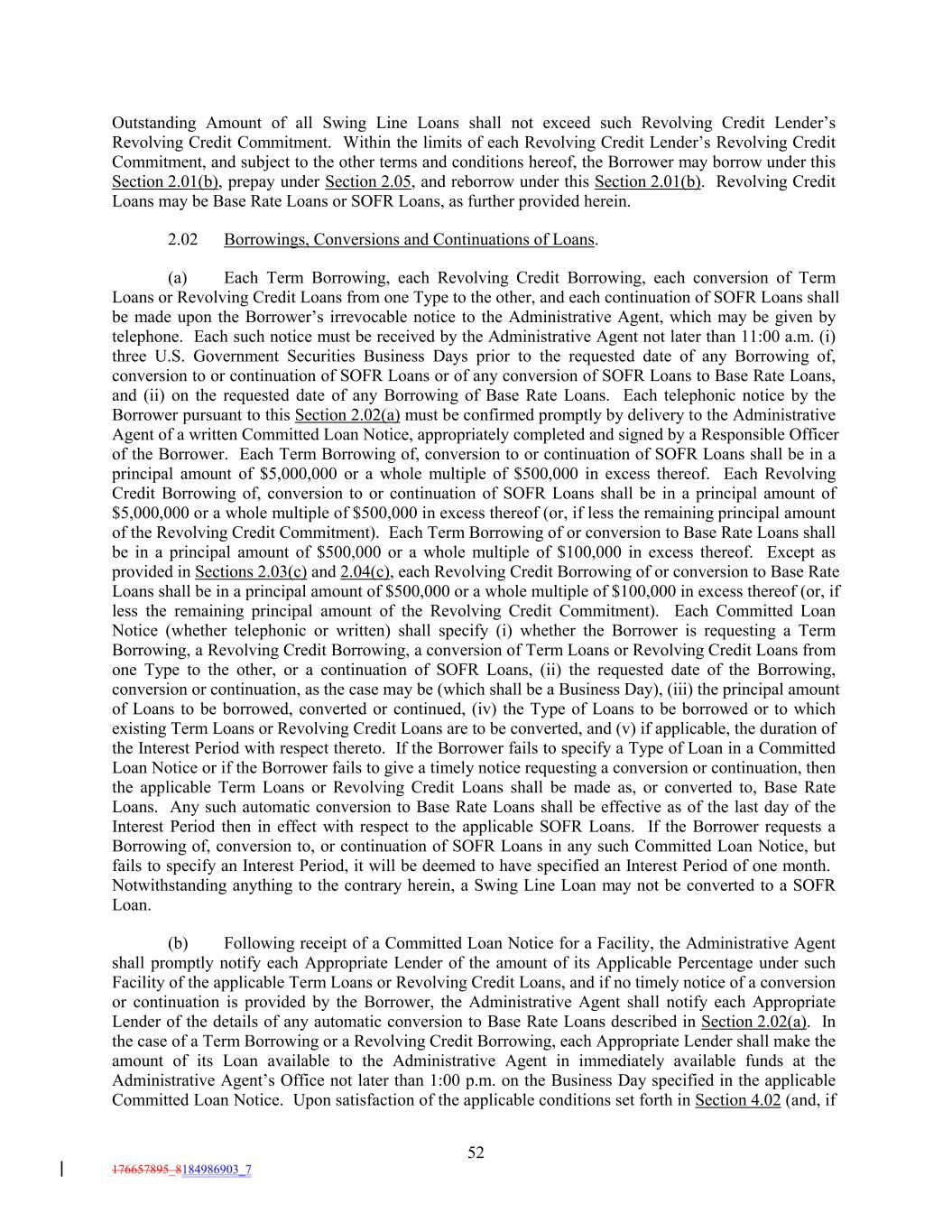 Outstanding Amount of all Swing Line Loans shall not exceed such Revolving Credit Lender’s Revolving Credit Commitment. Within the limits of each Revolving Credit Lender’s Revolving Credit Commitment, and subject to the other terms and conditions hereof, the Borrower may borrow under this Section 2.01(b), prepay under Section 2.05, and reborrow under this Section 2.01(b). Revolving Credit Loans may be Base Rate Loans or SOFR Loans, as further provided herein. 2.02 Borrowings, Conversions and Continuations of Loans. (a) Each Term Borrowing, each Revolving Credit Borrowing, each conversion of Term Loans or Revolving Credit Loans from one Type to the other, and each continuation of SOFR Loans shall be made upon the Borrower’s irrevocable notice to the Administrative Agent, which may be given by telephone. Each such notice must be received by the Administrative Agent not later than 11:00 a.m. (i) three U.S. Government Securities Business Days prior to the requested date of any Borrowing of, conversion to or continuation of SOFR Loans or of any conversion of SOFR Loans to Base Rate Loans, and (ii) on the requested date of any Borrowing of Base Rate Loans. Each telephonic notice by the Borrower pursuant to this Section 2.02(a) must be confirmed promptly by delivery to the Administrative Agent of a written Committed Loan Notice, appropriately completed and signed by a Responsible Officer of the Borrower. Each Term Borrowing of, conversion to or continuation of SOFR Loans shall be in a principal amount of $5,000,000 or a whole multiple of $500,000 in excess thereof. Each Revolving Credit Borrowing of, conversion to or continuation of SOFR Loans shall be in a principal amount of $5,000,000 or a whole multiple of $500,000 in excess thereof (or, if less the remaining principal amount of the Revolving Credit Commitment). Each Term Borrowing of or conversion to Base Rate Loans shall be in a principal amount of $500,000 or a whole multiple of $100,000 in excess thereof. Except as provided in Sections 2.03(c) and 2.04(c), each Revolving Credit Borrowing of or conversion to Base Rate Loans shall be in a principal amount of $500,000 or a whole multiple of $100,000 in excess thereof (or, if less the remaining principal amount of the Revolving Credit Commitment). Each Committed Loan Notice (whether telephonic or written) shall specify (i) whether the Borrower is requesting a Term Borrowing, a Revolving Credit Borrowing, a conversion of Term Loans or Revolving Credit Loans from one Type to the other, or a continuation of SOFR Loans, (ii) the requested date of the Borrowing, conversion or continuation, as the case may be (which shall be a Business Day), (iii) the principal amount of Loans to be borrowed, converted or continued, (iv) the Type of Loans to be borrowed or to which existing Term Loans or Revolving Credit Loans are to be converted, and (v) if applicable, the duration of the Interest Period with respect thereto. If the Borrower fails to specify a Type of Loan in a Committed Loan Notice or if the Borrower fails to give a timely notice requesting a conversion or continuation, then the applicable Term Loans or Revolving Credit Loans shall be made as, or converted to, Base Rate Loans. Any such automatic conversion to Base Rate Loans shall be effective as of the last day of the Interest Period then in effect with respect to the applicable SOFR Loans. If the Borrower requests a Borrowing of, conversion to, or continuation of SOFR Loans in any such Committed Loan Notice, but fails to specify an Interest Period, it will be deemed to have specified an Interest Period of one month. Notwithstanding anything to the contrary herein, a Swing Line Loan may not be converted to a SOFR Loan. (b) Following receipt of a Committed Loan Notice for a Facility, the Administrative Agent shall promptly notify each Appropriate Lender of the amount of its Applicable Percentage under such Facility of the applicable Term Loans or Revolving Credit Loans, and if no timely notice of a conversion or continuation is provided by the Borrower, the Administrative Agent shall notify each Appropriate Lender of the details of any automatic conversion to Base Rate Loans described in Section 2.02(a). In the case of a Term Borrowing or a Revolving Credit Borrowing, each Appropriate Lender shall make the amount of its Loan available to the Administrative Agent in immediately available funds at the Administrative Agent’s Office not later than 1:00 p.m. on the Business Day specified in the applicable Committed Loan Notice. Upon satisfaction of the applicable conditions set forth in Section 4.02 (and, if 52 176657895_8184986903_7
