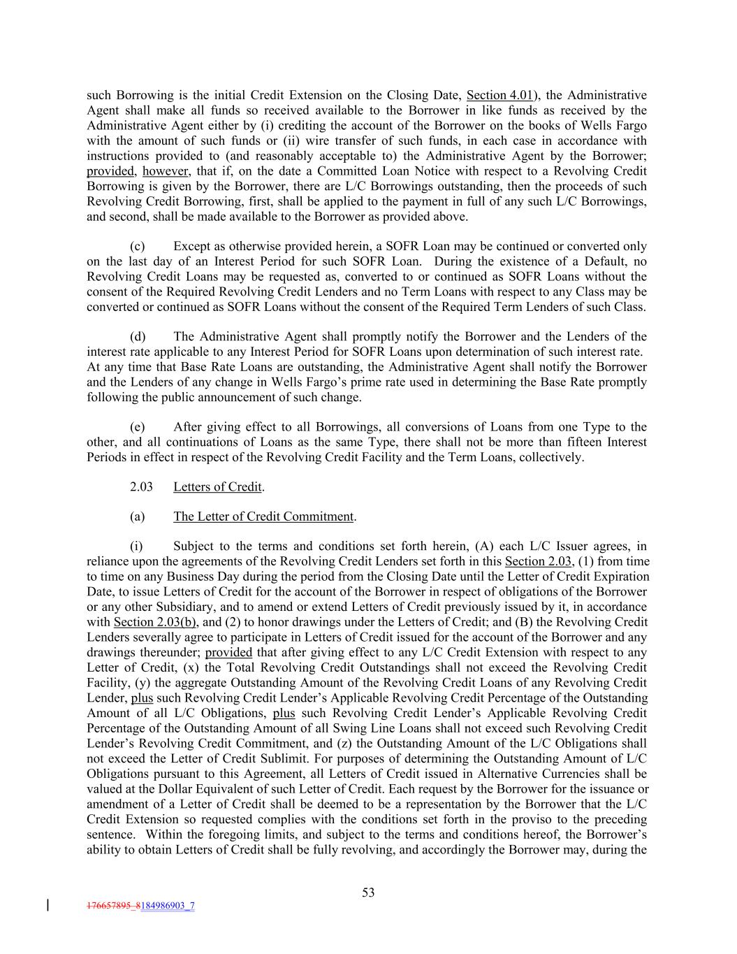 such Borrowing is the initial Credit Extension on the Closing Date, Section 4.01), the Administrative Agent shall make all funds so received available to the Borrower in like funds as received by the Administrative Agent either by (i) crediting the account of the Borrower on the books of Wells Fargo with the amount of such funds or (ii) wire transfer of such funds, in each case in accordance with instructions provided to (and reasonably acceptable to) the Administrative Agent by the Borrower; provided, however, that if, on the date a Committed Loan Notice with respect to a Revolving Credit Borrowing is given by the Borrower, there are L/C Borrowings outstanding, then the proceeds of such Revolving Credit Borrowing, first, shall be applied to the payment in full of any such L/C Borrowings, and second, shall be made available to the Borrower as provided above. (c) Except as otherwise provided herein, a SOFR Loan may be continued or converted only on the last day of an Interest Period for such SOFR Loan. During the existence of a Default, no Revolving Credit Loans may be requested as, converted to or continued as SOFR Loans without the consent of the Required Revolving Credit Lenders and no Term Loans with respect to any Class may be converted or continued as SOFR Loans without the consent of the Required Term Lenders of such Class. (d) The Administrative Agent shall promptly notify the Borrower and the Lenders of the interest rate applicable to any Interest Period for SOFR Loans upon determination of such interest rate. At any time that Base Rate Loans are outstanding, the Administrative Agent shall notify the Borrower and the Lenders of any change in Wells Fargo’s prime rate used in determining the Base Rate promptly following the public announcement of such change. (e) After giving effect to all Borrowings, all conversions of Loans from one Type to the other, and all continuations of Loans as the same Type, there shall not be more than fifteen Interest Periods in effect in respect of the Revolving Credit Facility and the Term Loans, collectively. 2.03 Letters of Credit. (a) The Letter of Credit Commitment. (i) Subject to the terms and conditions set forth herein, (A) each L/C Issuer agrees, in reliance upon the agreements of the Revolving Credit Lenders set forth in this Section 2.03, (1) from time to time on any Business Day during the period from the Closing Date until the Letter of Credit Expiration Date, to issue Letters of Credit for the account of the Borrower in respect of obligations of the Borrower or any other Subsidiary, and to amend or extend Letters of Credit previously issued by it, in accordance with Section 2.03(b), and (2) to honor drawings under the Letters of Credit; and (B) the Revolving Credit Lenders severally agree to participate in Letters of Credit issued for the account of the Borrower and any drawings thereunder; provided that after giving effect to any L/C Credit Extension with respect to any Letter of Credit, (x) the Total Revolving Credit Outstandings shall not exceed the Revolving Credit Facility, (y) the aggregate Outstanding Amount of the Revolving Credit Loans of any Revolving Credit Lender, plus such Revolving Credit Lender’s Applicable Revolving Credit Percentage of the Outstanding Amount of all L/C Obligations, plus such Revolving Credit Lender’s Applicable Revolving Credit Percentage of the Outstanding Amount of all Swing Line Loans shall not exceed such Revolving Credit Lender’s Revolving Credit Commitment, and (z) the Outstanding Amount of the L/C Obligations shall not exceed the Letter of Credit Sublimit. For purposes of determining the Outstanding Amount of L/C Obligations pursuant to this Agreement, all Letters of Credit issued in Alternative Currencies shall be valued at the Dollar Equivalent of such Letter of Credit. Each request by the Borrower for the issuance or amendment of a Letter of Credit shall be deemed to be a representation by the Borrower that the L/C Credit Extension so requested complies with the conditions set forth in the proviso to the preceding sentence. Within the foregoing limits, and subject to the terms and conditions hereof, the Borrower’s ability to obtain Letters of Credit shall be fully revolving, and accordingly the Borrower may, during the 53 176657895_8184986903_7