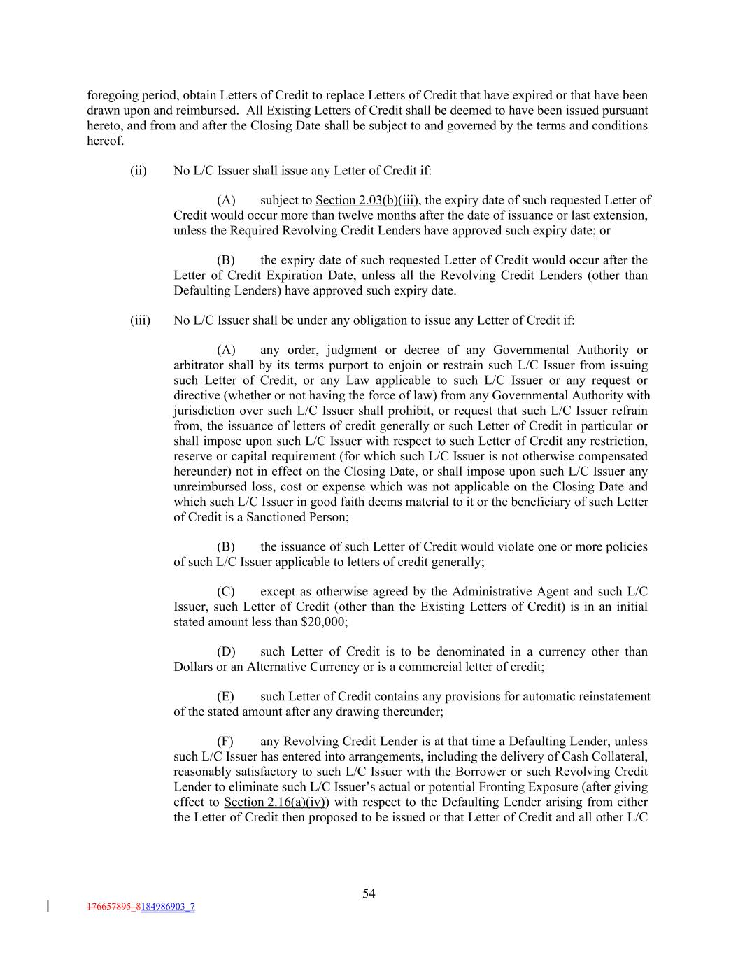 foregoing period, obtain Letters of Credit to replace Letters of Credit that have expired or that have been drawn upon and reimbursed. All Existing Letters of Credit shall be deemed to have been issued pursuant hereto, and from and after the Closing Date shall be subject to and governed by the terms and conditions hereof. (ii) No L/C Issuer shall issue any Letter of Credit if: (A) subject to Section 2.03(b)(iii), the expiry date of such requested Letter of Credit would occur more than twelve months after the date of issuance or last extension, unless the Required Revolving Credit Lenders have approved such expiry date; or (B) the expiry date of such requested Letter of Credit would occur after the Letter of Credit Expiration Date, unless all the Revolving Credit Lenders (other than Defaulting Lenders) have approved such expiry date. (iii) No L/C Issuer shall be under any obligation to issue any Letter of Credit if: (A) any order, judgment or decree of any Governmental Authority or arbitrator shall by its terms purport to enjoin or restrain such L/C Issuer from issuing such Letter of Credit, or any Law applicable to such L/C Issuer or any request or directive (whether or not having the force of law) from any Governmental Authority with jurisdiction over such L/C Issuer shall prohibit, or request that such L/C Issuer refrain from, the issuance of letters of credit generally or such Letter of Credit in particular or shall impose upon such L/C Issuer with respect to such Letter of Credit any restriction, reserve or capital requirement (for which such L/C Issuer is not otherwise compensated hereunder) not in effect on the Closing Date, or shall impose upon such L/C Issuer any unreimbursed loss, cost or expense which was not applicable on the Closing Date and which such L/C Issuer in good faith deems material to it or the beneficiary of such Letter of Credit is a Sanctioned Person; (B) the issuance of such Letter of Credit would violate one or more policies of such L/C Issuer applicable to letters of credit generally; (C) except as otherwise agreed by the Administrative Agent and such L/C Issuer, such Letter of Credit (other than the Existing Letters of Credit) is in an initial stated amount less than $20,000; (D) such Letter of Credit is to be denominated in a currency other than Dollars or an Alternative Currency or is a commercial letter of credit; (E) such Letter of Credit contains any provisions for automatic reinstatement of the stated amount after any drawing thereunder; (F) any Revolving Credit Lender is at that time a Defaulting Lender, unless such L/C Issuer has entered into arrangements, including the delivery of Cash Collateral, reasonably satisfactory to such L/C Issuer with the Borrower or such Revolving Credit Lender to eliminate such L/C Issuer’s actual or potential Fronting Exposure (after giving effect to Section 2.16(a)(iv)) with respect to the Defaulting Lender arising from either the Letter of Credit then proposed to be issued or that Letter of Credit and all other L/C 54 176657895_8184986903_7