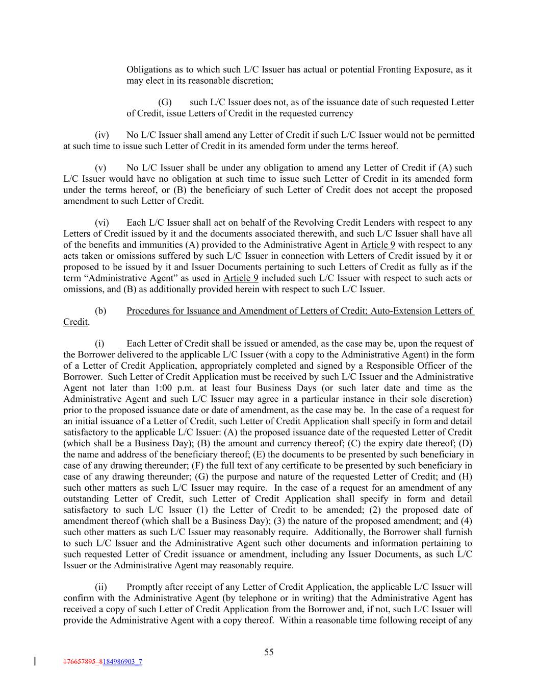 Obligations as to which such L/C Issuer has actual or potential Fronting Exposure, as it may elect in its reasonable discretion; (G) such L/C Issuer does not, as of the issuance date of such requested Letter of Credit, issue Letters of Credit in the requested currency (iv) No L/C Issuer shall amend any Letter of Credit if such L/C Issuer would not be permitted at such time to issue such Letter of Credit in its amended form under the terms hereof. (v) No L/C Issuer shall be under any obligation to amend any Letter of Credit if (A) such L/C Issuer would have no obligation at such time to issue such Letter of Credit in its amended form under the terms hereof, or (B) the beneficiary of such Letter of Credit does not accept the proposed amendment to such Letter of Credit. (vi) Each L/C Issuer shall act on behalf of the Revolving Credit Lenders with respect to any Letters of Credit issued by it and the documents associated therewith, and such L/C Issuer shall have all of the benefits and immunities (A) provided to the Administrative Agent in Article 9 with respect to any acts taken or omissions suffered by such L/C Issuer in connection with Letters of Credit issued by it or proposed to be issued by it and Issuer Documents pertaining to such Letters of Credit as fully as if the term “Administrative Agent” as used in Article 9 included such L/C Issuer with respect to such acts or omissions, and (B) as additionally provided herein with respect to such L/C Issuer. (b) Procedures for Issuance and Amendment of Letters of Credit; Auto-Extension Letters of Credit. (i) Each Letter of Credit shall be issued or amended, as the case may be, upon the request of the Borrower delivered to the applicable L/C Issuer (with a copy to the Administrative Agent) in the form of a Letter of Credit Application, appropriately completed and signed by a Responsible Officer of the Borrower. Such Letter of Credit Application must be received by such L/C Issuer and the Administrative Agent not later than 1:00 p.m. at least four Business Days (or such later date and time as the Administrative Agent and such L/C Issuer may agree in a particular instance in their sole discretion) prior to the proposed issuance date or date of amendment, as the case may be. In the case of a request for an initial issuance of a Letter of Credit, such Letter of Credit Application shall specify in form and detail satisfactory to the applicable L/C Issuer: (A) the proposed issuance date of the requested Letter of Credit (which shall be a Business Day); (B) the amount and currency thereof; (C) the expiry date thereof; (D) the name and address of the beneficiary thereof; (E) the documents to be presented by such beneficiary in case of any drawing thereunder; (F) the full text of any certificate to be presented by such beneficiary in case of any drawing thereunder; (G) the purpose and nature of the requested Letter of Credit; and (H) such other matters as such L/C Issuer may require. In the case of a request for an amendment of any outstanding Letter of Credit, such Letter of Credit Application shall specify in form and detail satisfactory to such L/C Issuer (1) the Letter of Credit to be amended; (2) the proposed date of amendment thereof (which shall be a Business Day); (3) the nature of the proposed amendment; and (4) such other matters as such L/C Issuer may reasonably require. Additionally, the Borrower shall furnish to such L/C Issuer and the Administrative Agent such other documents and information pertaining to such requested Letter of Credit issuance or amendment, including any Issuer Documents, as such L/C Issuer or the Administrative Agent may reasonably require. (ii) Promptly after receipt of any Letter of Credit Application, the applicable L/C Issuer will confirm with the Administrative Agent (by telephone or in writing) that the Administrative Agent has received a copy of such Letter of Credit Application from the Borrower and, if not, such L/C Issuer will provide the Administrative Agent with a copy thereof. Within a reasonable time following receipt of any 55 176657895_8184986903_7