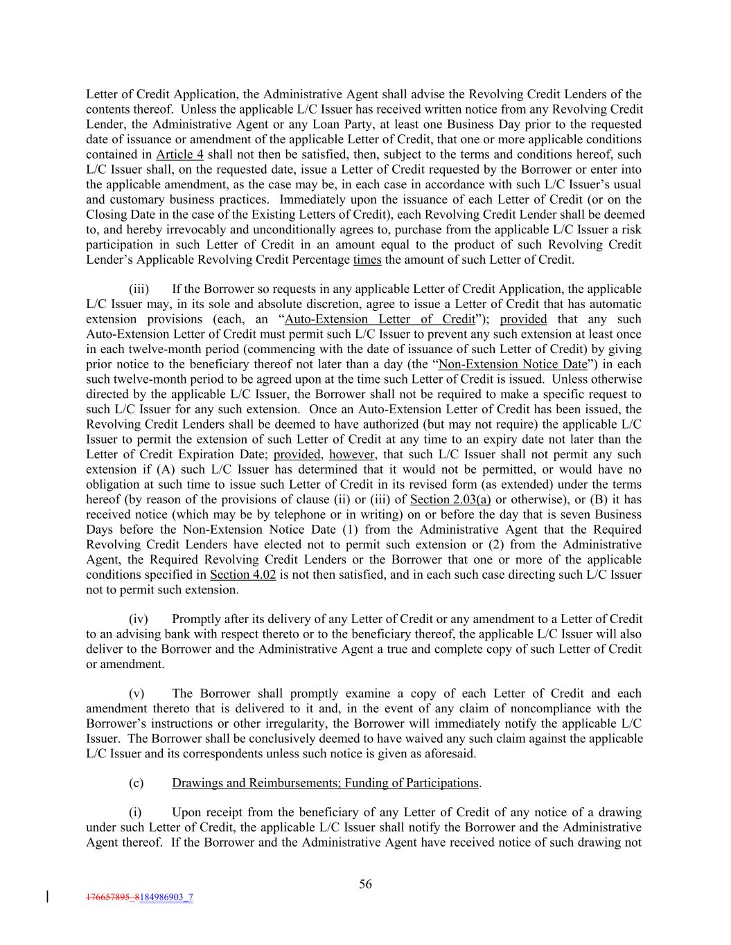 Letter of Credit Application, the Administrative Agent shall advise the Revolving Credit Lenders of the contents thereof. Unless the applicable L/C Issuer has received written notice from any Revolving Credit Lender, the Administrative Agent or any Loan Party, at least one Business Day prior to the requested date of issuance or amendment of the applicable Letter of Credit, that one or more applicable conditions contained in Article 4 shall not then be satisfied, then, subject to the terms and conditions hereof, such L/C Issuer shall, on the requested date, issue a Letter of Credit requested by the Borrower or enter into the applicable amendment, as the case may be, in each case in accordance with such L/C Issuer’s usual and customary business practices. Immediately upon the issuance of each Letter of Credit (or on the Closing Date in the case of the Existing Letters of Credit), each Revolving Credit Lender shall be deemed to, and hereby irrevocably and unconditionally agrees to, purchase from the applicable L/C Issuer a risk participation in such Letter of Credit in an amount equal to the product of such Revolving Credit Lender’s Applicable Revolving Credit Percentage times the amount of such Letter of Credit. (iii) If the Borrower so requests in any applicable Letter of Credit Application, the applicable L/C Issuer may, in its sole and absolute discretion, agree to issue a Letter of Credit that has automatic extension provisions (each, an “Auto-Extension Letter of Credit”); provided that any such Auto-Extension Letter of Credit must permit such L/C Issuer to prevent any such extension at least once in each twelve-month period (commencing with the date of issuance of such Letter of Credit) by giving prior notice to the beneficiary thereof not later than a day (the “Non-Extension Notice Date”) in each such twelve-month period to be agreed upon at the time such Letter of Credit is issued. Unless otherwise directed by the applicable L/C Issuer, the Borrower shall not be required to make a specific request to such L/C Issuer for any such extension. Once an Auto-Extension Letter of Credit has been issued, the Revolving Credit Lenders shall be deemed to have authorized (but may not require) the applicable L/C Issuer to permit the extension of such Letter of Credit at any time to an expiry date not later than the Letter of Credit Expiration Date; provided, however, that such L/C Issuer shall not permit any such extension if (A) such L/C Issuer has determined that it would not be permitted, or would have no obligation at such time to issue such Letter of Credit in its revised form (as extended) under the terms hereof (by reason of the provisions of clause (ii) or (iii) of Section 2.03(a) or otherwise), or (B) it has received notice (which may be by telephone or in writing) on or before the day that is seven Business Days before the Non-Extension Notice Date (1) from the Administrative Agent that the Required Revolving Credit Lenders have elected not to permit such extension or (2) from the Administrative Agent, the Required Revolving Credit Lenders or the Borrower that one or more of the applicable conditions specified in Section 4.02 is not then satisfied, and in each such case directing such L/C Issuer not to permit such extension. (iv) Promptly after its delivery of any Letter of Credit or any amendment to a Letter of Credit to an advising bank with respect thereto or to the beneficiary thereof, the applicable L/C Issuer will also deliver to the Borrower and the Administrative Agent a true and complete copy of such Letter of Credit or amendment. (v) The Borrower shall promptly examine a copy of each Letter of Credit and each amendment thereto that is delivered to it and, in the event of any claim of noncompliance with the Borrower’s instructions or other irregularity, the Borrower will immediately notify the applicable L/C Issuer. The Borrower shall be conclusively deemed to have waived any such claim against the applicable L/C Issuer and its correspondents unless such notice is given as aforesaid. (c) Drawings and Reimbursements; Funding of Participations. (i) Upon receipt from the beneficiary of any Letter of Credit of any notice of a drawing under such Letter of Credit, the applicable L/C Issuer shall notify the Borrower and the Administrative Agent thereof. If the Borrower and the Administrative Agent have received notice of such drawing not 56 176657895_8184986903_7