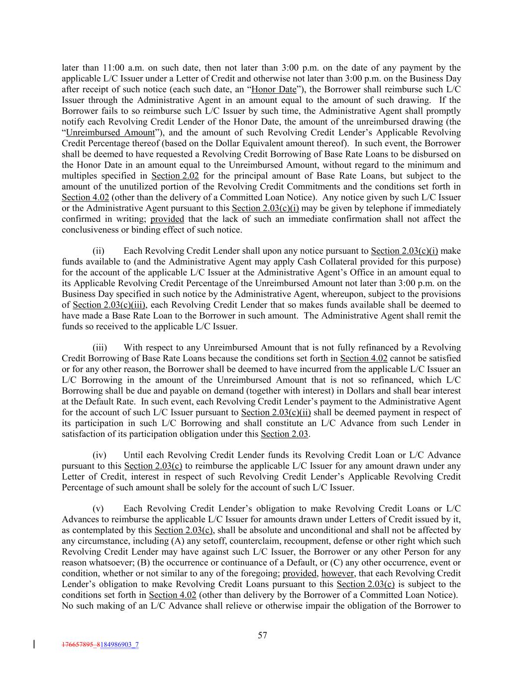 later than 11:00 a.m. on such date, then not later than 3:00 p.m. on the date of any payment by the applicable L/C Issuer under a Letter of Credit and otherwise not later than 3:00 p.m. on the Business Day after receipt of such notice (each such date, an “Honor Date”), the Borrower shall reimburse such L/C Issuer through the Administrative Agent in an amount equal to the amount of such drawing. If the Borrower fails to so reimburse such L/C Issuer by such time, the Administrative Agent shall promptly notify each Revolving Credit Lender of the Honor Date, the amount of the unreimbursed drawing (the “Unreimbursed Amount”), and the amount of such Revolving Credit Lender’s Applicable Revolving Credit Percentage thereof (based on the Dollar Equivalent amount thereof). In such event, the Borrower shall be deemed to have requested a Revolving Credit Borrowing of Base Rate Loans to be disbursed on the Honor Date in an amount equal to the Unreimbursed Amount, without regard to the minimum and multiples specified in Section 2.02 for the principal amount of Base Rate Loans, but subject to the amount of the unutilized portion of the Revolving Credit Commitments and the conditions set forth in Section 4.02 (other than the delivery of a Committed Loan Notice). Any notice given by such L/C Issuer or the Administrative Agent pursuant to this Section 2.03(c)(i) may be given by telephone if immediately confirmed in writing; provided that the lack of such an immediate confirmation shall not affect the conclusiveness or binding effect of such notice. (ii) Each Revolving Credit Lender shall upon any notice pursuant to Section 2.03(c)(i) make funds available to (and the Administrative Agent may apply Cash Collateral provided for this purpose) for the account of the applicable L/C Issuer at the Administrative Agent’s Office in an amount equal to its Applicable Revolving Credit Percentage of the Unreimbursed Amount not later than 3:00 p.m. on the Business Day specified in such notice by the Administrative Agent, whereupon, subject to the provisions of Section 2.03(c)(iii), each Revolving Credit Lender that so makes funds available shall be deemed to have made a Base Rate Loan to the Borrower in such amount. The Administrative Agent shall remit the funds so received to the applicable L/C Issuer. (iii) With respect to any Unreimbursed Amount that is not fully refinanced by a Revolving Credit Borrowing of Base Rate Loans because the conditions set forth in Section 4.02 cannot be satisfied or for any other reason, the Borrower shall be deemed to have incurred from the applicable L/C Issuer an L/C Borrowing in the amount of the Unreimbursed Amount that is not so refinanced, which L/C Borrowing shall be due and payable on demand (together with interest) in Dollars and shall bear interest at the Default Rate. In such event, each Revolving Credit Lender’s payment to the Administrative Agent for the account of such L/C Issuer pursuant to Section 2.03(c)(ii) shall be deemed payment in respect of its participation in such L/C Borrowing and shall constitute an L/C Advance from such Lender in satisfaction of its participation obligation under this Section 2.03. (iv) Until each Revolving Credit Lender funds its Revolving Credit Loan or L/C Advance pursuant to this Section 2.03(c) to reimburse the applicable L/C Issuer for any amount drawn under any Letter of Credit, interest in respect of such Revolving Credit Lender’s Applicable Revolving Credit Percentage of such amount shall be solely for the account of such L/C Issuer. (v) Each Revolving Credit Lender’s obligation to make Revolving Credit Loans or L/C Advances to reimburse the applicable L/C Issuer for amounts drawn under Letters of Credit issued by it, as contemplated by this Section 2.03(c), shall be absolute and unconditional and shall not be affected by any circumstance, including (A) any setoff, counterclaim, recoupment, defense or other right which such Revolving Credit Lender may have against such L/C Issuer, the Borrower or any other Person for any reason whatsoever; (B) the occurrence or continuance of a Default, or (C) any other occurrence, event or condition, whether or not similar to any of the foregoing; provided, however, that each Revolving Credit Lender’s obligation to make Revolving Credit Loans pursuant to this Section 2.03(c) is subject to the conditions set forth in Section 4.02 (other than delivery by the Borrower of a Committed Loan Notice). No such making of an L/C Advance shall relieve or otherwise impair the obligation of the Borrower to 57 176657895_8184986903_7