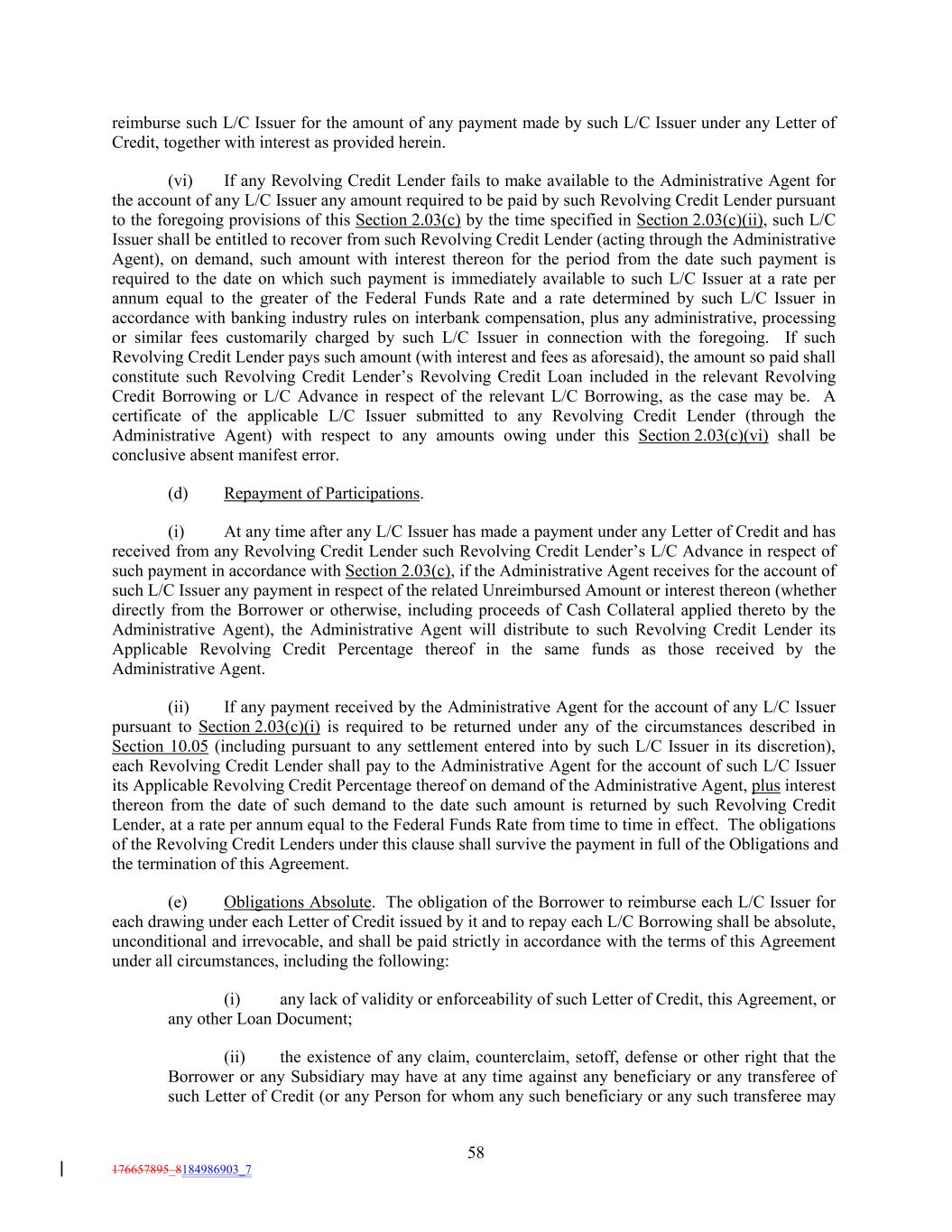 reimburse such L/C Issuer for the amount of any payment made by such L/C Issuer under any Letter of Credit, together with interest as provided herein. (vi) If any Revolving Credit Lender fails to make available to the Administrative Agent for the account of any L/C Issuer any amount required to be paid by such Revolving Credit Lender pursuant to the foregoing provisions of this Section 2.03(c) by the time specified in Section 2.03(c)(ii), such L/C Issuer shall be entitled to recover from such Revolving Credit Lender (acting through the Administrative Agent), on demand, such amount with interest thereon for the period from the date such payment is required to the date on which such payment is immediately available to such L/C Issuer at a rate per annum equal to the greater of the Federal Funds Rate and a rate determined by such L/C Issuer in accordance with banking industry rules on interbank compensation, plus any administrative, processing or similar fees customarily charged by such L/C Issuer in connection with the foregoing. If such Revolving Credit Lender pays such amount (with interest and fees as aforesaid), the amount so paid shall constitute such Revolving Credit Lender’s Revolving Credit Loan included in the relevant Revolving Credit Borrowing or L/C Advance in respect of the relevant L/C Borrowing, as the case may be. A certificate of the applicable L/C Issuer submitted to any Revolving Credit Lender (through the Administrative Agent) with respect to any amounts owing under this Section 2.03(c)(vi) shall be conclusive absent manifest error. (d) Repayment of Participations. (i) At any time after any L/C Issuer has made a payment under any Letter of Credit and has received from any Revolving Credit Lender such Revolving Credit Lender’s L/C Advance in respect of such payment in accordance with Section 2.03(c), if the Administrative Agent receives for the account of such L/C Issuer any payment in respect of the related Unreimbursed Amount or interest thereon (whether directly from the Borrower or otherwise, including proceeds of Cash Collateral applied thereto by the Administrative Agent), the Administrative Agent will distribute to such Revolving Credit Lender its Applicable Revolving Credit Percentage thereof in the same funds as those received by the Administrative Agent. (ii) If any payment received by the Administrative Agent for the account of any L/C Issuer pursuant to Section 2.03(c)(i) is required to be returned under any of the circumstances described in Section 10.05 (including pursuant to any settlement entered into by such L/C Issuer in its discretion), each Revolving Credit Lender shall pay to the Administrative Agent for the account of such L/C Issuer its Applicable Revolving Credit Percentage thereof on demand of the Administrative Agent, plus interest thereon from the date of such demand to the date such amount is returned by such Revolving Credit Lender, at a rate per annum equal to the Federal Funds Rate from time to time in effect. The obligations of the Revolving Credit Lenders under this clause shall survive the payment in full of the Obligations and the termination of this Agreement. (e) Obligations Absolute. The obligation of the Borrower to reimburse each L/C Issuer for each drawing under each Letter of Credit issued by it and to repay each L/C Borrowing shall be absolute, unconditional and irrevocable, and shall be paid strictly in accordance with the terms of this Agreement under all circumstances, including the following: (i) any lack of validity or enforceability of such Letter of Credit, this Agreement, or any other Loan Document; (ii) the existence of any claim, counterclaim, setoff, defense or other right that the Borrower or any Subsidiary may have at any time against any beneficiary or any transferee of such Letter of Credit (or any Person for whom any such beneficiary or any such transferee may 58 176657895_8184986903_7